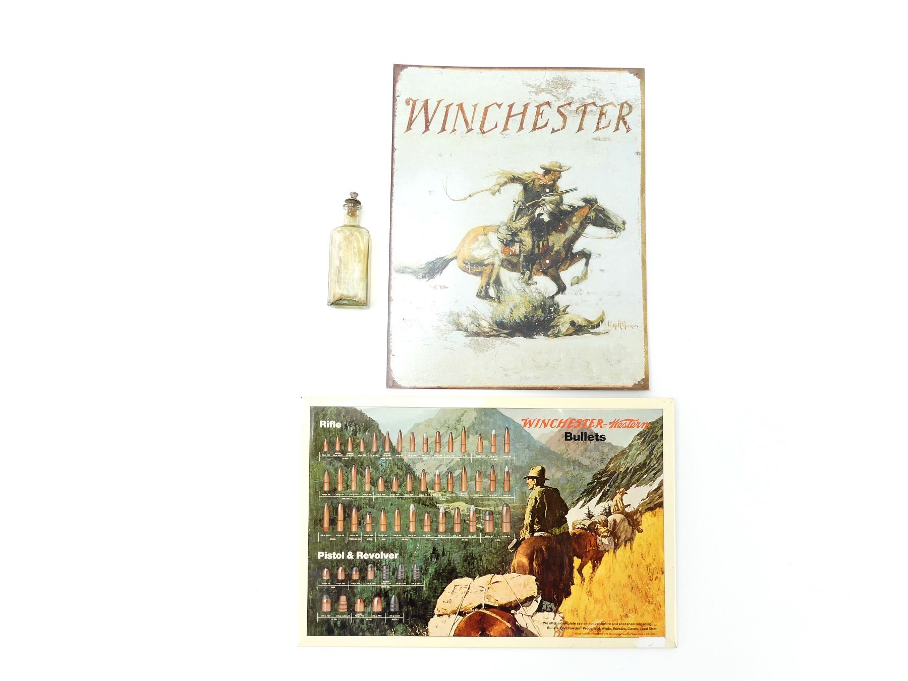 LOT INCLUDES; (1) METAL "WINCHESTER" SIGN WITH HORSE & RIDER, APPROX. 16" X 12.5", (1) METAL "WINCHESTER - WESTERN BULLETS" SIGN, WITH VARIOUS BULLET CALIBERS, APPROX. 11 5/8" X 17 5/8" & (1) ANTIQUE GLASS WINCHESTER GUN OIL BOTTLE WITH CORK / METAL CAP, BOTTLE MARKED: "WINCHESTER", CAP MARKED: "W.F. YOUNG, SPRINGFIELD, MASS.", OAL APPROX. 5 5/8". SEE PHOTOS.