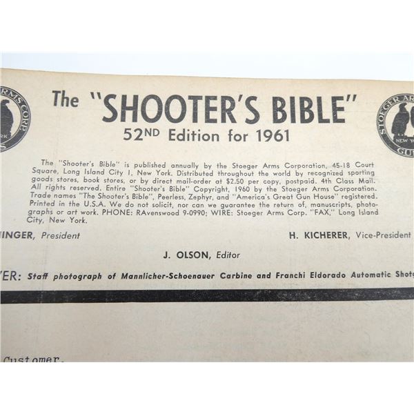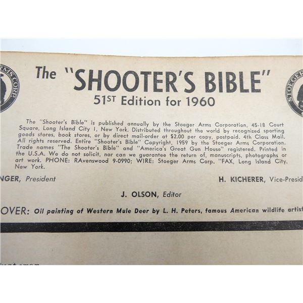 LOT INCLUDES; (1) "THE SHOOTER'S BIBLE" BOOK, 51ST 1960 EDITION, SOFT COVER, COPYRIGHT 1959 & (1) "SHOOTER'S BIBLE" BOOK, NO. 52 1961 GIANT EDITION, SOFT COVER, COPYRIGHT 1960. SEE PHOTOS.