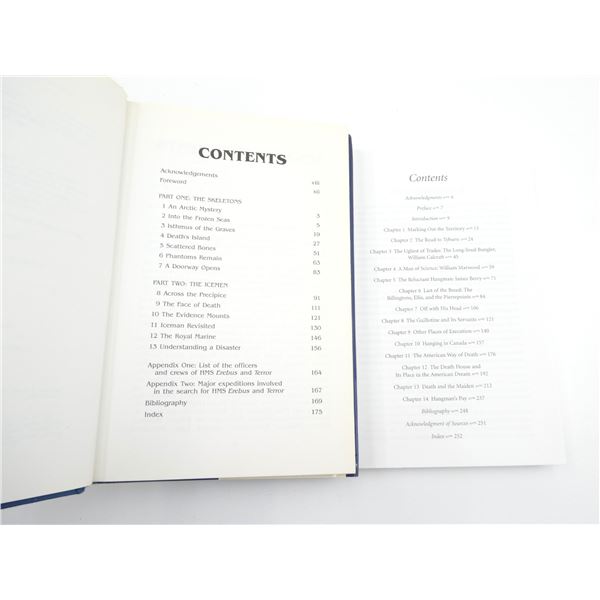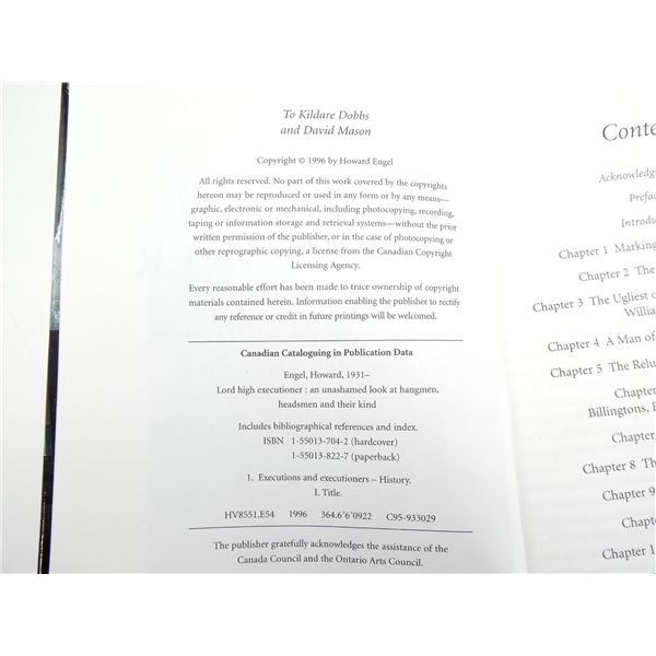 LOT INCLUDES; (1) "CARE AND REPAIR OF MUZZLE LOADERS, BOOK 3, THE MUZZLE LOADER'S LITTLE LIBRARY" BOOK BY R.O. ACKERMAN, SOFT COVER, (1) "RCMP QUARTERLY, APRIL 1974" BOOKLET, SOFT COVER, (1) "LORD HIGH EXECUTIONER, AN UNASHAMED LOOK AT HANGMEN, HEADSMEN, AND THEIR KIND" BOOK BY HOWARD ENGEL, SOFT COVER, ISBN: 1-55013-822-7, (1) "FROZEN IN TIME, UNLOCKING THE SECRETS OF THE FRANKLIN EXPEDITION" BOOK BY OWEN BEATTIE & JOHN GEIGER, HARD COVER WITH DUST COVER, ISBN: 0-88833-253-X, ETC. SEE PHOTOS.
