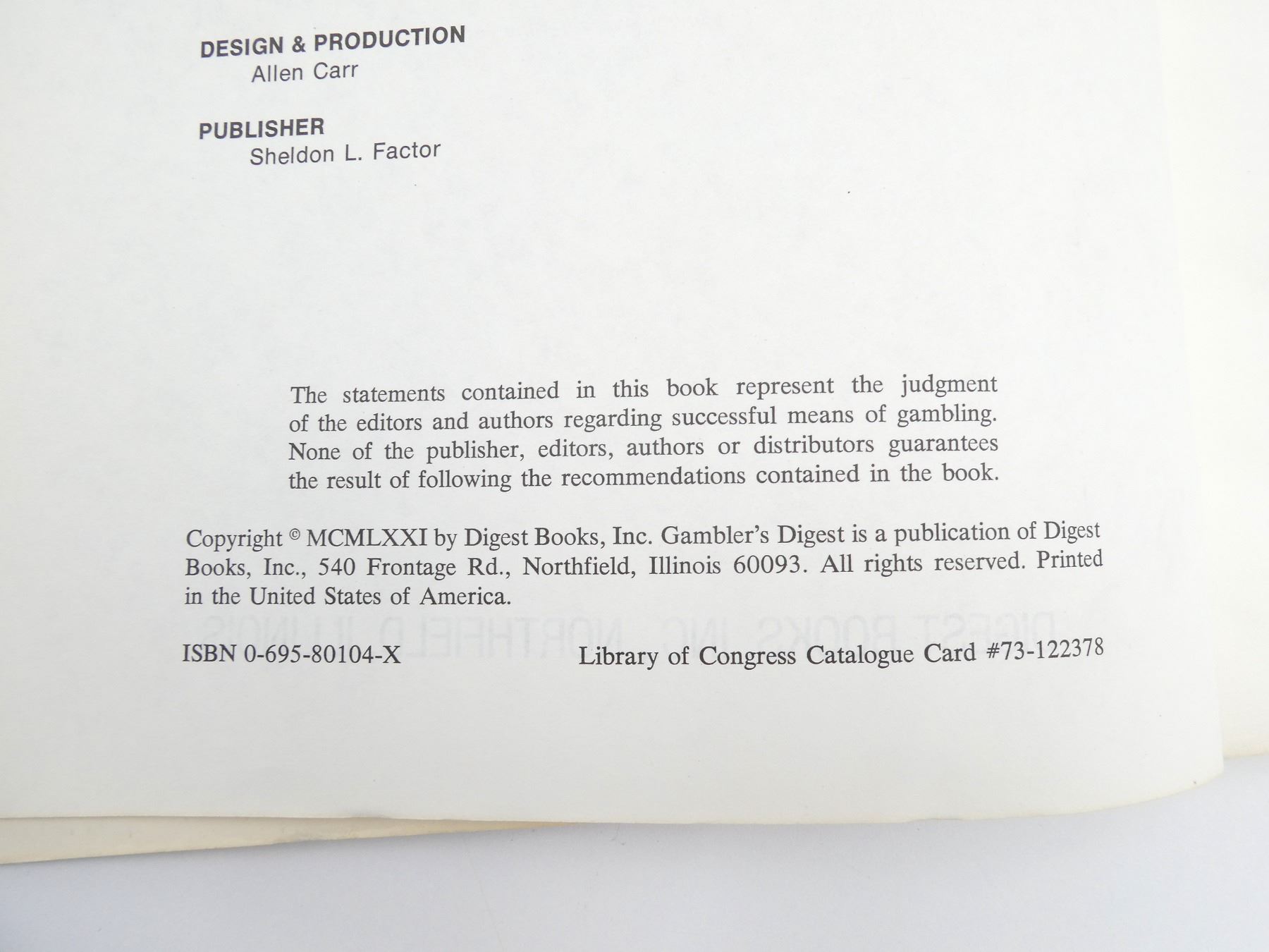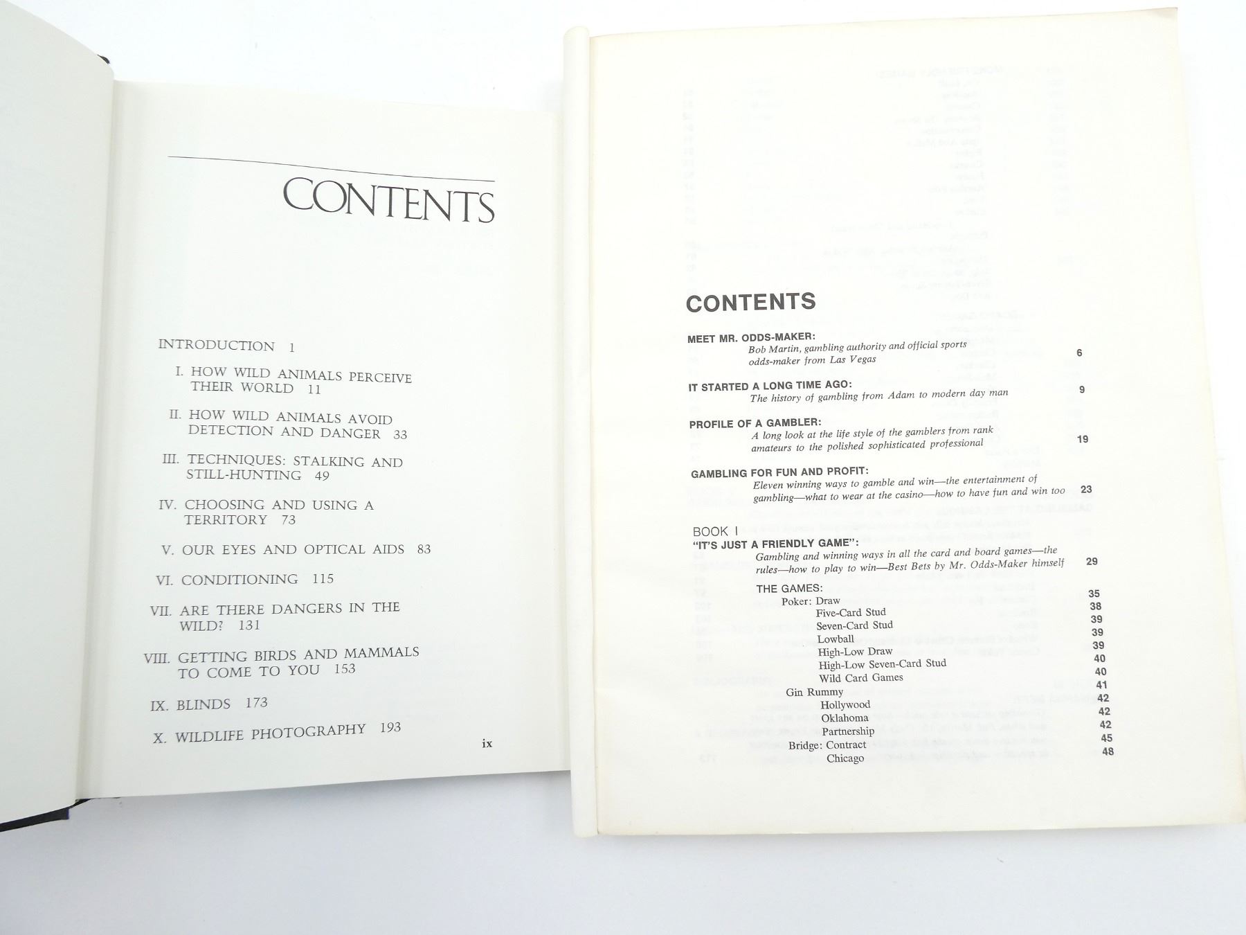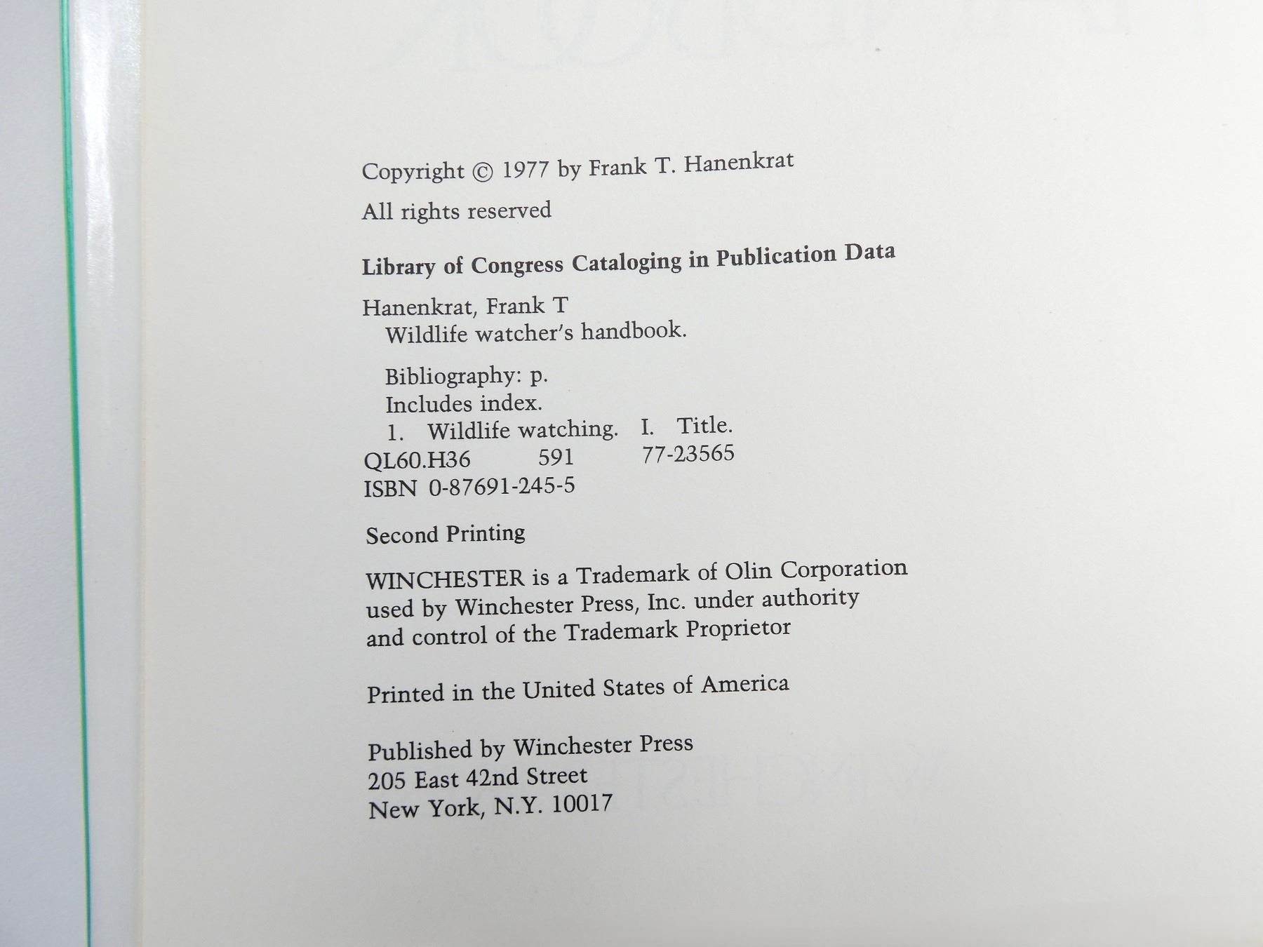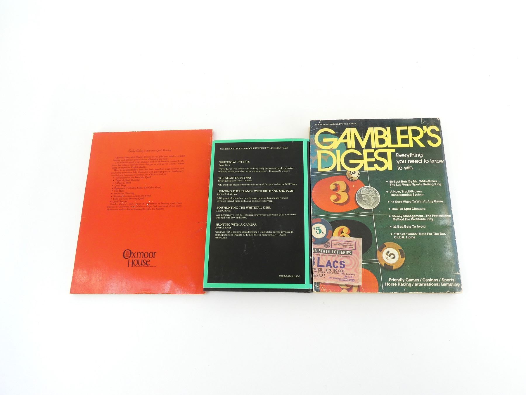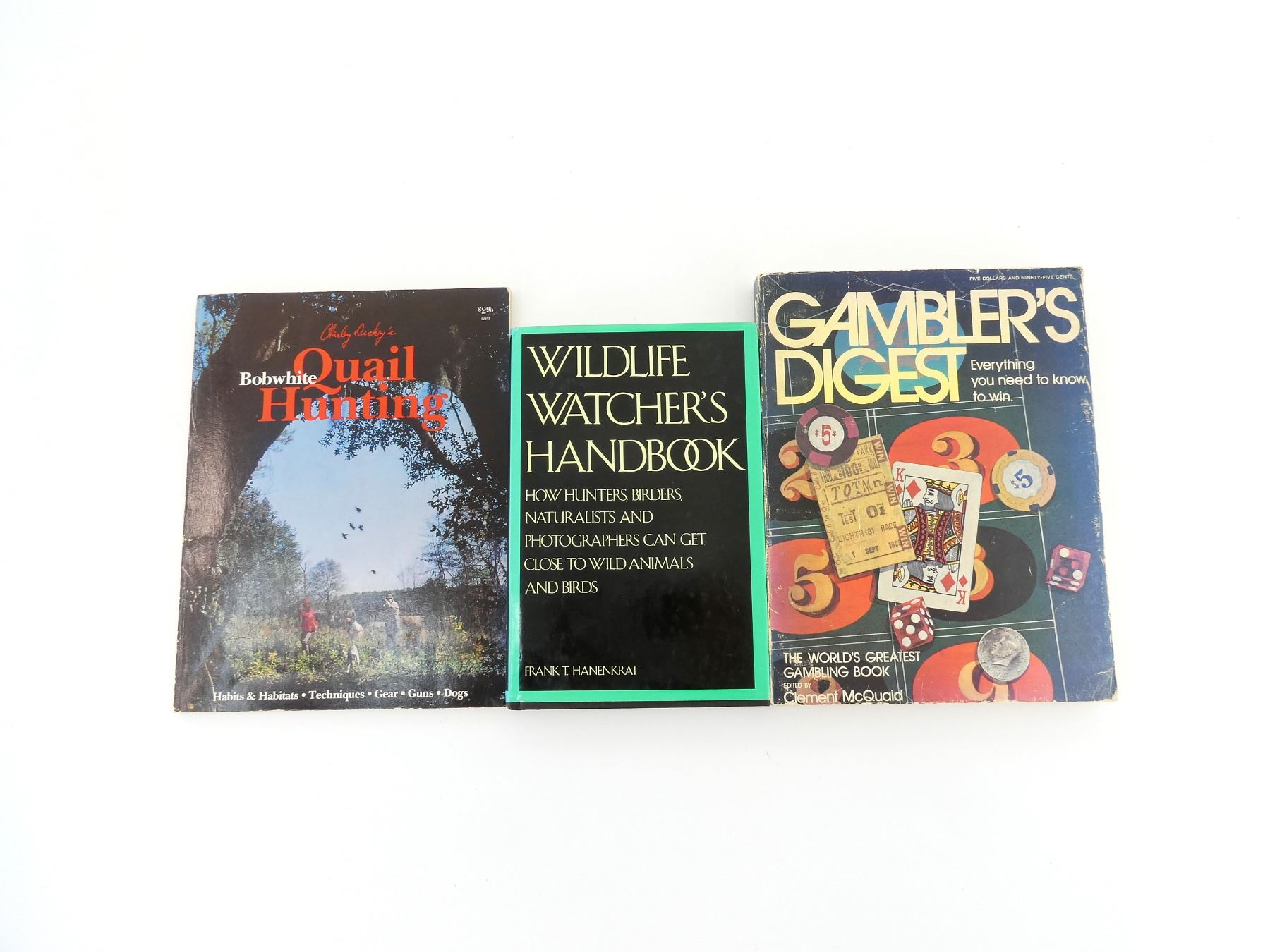 LOT INCLUDES; (1) "WILDLIFE WATCHER'S HANDBOOK" BY FRANK T. HANENKRAT, HARD COVER WITH DUST COVER, ISBN: 0-87691-245-5, (1) "BOBWHITE QUAIL HUNTING" BOOK BY CHARLEY DICKEY, SOFT COVER, FIRST PRINT, COPYRIGHT 1974 & (1) "GAMBLER'S DIGEST, EVERYTHING YOU NEED TO KNOW TO WIN" BOOK EDITED BY CLEMENT MCQUAID, SOFT COVER, ISBN: 0-695-80104-X. SEE PHOTOS.