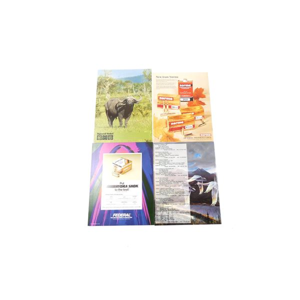 SOFT COVERS, LOT INCLUDES; (1) "FIOCCHI OF AMERICA" CATALOGUE, (1) "NORMA AMMUNITION AND COMPONENTS, TECHNICAL INFORMATION" CATALOGUE, (1) "FEDERAL'S NEW PREMIUM HYDRA SHOK AMMUNITION" CATALOGUE, COPYRIGHT 1988 & (1) "AMMUNITION CATALOGUE" CATALOGUE. SEE PHOTOS.