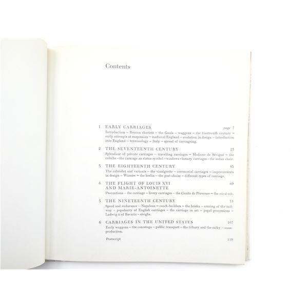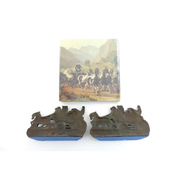 LOT INCLUDES; "CARRIAGES" BOOK BY JACQUES DAMASE, HARD COVER WITH DUST COVER, COPYRIGHT 1968 & (1) METAL CARRIAGE BOOKEND SET, APPROX. 6.5" x 4.25". SEE PHOTOS.