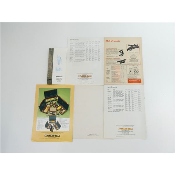 SOFT COVERS, LOT INCLUDES; (1) "QUALITY SHOOTING ACCESSORIES SINCE 1880" BROCHURE, (2) "PARKER HALE HIGH PERFORMANCE HUNTING RIFLES" BROCHURES, (1) "PARKER HALE SAFARI AND 303 SPORTERS" CATALOGUE, (1) "PARKER HALE SPORTING RIFLES" CATALOGUE & (1) PARKER HALE QUALITY SHOOTING ACCESSORIES" BROCHURE. SEE PHOTOS.