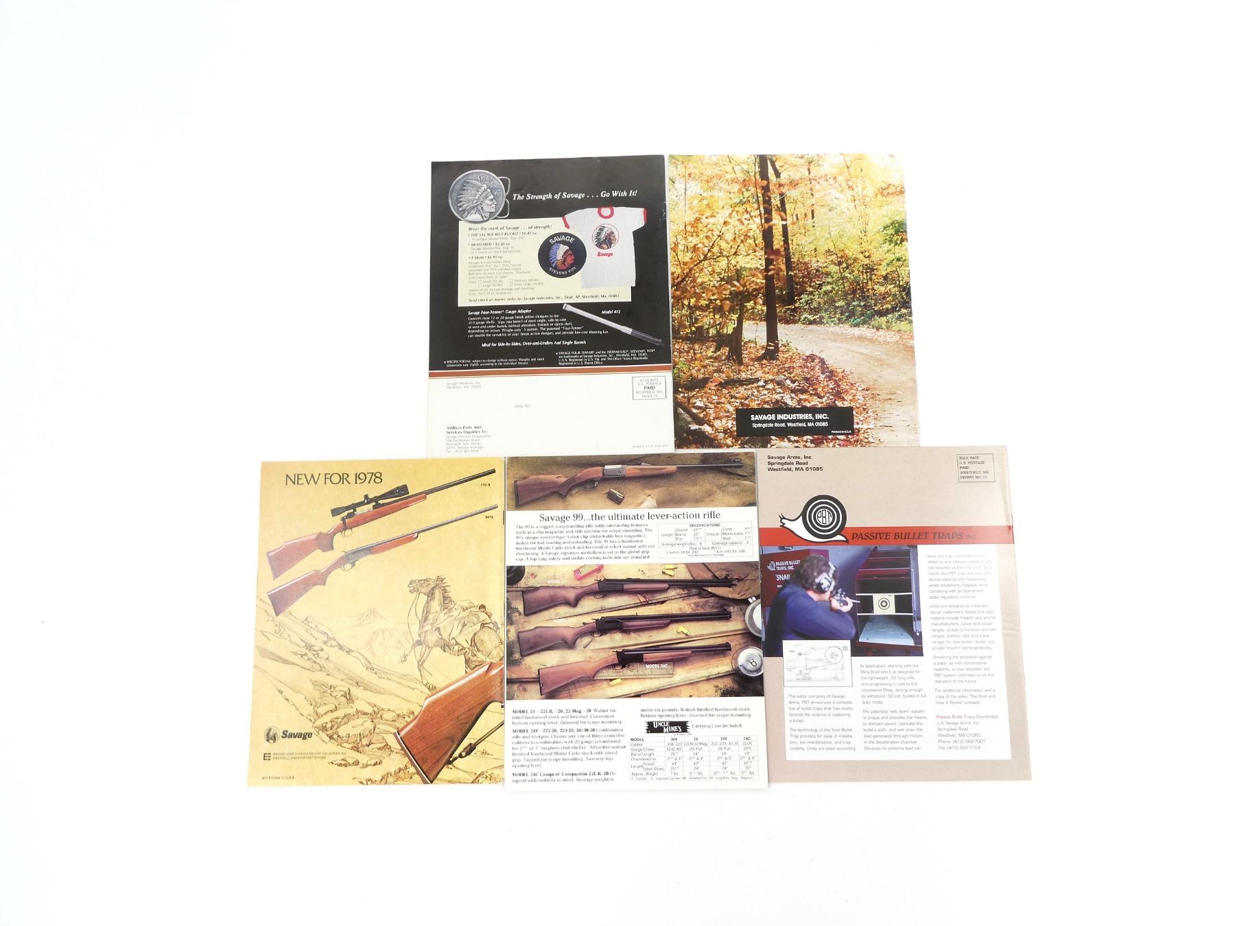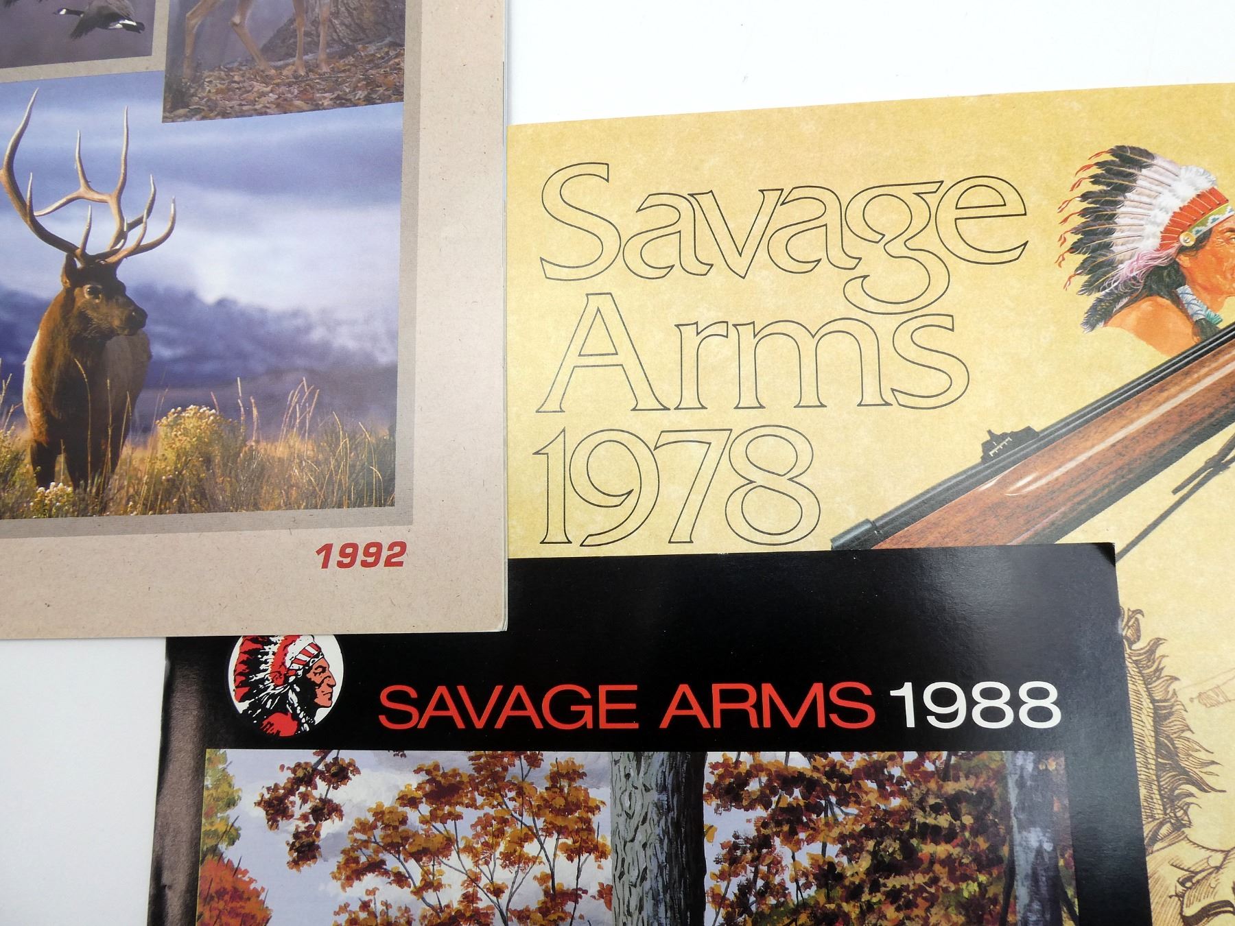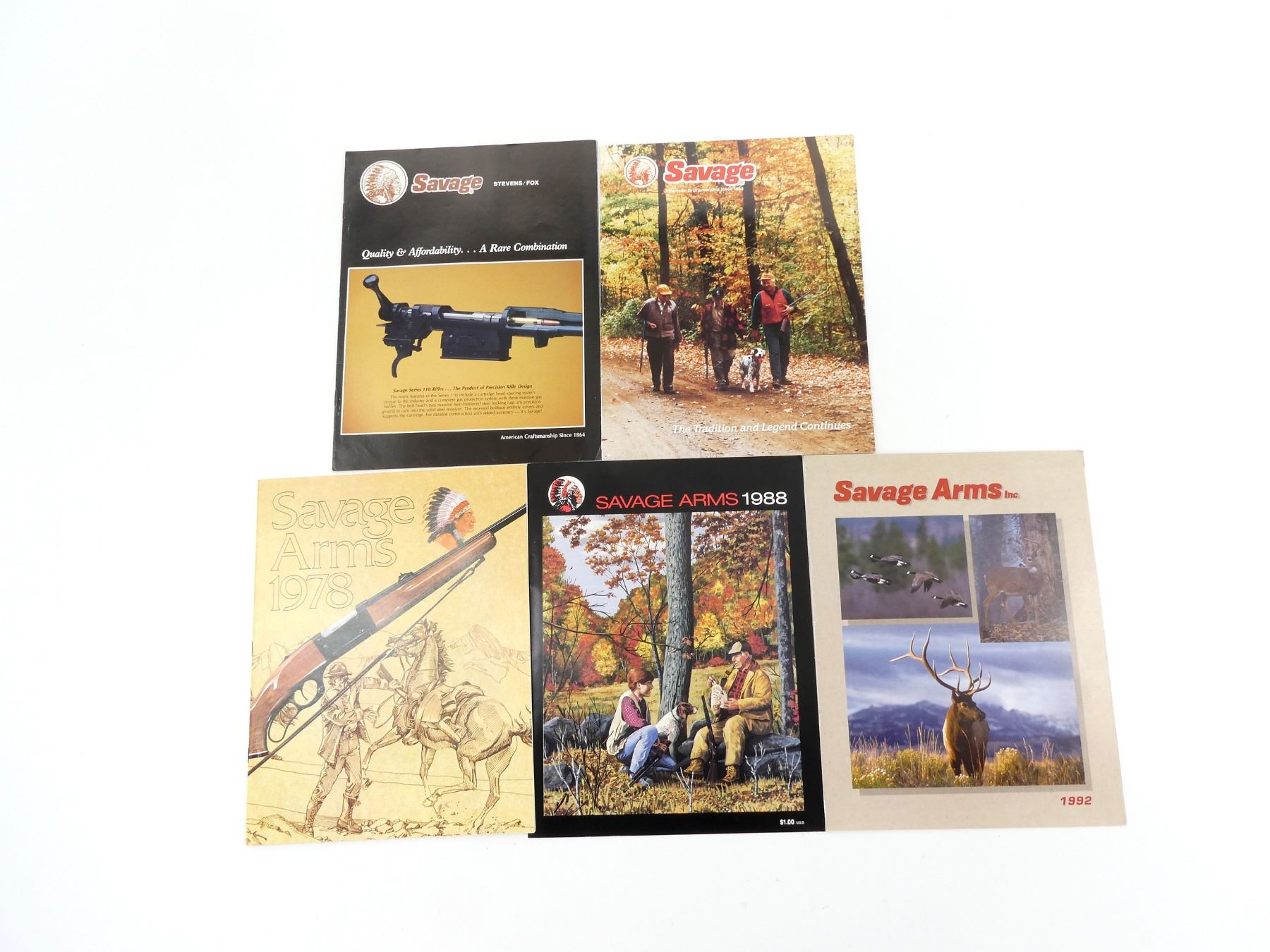 SOFT COVERS, LOT INCLUDES; (1) "SAVAGE ARMS 1988" BROCHURE, (1) "SAVAGE ARMS 1992" CATALOGUE, (1) "SAVAGE ARMS 1978" CATALOGUE, (1) "SAVAGE" CATALOGUE & (1) "SAVAGE, QUALITY & AFFORDABILITY… A RARE COMBINATION" CATALOGUE. SEE PHOTOS.