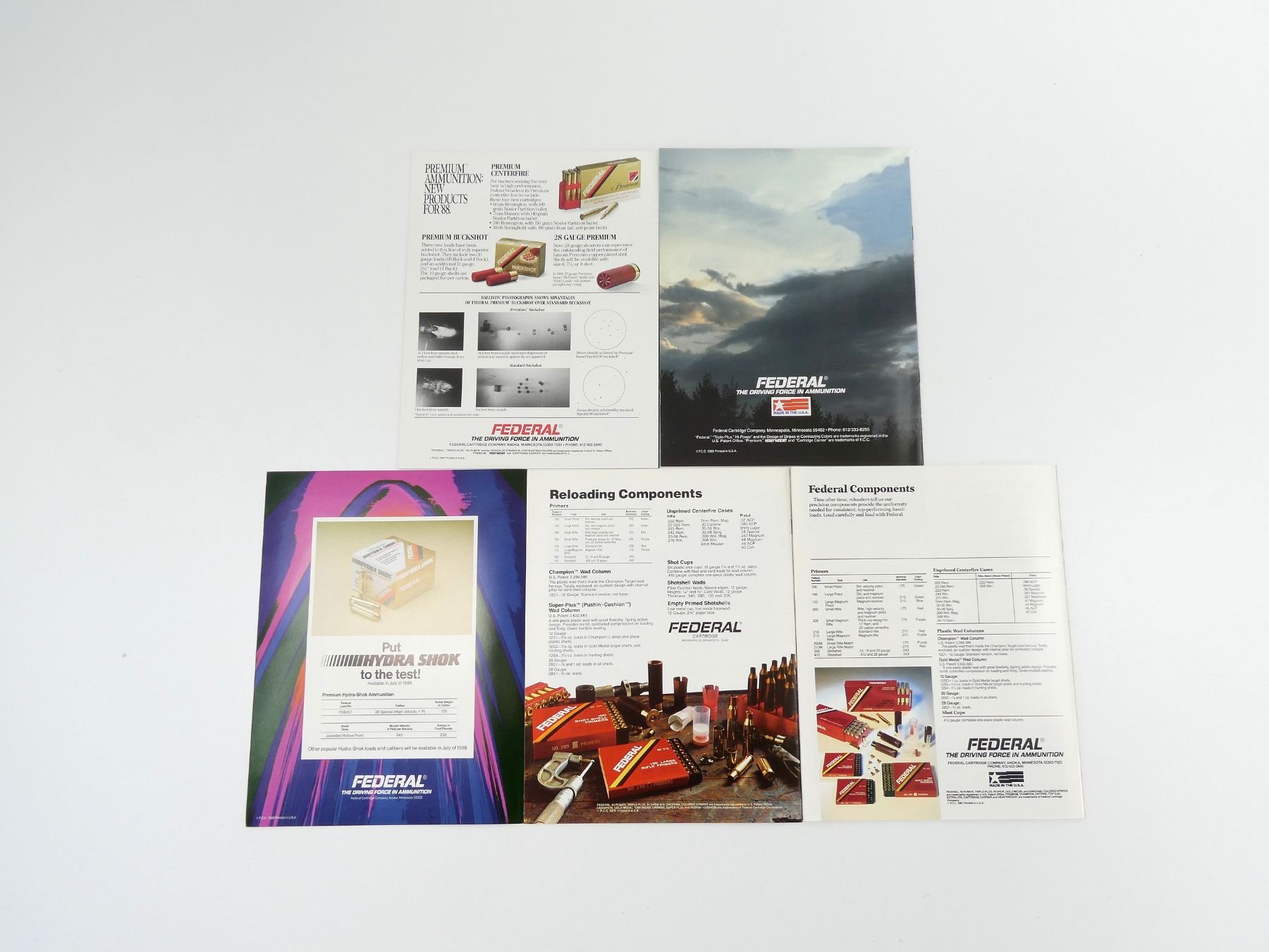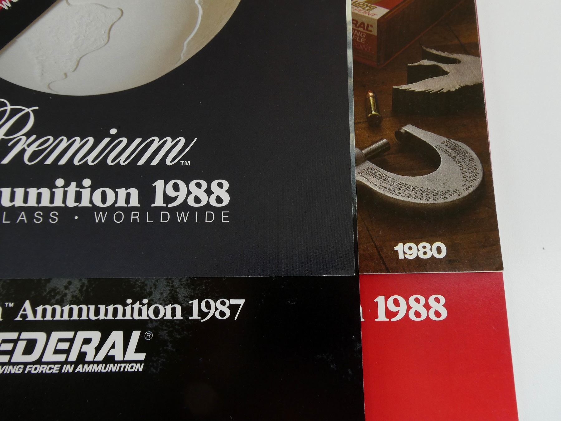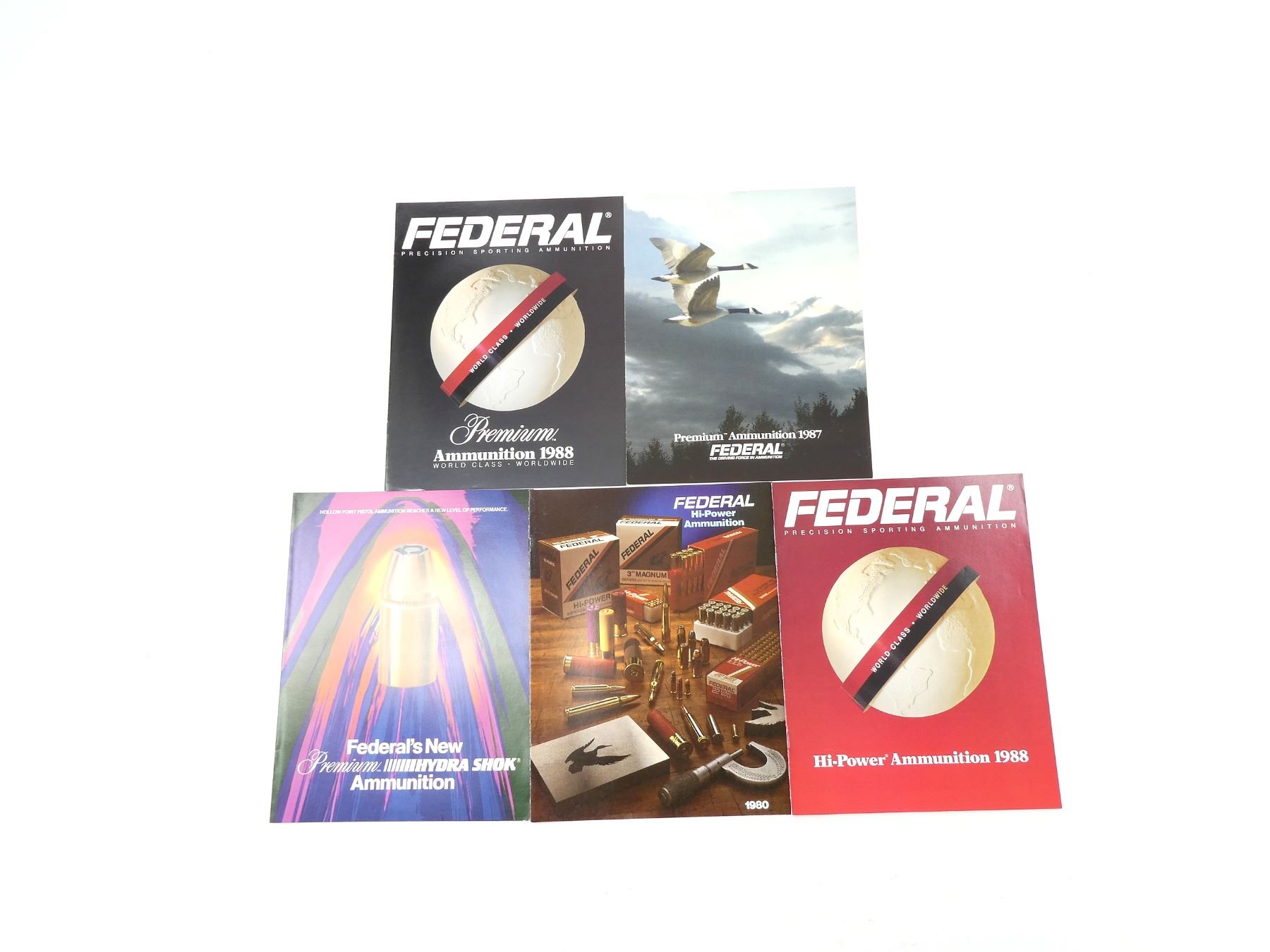 SOFT COVERS, LOT INCLUDES; (1) "FEDERAL HI-POWER AMMUNITION 1980" CATALOGUE, COPYRIGHT 1979, (1) "FEDERAL PREMIUM AMMUNITION 1988" CATALOGUE, COPYRIGHT 1987, (1) "FEDERAL HI-POWER AMMUNITION 1988" CATALOGUE, COPYRIGHT 1987, (1) "FEDERAL PREMIUM AMMUNITION 1987" CATALOGUE, COPYRIGHT 1986 & (1) "FEDERAL'S NEW PREMIUM HYDRA SHOK AMMUNITION" BROCHURE, COPYRIGHT 1988. SEE PHOTOS.