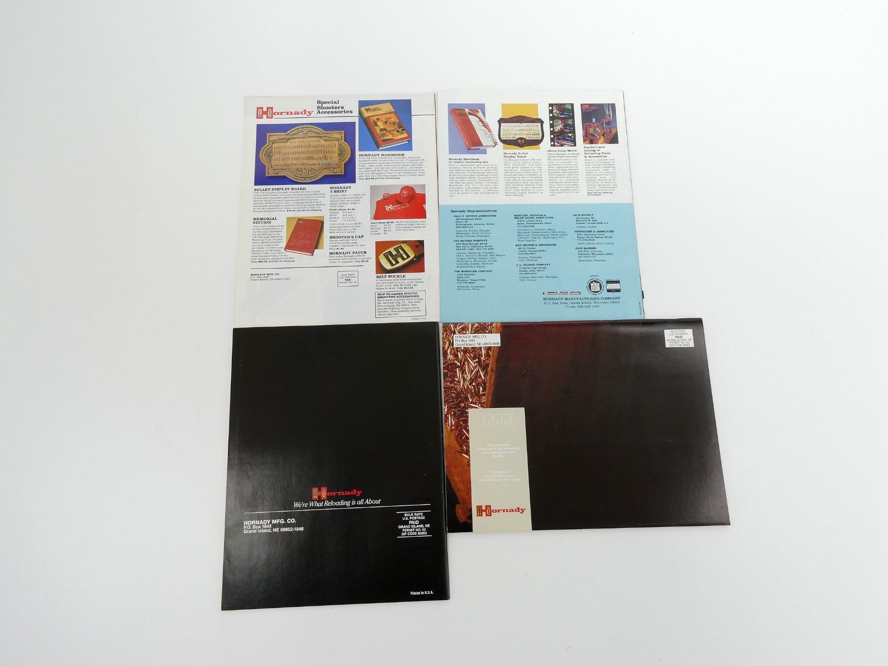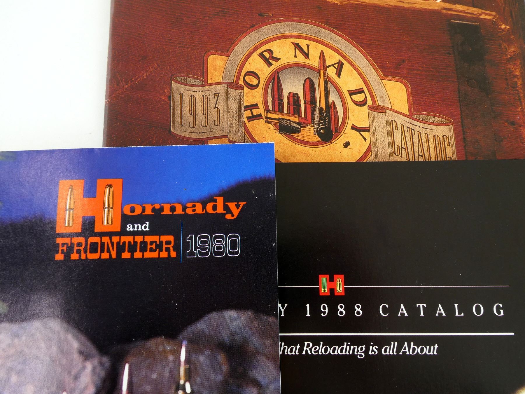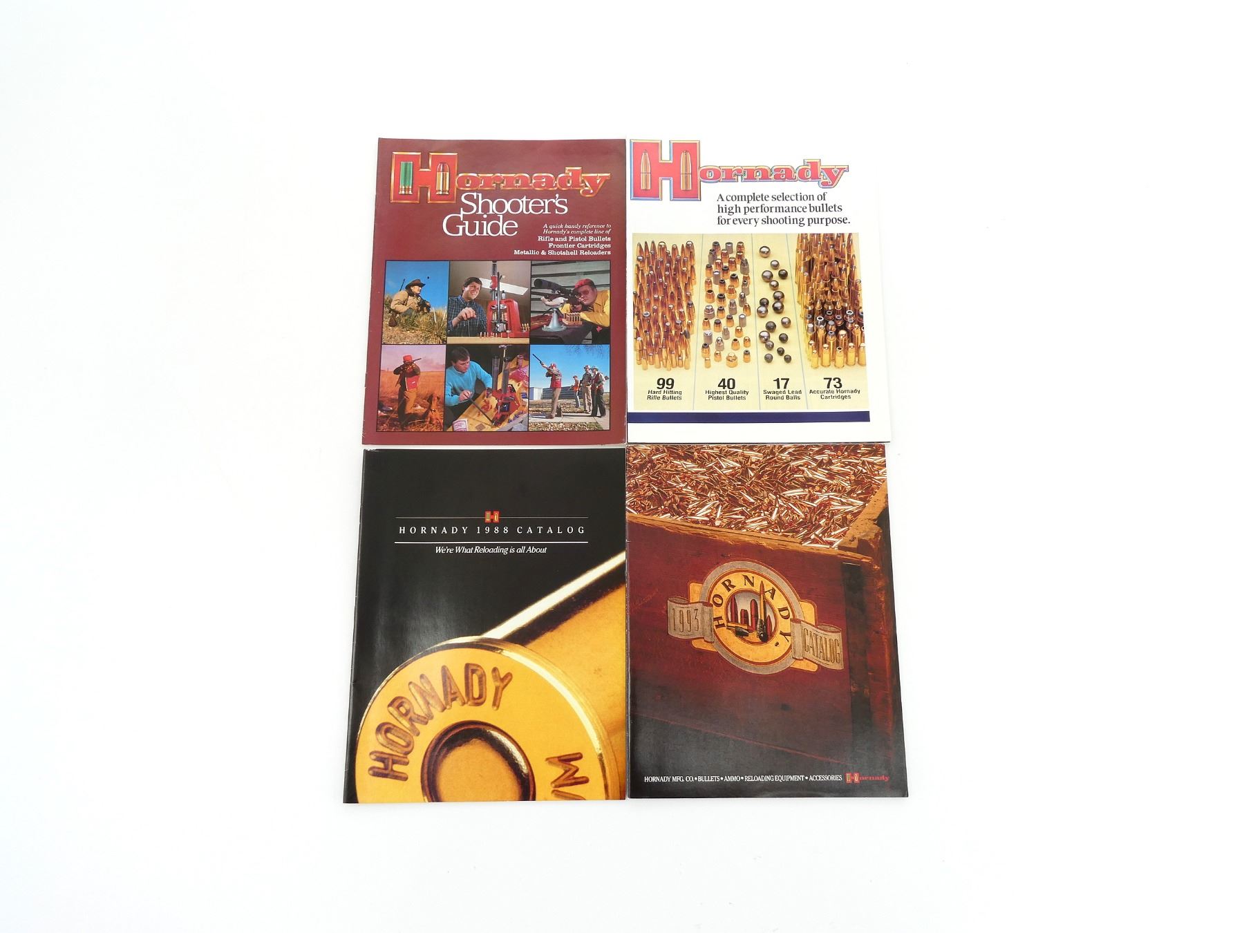 SOFT COVERS, LOT INCLUDES; (1) "HORNADY SHOOTER'S GUIDE" CATALOGUE, (1) "HORNADY AND FRONTIER 1980" BROCHURE, (1) "HORNADY, A COMPLETE SELECTION OF HIGH PERFORMANCE BULLETS FOR EVERY SHOOTING PURPOSE" BROCHURE, (1) "HORNADY 1988 CATALOG" CATALOGUE & (1) "HORNADY 1993 CATALOG" CATALOGUE. SEE PHOTOS.