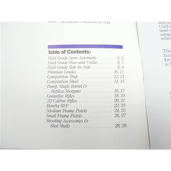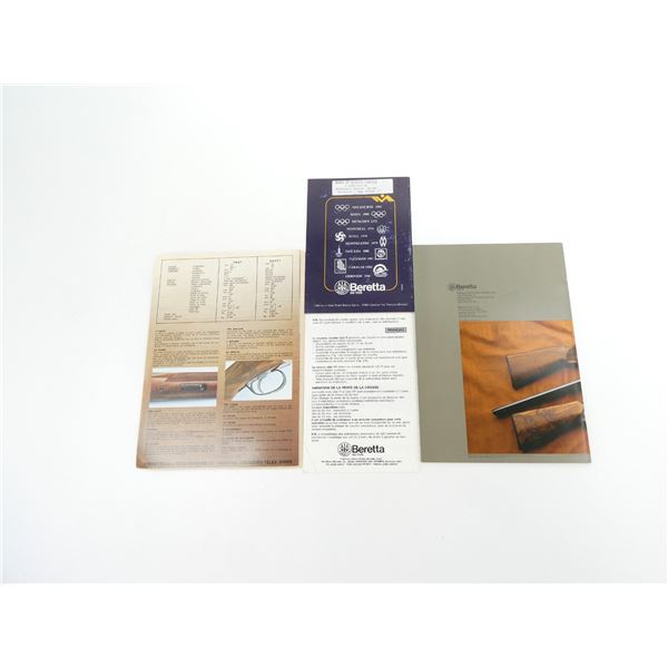 SOFT COVERS, LOT INCLUDES; (1) "BERETTA S680 TRAP & SKEET" BROCHURE, (1) "BERETTA S686, S687" BROCHURE, (1) "BERETTA 1201 F / 1201 FP" BROCHURE, (1) "BERETTA NUOVI FUCILI DA TRIO S 6S2" BOOKLET & (1) "BERETTA FIREARMS" CATALOGUE, COPYRIGHT 1985. SEE PHOTOS.