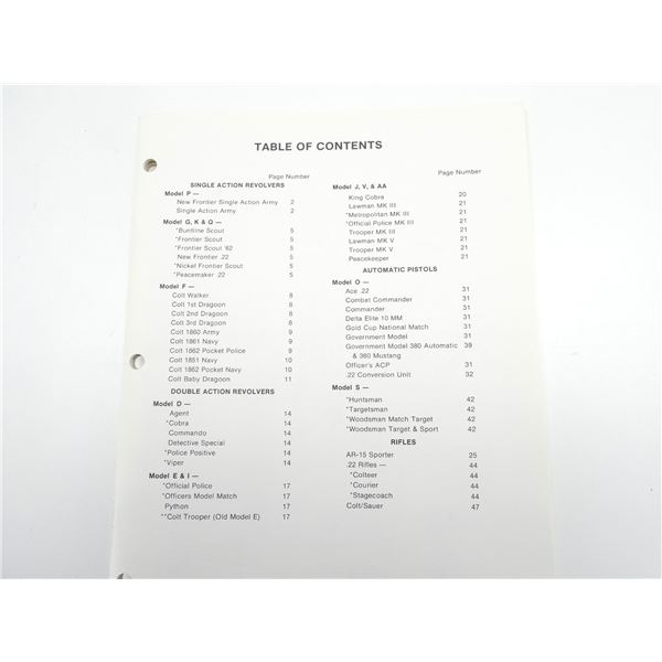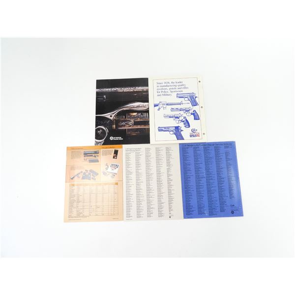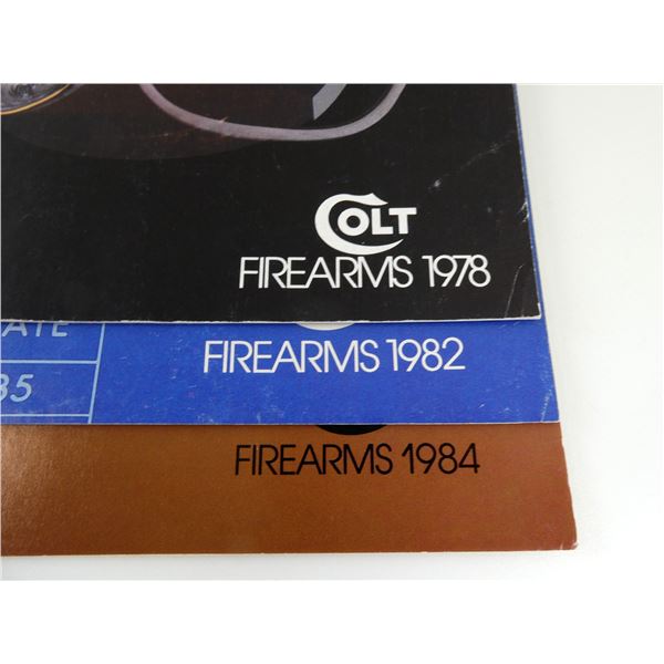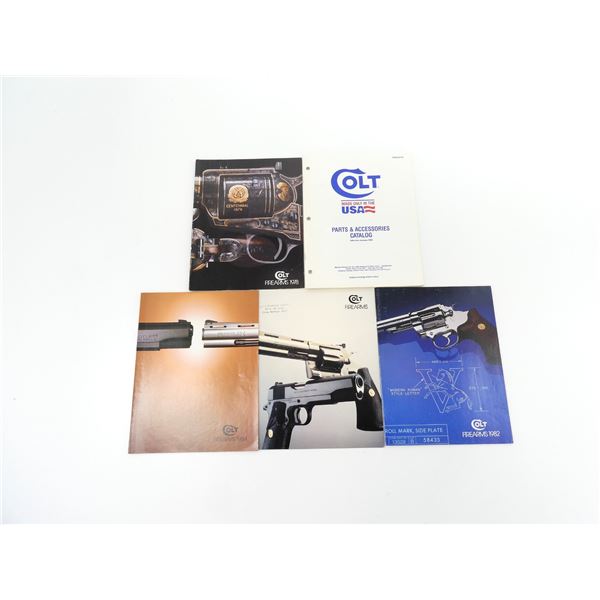 SOFT COVERS, LOT INCLUDES; (1) "COLT FIREARMS 1978" CATALOGUE, COPYRIGHT 1977, (1) "COLT FIREARMS 1984" BROCHURE, (1) "COLT PARTS & ACCESSORIES CATALOG" CATALOGUE, COPYRIGHT 1989, (1) "COLT FIREARMS 1982" CATALOGUE, COPYRIGHT 1981 & (1) "COLT FIREARMS" BROCHURE. SEE PHOTOS.