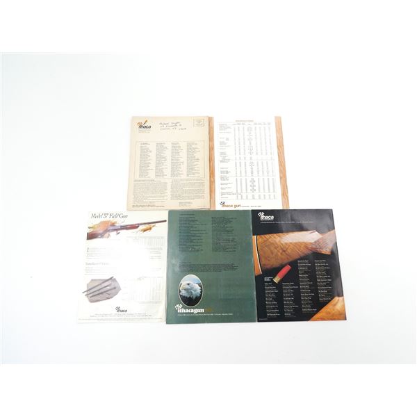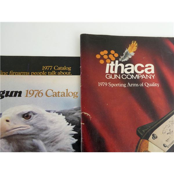 SOFT COVERS, LOT INCLUDES; (1) "1977 CATALOG …FINE FIREARMS PEOPLE TALK ABOUT" CATALOGUE, COPYRIGHT 1977, (1) "THE TRADITION LIVES ON" BROCHURE, (1) "ITHACA GUN COMPANY 1979 SPORTING ARMS OF QUALITY" CATALOGUE, COPYRIGHT 1978, (1) "ITHACA SHOTGUNS" BROCHURE & (1) "ITHACAGUN 1976 CATALOG" CATALOGUE. SEE PHOTOS.