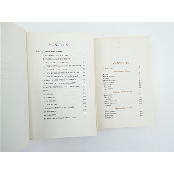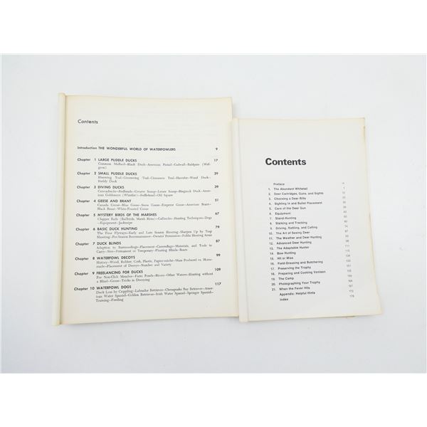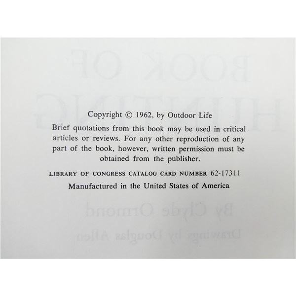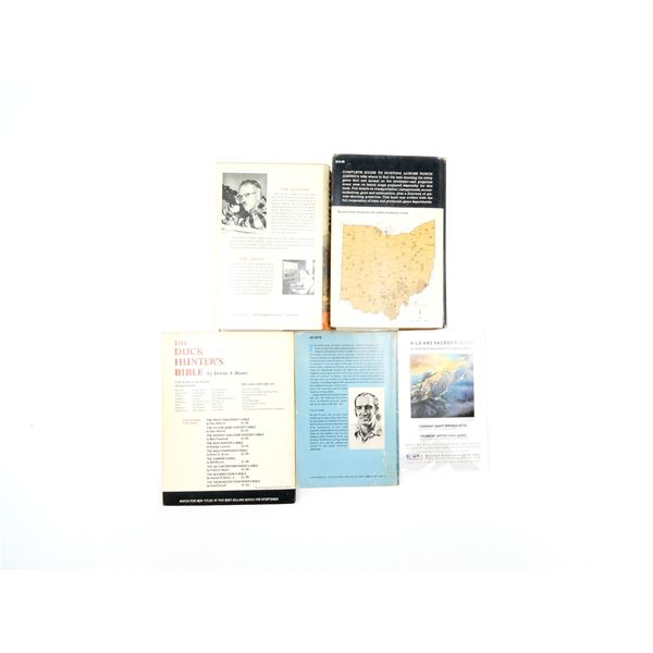 LOT INCLUDES; (1) "WHERE, CANADIAN ROCKIES" CATALOGUE PUBLISHED SUMMER 2015, SOFT COVER, (1) "HUNTING THE WHITETAIL DEER" BOOK BY RUSSELL TINSLEY, SOFT COVER, ISBN: 0-308-10327-0, (1) "THE DUCK HUNTER'S BIBLE" BOOK BY ERWIN A. BAUER, SOFT COVER, COPYRIGHT 1965, (1) "COMPLETE BOOK OF HUNTING" BOOK BY CLYDE ORMOND, HARD COVER WITH DUST COVER, COPYRIGHT 1962 & (1) "COMPLETE GUIDE TO HUNTING ACROSS NORTH AMERICA, LOCATING GAME, TECHNIQUES, TRANSPORTATION, EQUIPMENT FOR EVERY REGION" BOOK BY BYRON W. DALRYMPLE, HARD COVER WITH DUST COVER, COPYRIGHT 1970. SEE PHOTOS.
