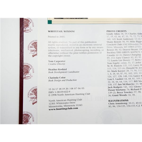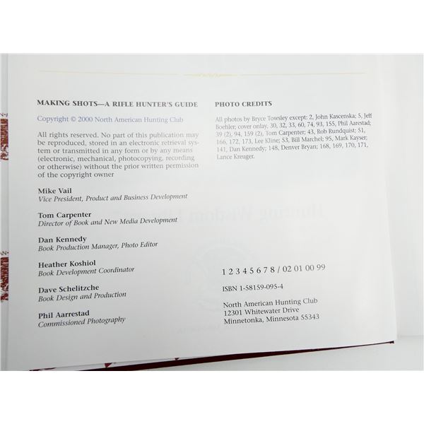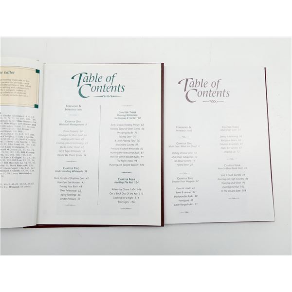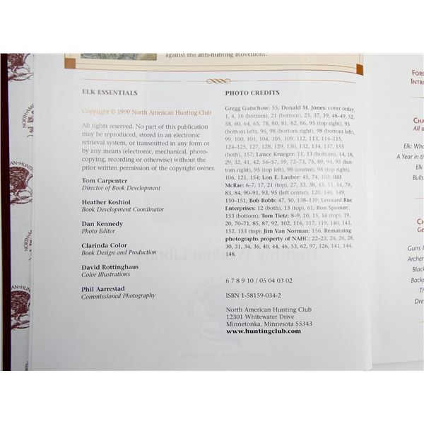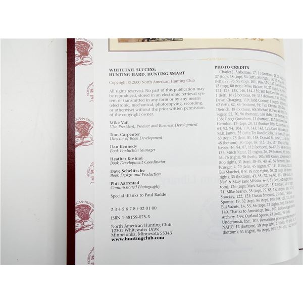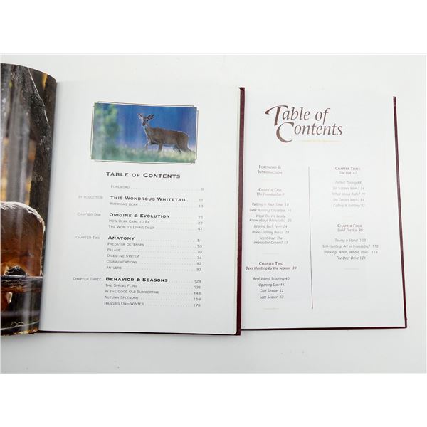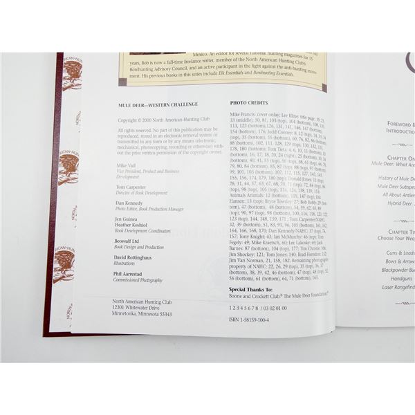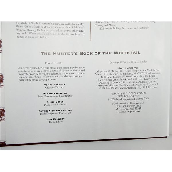 HARD COVERS, PUBLISHED BY NORTH AMERICAN HUNTING CLUB, LOT INCLUDES; (1) "MULE DEER, WESTERN CHALLENGE" BOOK BY BOB ROBB, ISBN: 1-58159-100-4, (1) "ELK ESSENTIALS" BOOK BY BOB ROBB, ISBN: 1-58159-034-2, (1) "MAKING SHOTS - A RIFLE HUNTER'S GUIDE" BOOK BY BRYCE M. TOWSLEY, ISBN: 1-58159-095-4, (1) "WHITETAIL WISDOM" BOOK EDITED BY GREGG GUTSCHOW, ISBN: 1-58159-022-9, (1) "THE HUNTER'S BOOK OF THE WHITETAIL" BOOK BY RON SPOMER & MICHAEL H. FRANCIS, ISBN: 1-58159-076-8 & (1) "WHITETAIL SUCCESS, HUNTING HARD, HUNTING SMART" BOOK BY GREGG GUTSCHOW, ISBN: 1-58159-075-X. SEE PHOTOS.