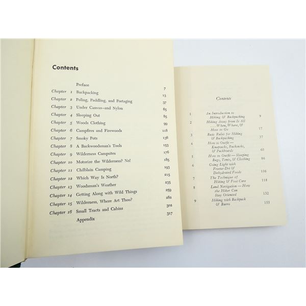 HARD COVERS WITH DUST COVERS, LOT INCLUDES; (1) "THE HIKER'S & BACKPACKER'S HANDBOOK" BOOK BY BILL MERRILL, ISBN: 0-87691-031-2 & (1) "BACKCOUNTRY CAMPING" BOOK BY BILL RIVIERE, COPYRIGHT 1971. SEE PHOTOS.