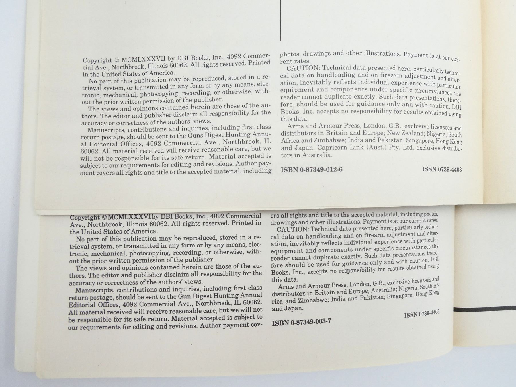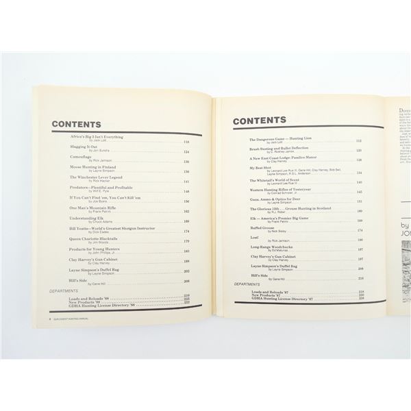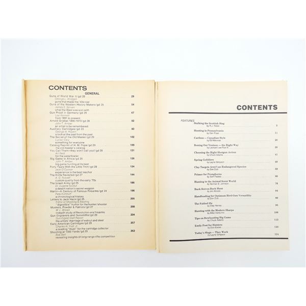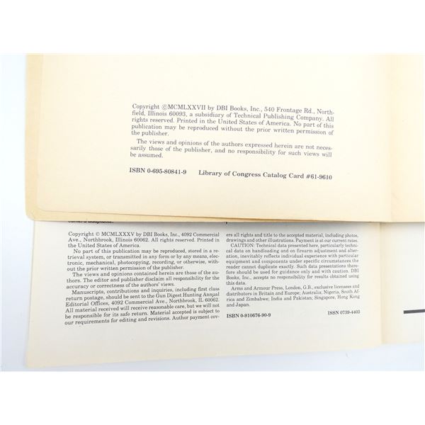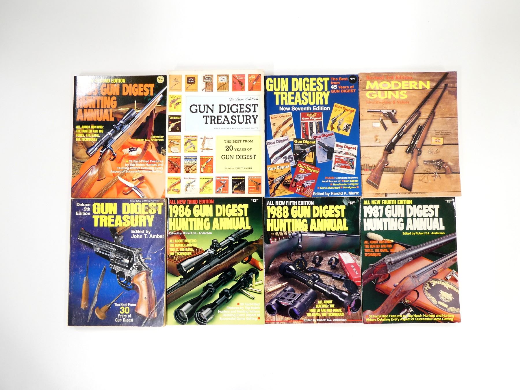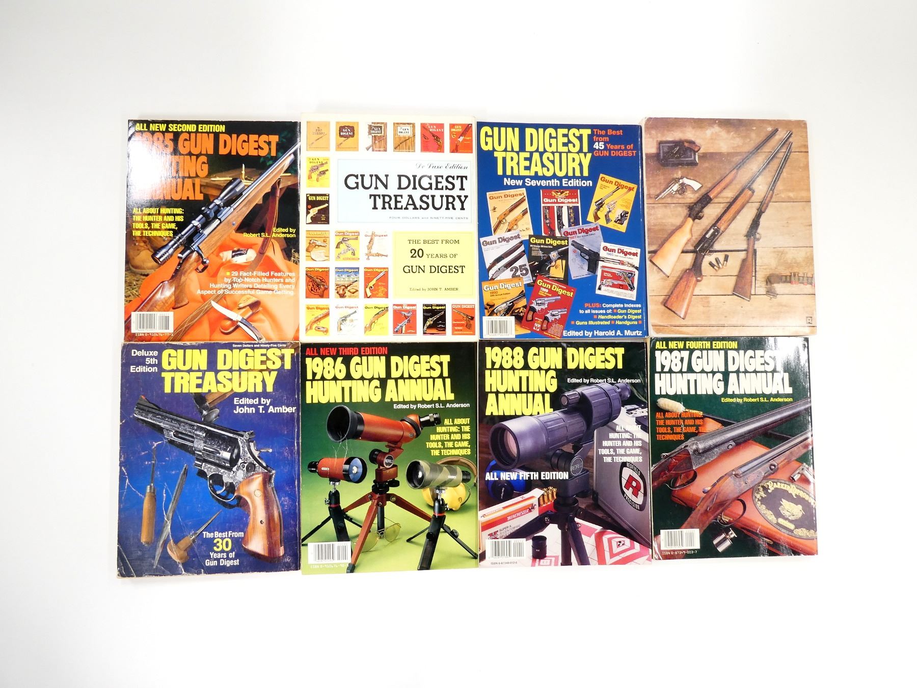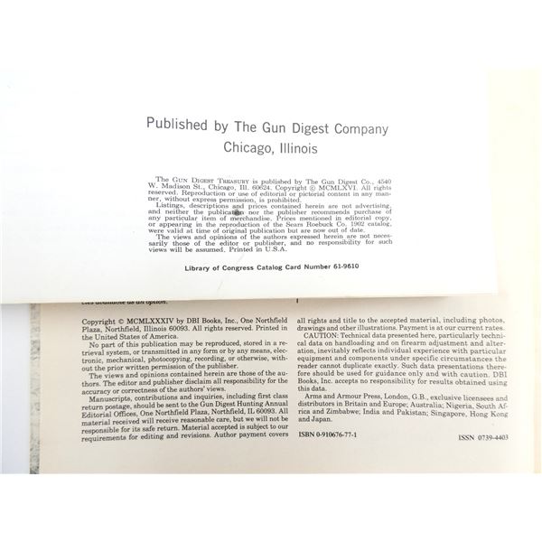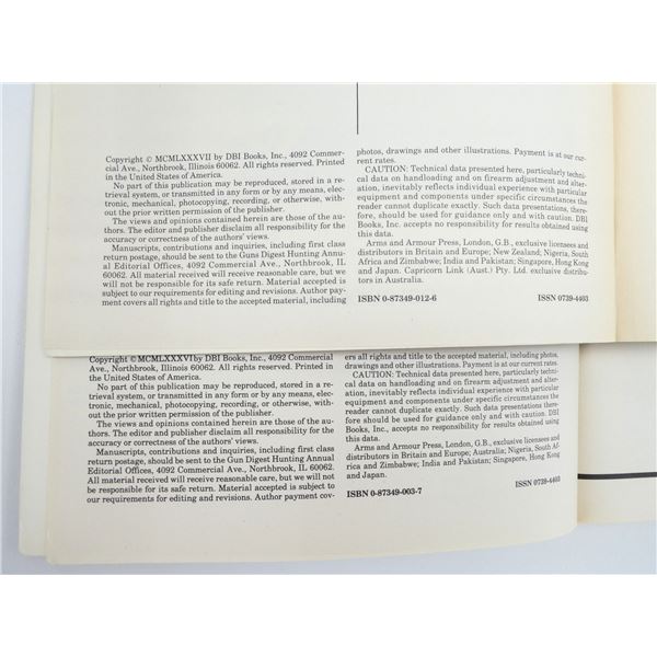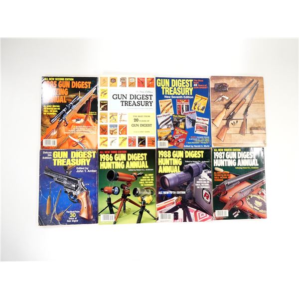 SOFT COVERS, LOT INCLUDES; (3) "GUN DIGEST TREASURY" CATALOGUES, (4) "GUN DIGEST HUNTING ANNUAL" CATALOGUES FROM 1985 TO 1988 & (1) "MODERN GUNS" CATALOGUE, SERIES NOT COMPLETE / SOME ISSUES MISSING / MAY CONTAIN DUPLICATES. SEE PHOTOS.
