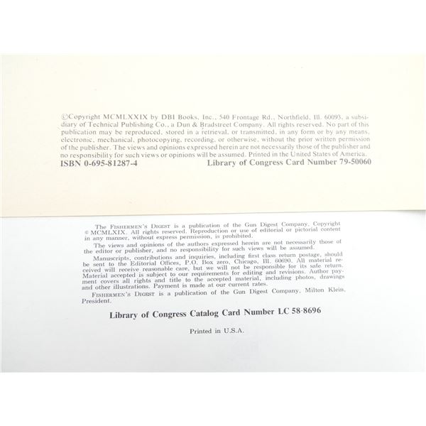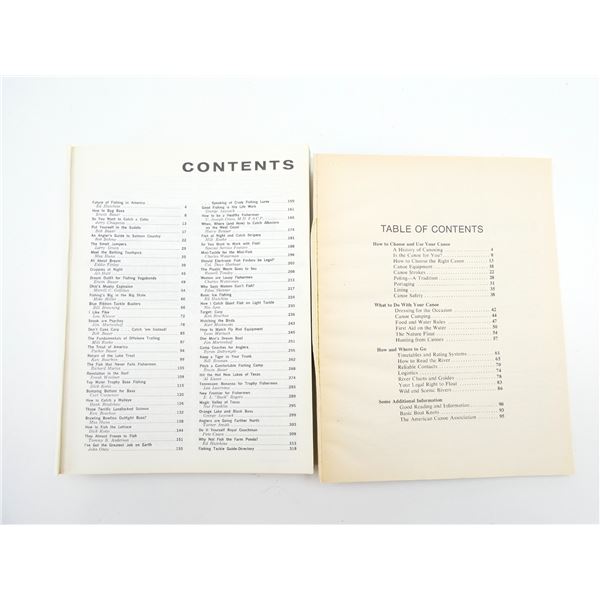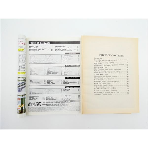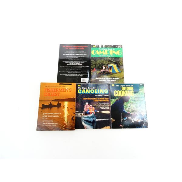 SOFT COVERS, LOT INCLUDES; (1) "FISHERMEN'S DIGEST" BOOK EDITED BY ERWIN A. BAUER, COPYRIGHT 1969, (1) "BLACK'S 1999 FLY SISHING" CATALOGUE, ISBN: 0-8092-2653-7, (1) "THE DIGEST BOOK OF CANOEING" BOOK BY CHARLES J. FARMER, ISBN: 0-695-81287-4, (1) "THE DIGEST BOOK OF OUTDOOR COOKING" BOOK BY CHARLES & KATHY FARMER, ISBN: 0-695-81285-8 & (1) "THE DIGEST BOOK OF CAMPING" BOOK BY ERWIN & PEGGY BAUER, ISBN: 0-695-81281-5. SEE PHOTOS.