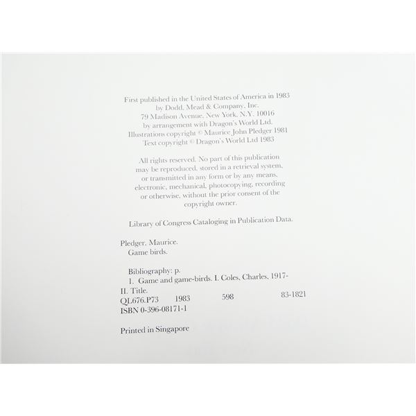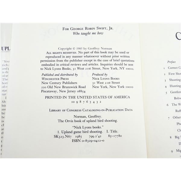 LOT INCLUDES; (1) "THE ORVIS BOOK OF UPLAND BIRD SHOOTING" BY GEOFFREY NORMAN, HARD COVER WITH DUST COVER, ISBN: 0-8329-0412-0, (1) "OUR AMERICAN GAME BIRDS" BOOK BY VAN CAMPEN HEILNER & LYNN BOGUE HUNT, HARD COVER, COPYRIGHT 1941 & (1) "GAME BIRDS" BOOK BY CHARLES COLES & MAURICE PLEDGER, HARD COVER WITH DUST COVER, ISBN: 0-396-08171-1. SEE PHOTOS.