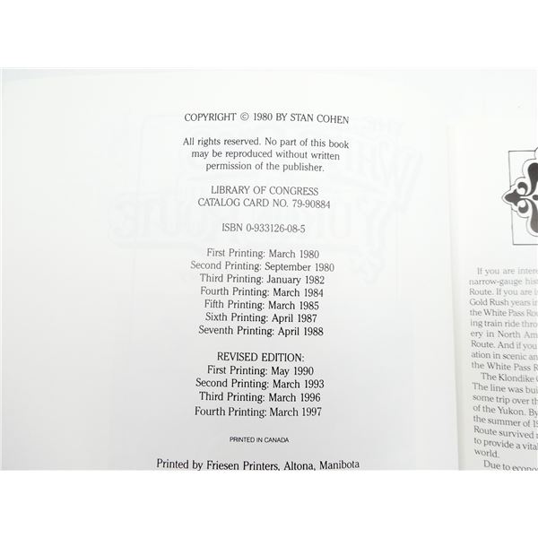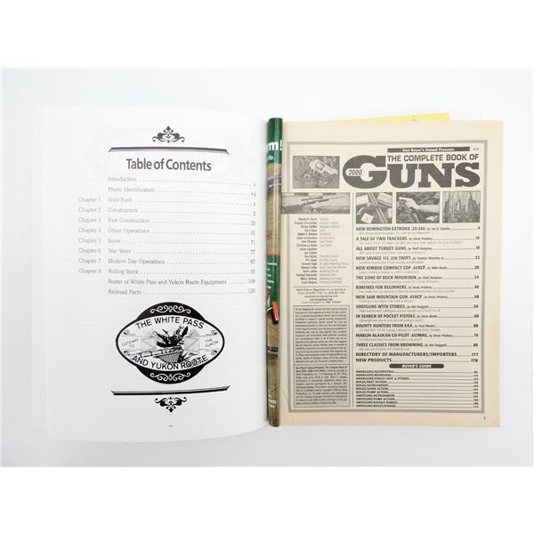LOT INCLUDES; (7) ASSORTED FIREARMS AND HUNTING MAGAZINES, SOFT COVERS, (1) "THE WHITE PASS AND YUKON ROUTE" BOOK BY STAN COHEN, SOFT COVER, ISBN: 0-933126-08-5, (1) "THE MOUNTAIN GUIDE, THE OFFICIAL PARKS CANADA VISITORS' GUIDE" PROGRAM, SOFT COVER, (1) "PIONEERING ON THE C.P.R." BOOK BY FLORENCE R. HOWEY, HARD COVER, COPYRIGHT 1938 & (1) "TALES OF THE CANADIAN NORTH" BOOK COMPILED BY FRANK OPPEL, HARD COVER WITH DUST COVER, ISBN: 0-89009-797-6. SEE PHOTOS.