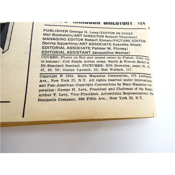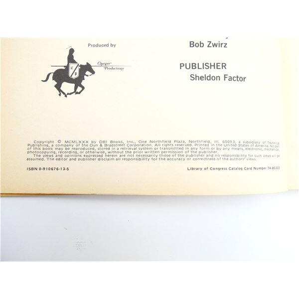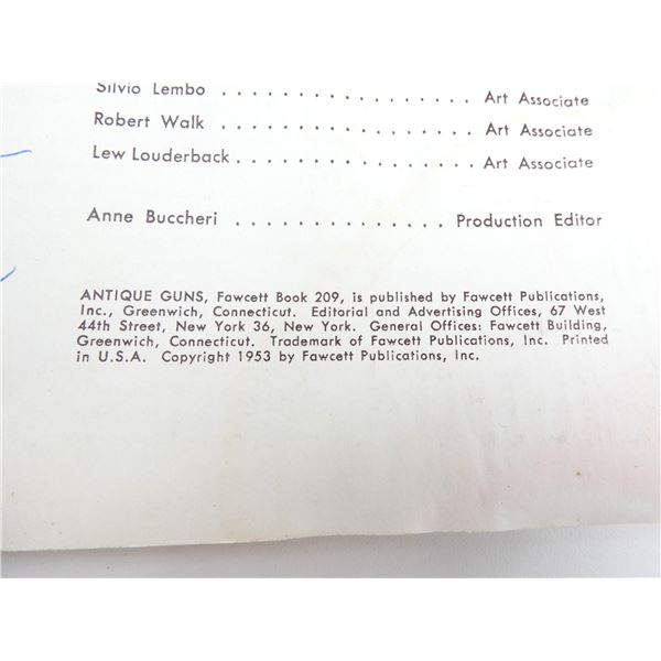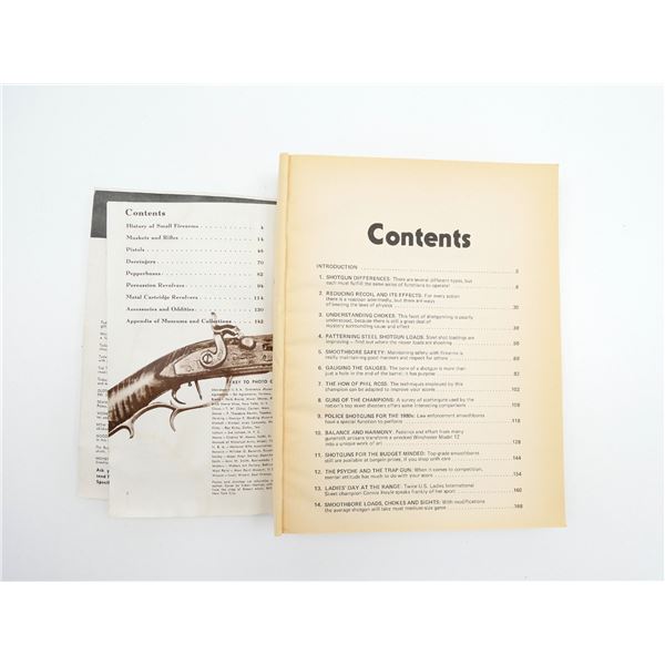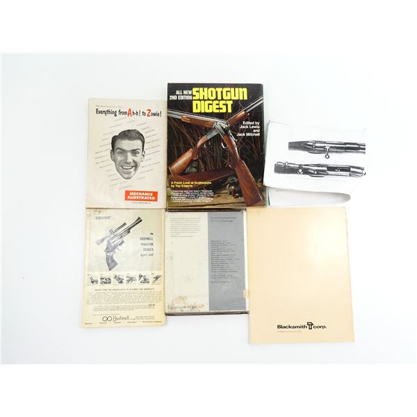 LOT INCLUDES; (1) "ANTIQUE GUNS" BY HANK WIEAND BOWMAN, SOFT COVER, COPYRIGHT 1953, (1) "ITALY BOOK OF RIFLES" EXCERPT, (1) "LARRY KOLLER'S COMPLETE GUIDE TO HANDGUNS" BOOK, COPYRIGHT 1962, (1) "METHUEN'S OUTLINES, GUNS" BOOK BY S. E. ELLACOTT, HARD COVER WITH DUST COVER, SBN: 416-58050-5, (1) "A BLACKSMITH GUIDE TO... RUGER RIMFIRE REVOLVERS 1953-1973" BOOK BY J.C. MUNNELL, SOFT COVER, ISBN: 0-941540-07-3 & (1) "SHOTGUN DIGEST" CATALOGUE EDITED BY JACK LEWIS & JACK MITCHELL, SOFT COVER, ISBN: 0-910676-13-5. SEE PHOTOS.