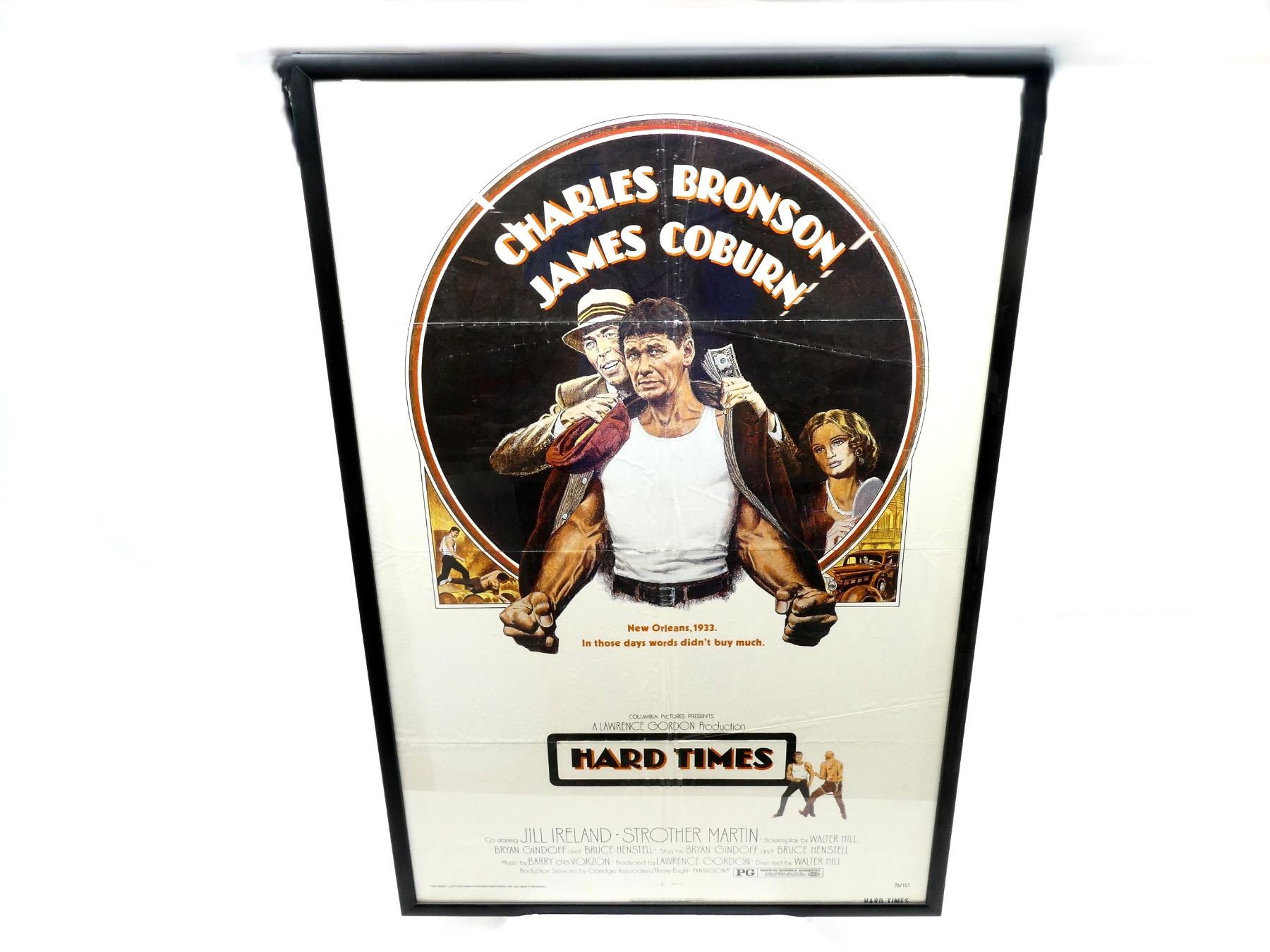 (1) FRAMED "HARD TIMES" ADVERTISEMENT POSTER STARRING CHARLES BRONSON AND JAMES COBURN, IN COLOUR. SEE PHOTOS.