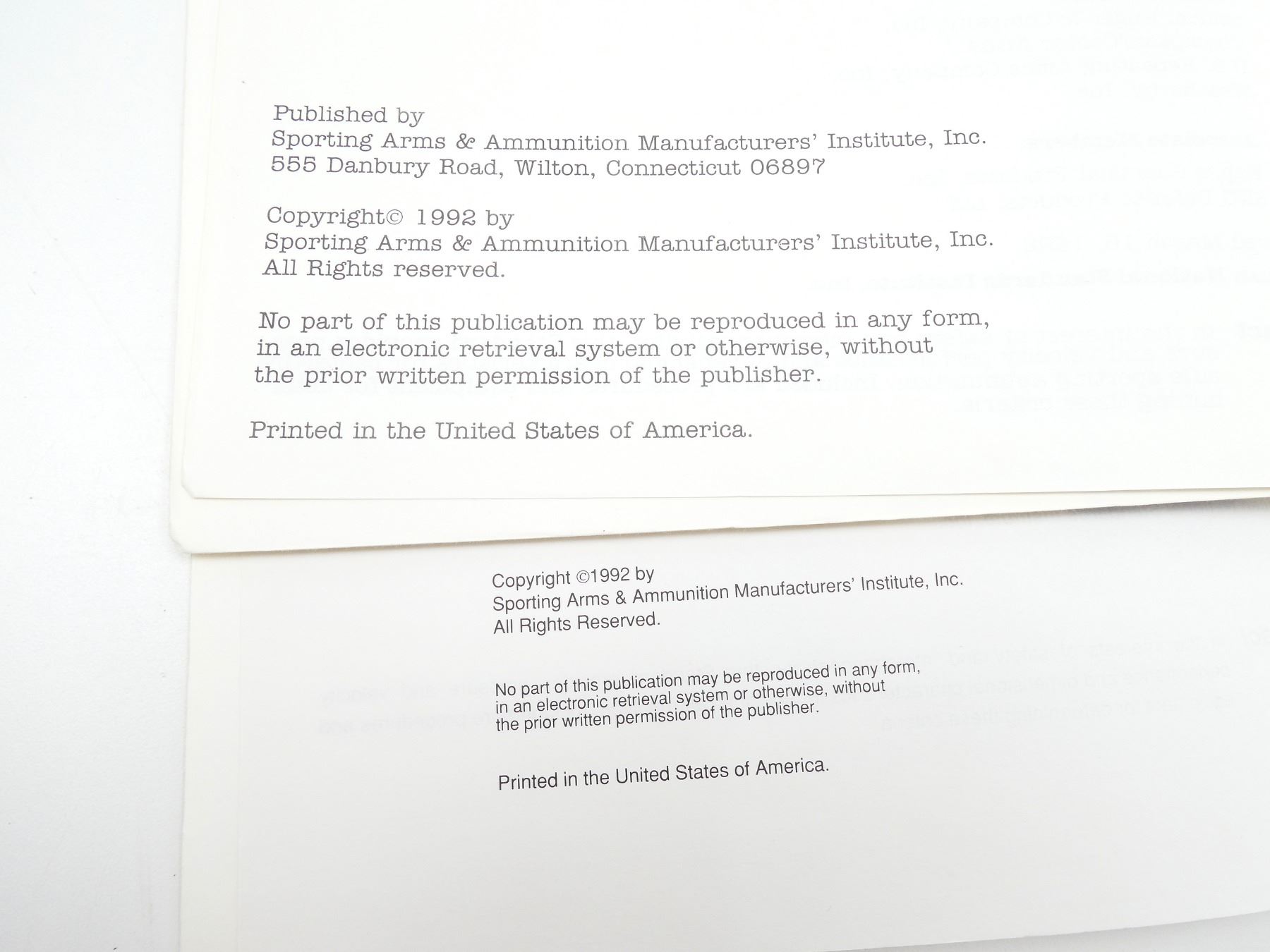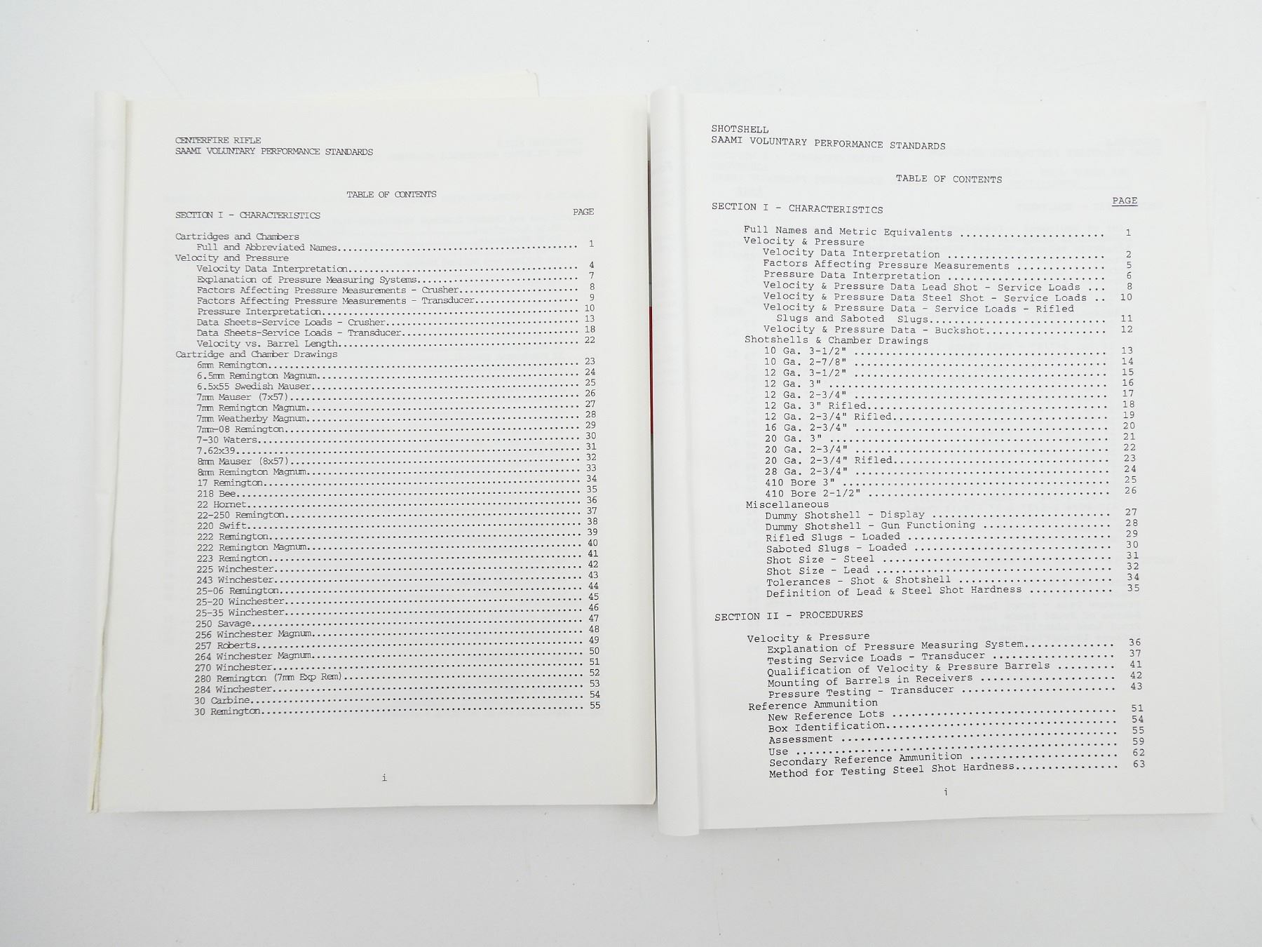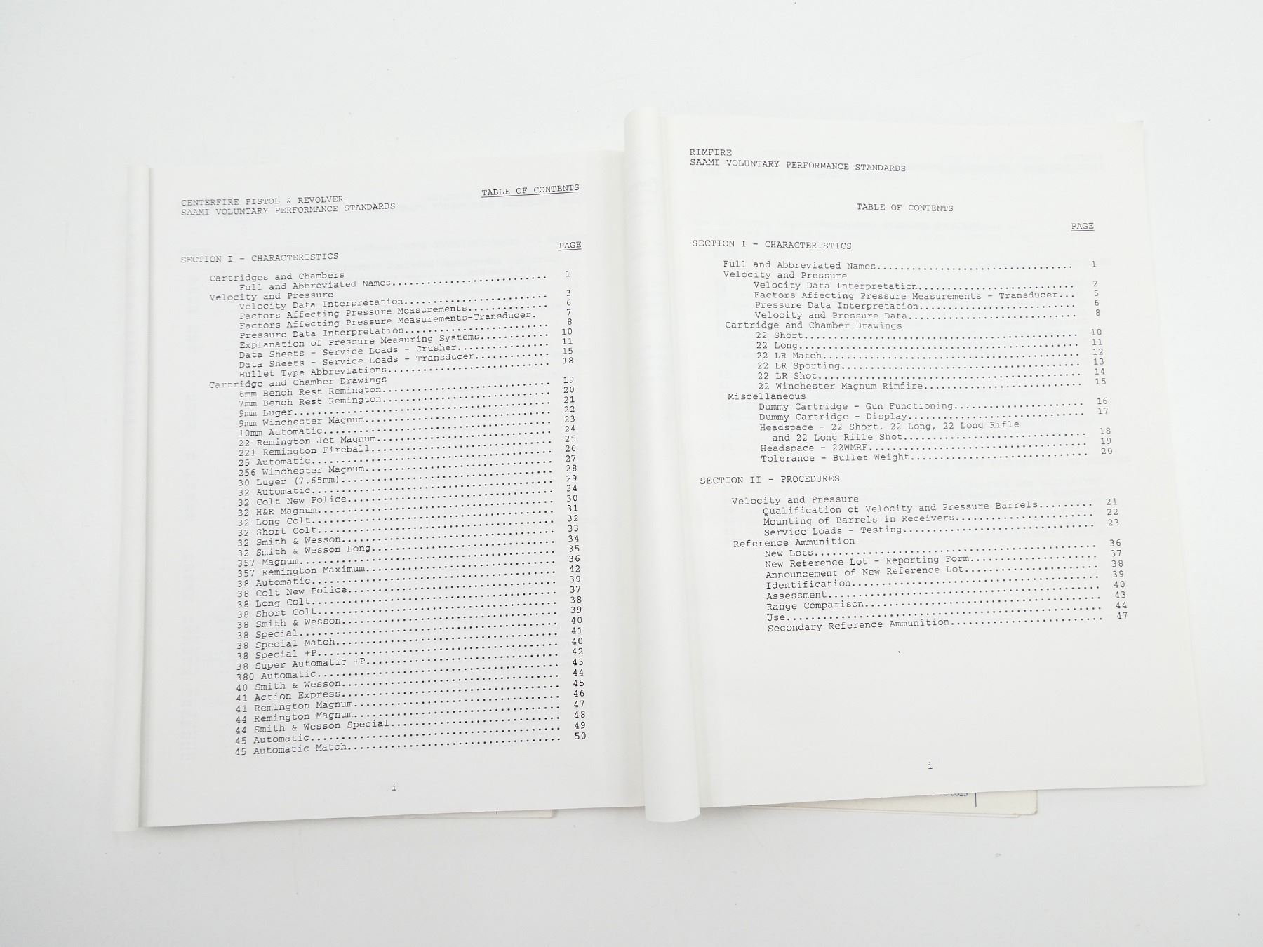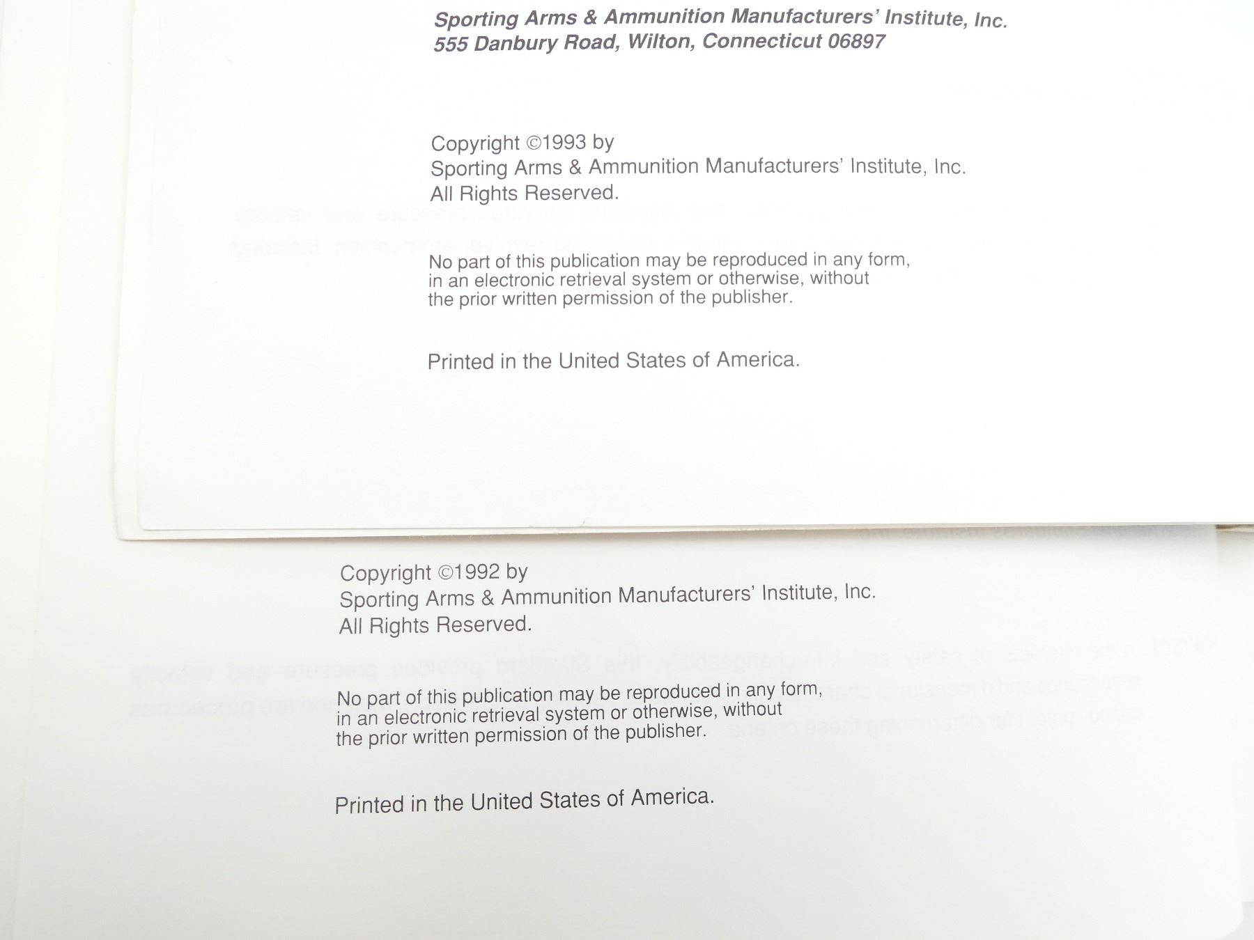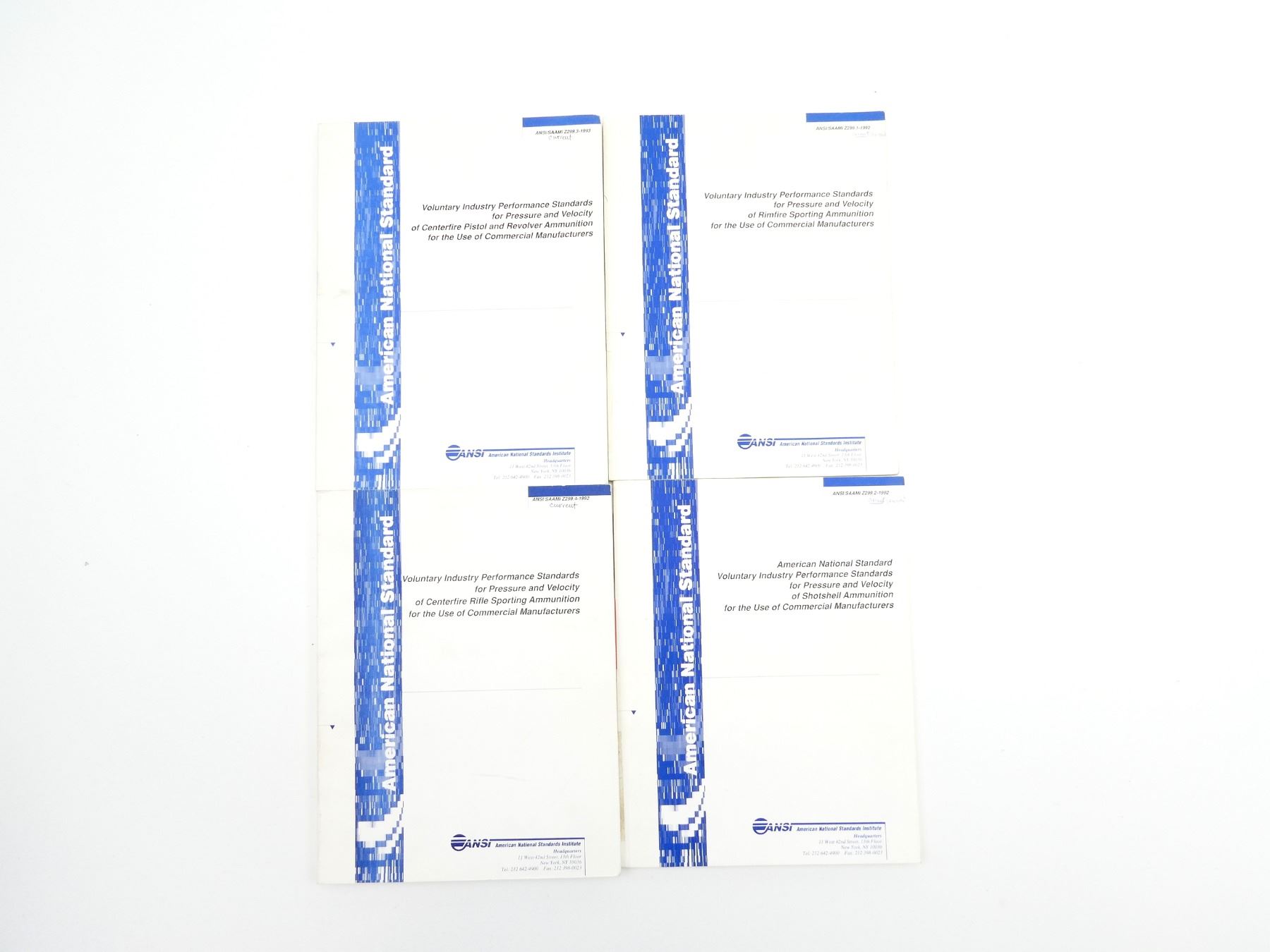 SOFT COVERS, PUBLISHED BY SPORTING ARMS & AMMUNITION MANUFACTURERS' INSTITUTE INC., LOT INCLUDES; (1) "AMERICAN NATIONAL STANDARD VOLUNTARY INDUSTRY PERFORMANCE STANDARDS FOR PRESSURE AND VELOCITY OF SHOTSHELL AMMUNITION FOR THE USE OF COMMERCIAL MANUFACTURERS" BOOK, COPYRIGHT 1992, (1) ""AMERICAN NATIONAL STANDARD VOLUNTARY INDUSTRY PERFORMANCE STANDARDS FOR PRESSURE AND VELOCITY OF CENTERFIRE PISTOL AND REVOLVER AMMUNITION FOR THE USE OF COMMERCIAL MANUFACTURERS" BOOK, COPYRIGHT 1993, (1) ""AMERICAN NATIONAL STANDARD VOLUNTARY INDUSTRY PERFORMANCE STANDARDS FOR PRESSURE AND VELOCITY OF CENTERFIRE RIFLE AMMUNITION FOR THE USE OF COMMERCIAL MANUFACTURERS" BOOK, COPYRIGHT 1992 & (1) ""AMERICAN NATIONAL STANDARD VOLUNTARY INDUSTRY PERFORMANCE STANDARDS FOR PRESSURE AND VELOCITY OF RIMFIRE SPORTING AMMUNITION FOR THE USE OF COMMERCIAL MANUFACTURERS" BOOK, COPYRIGHT 1992. SEE PHOTOS.