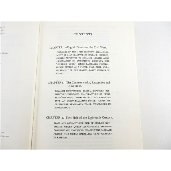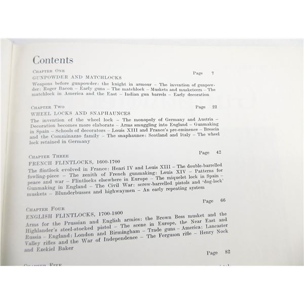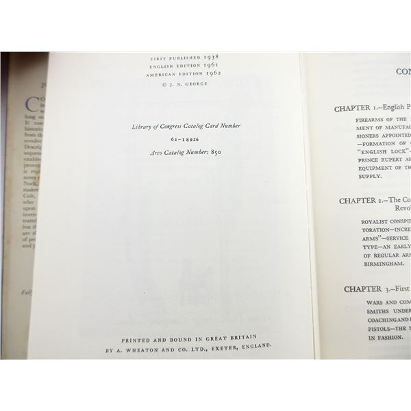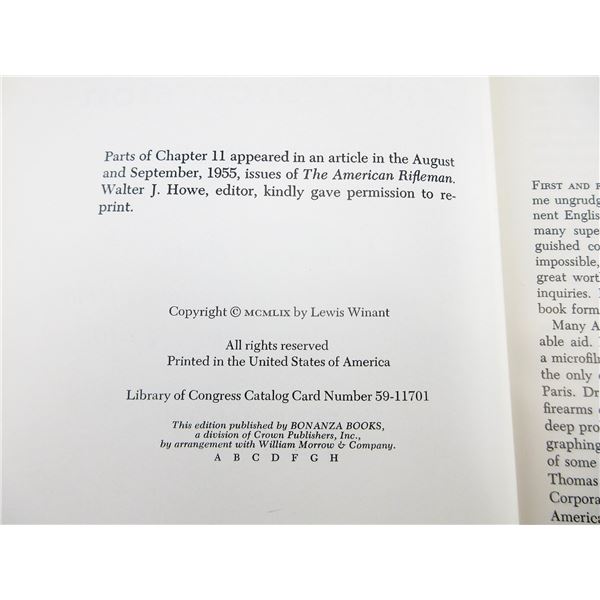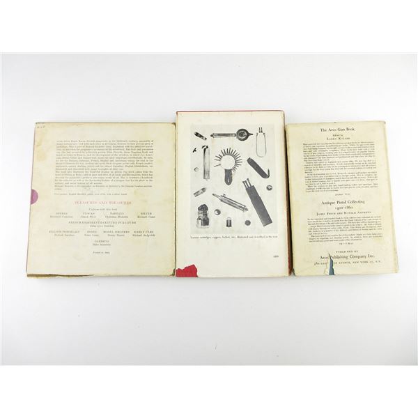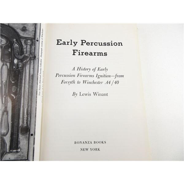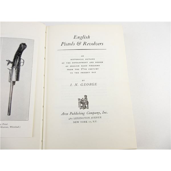 LOT INCLUDES; (1) "FIREARMS, PLEASURES AND TREASURES" BOOK, BY HOWARD RICKETTS, HARD COVER WITH SLEEVE, COPYRIGHT 1962, (1) "ENGLISH PISTOLS & REVOLVERS" BOOK, BY JOHN NIGEL GEORGE, HARD COVER WITH DUST COVER, COPYRIGHT 1962 & (1) "EARLY PERCUSSION FIREARMS" BOOK, BY LEWIS WINANT, HARD COVER WITH DUST COVER, COPYRIGHT MCMLIX. SEE PHOTOS.
