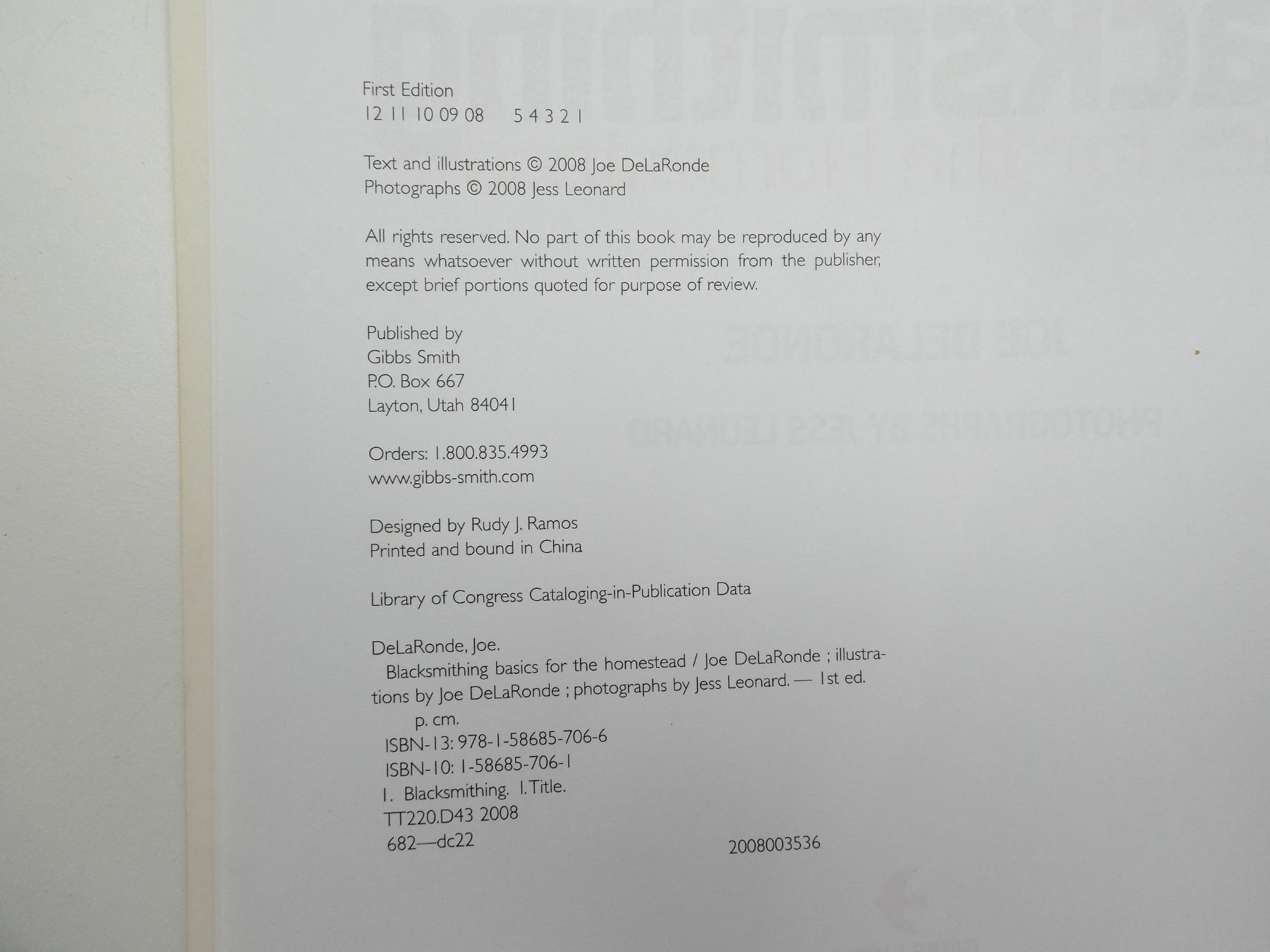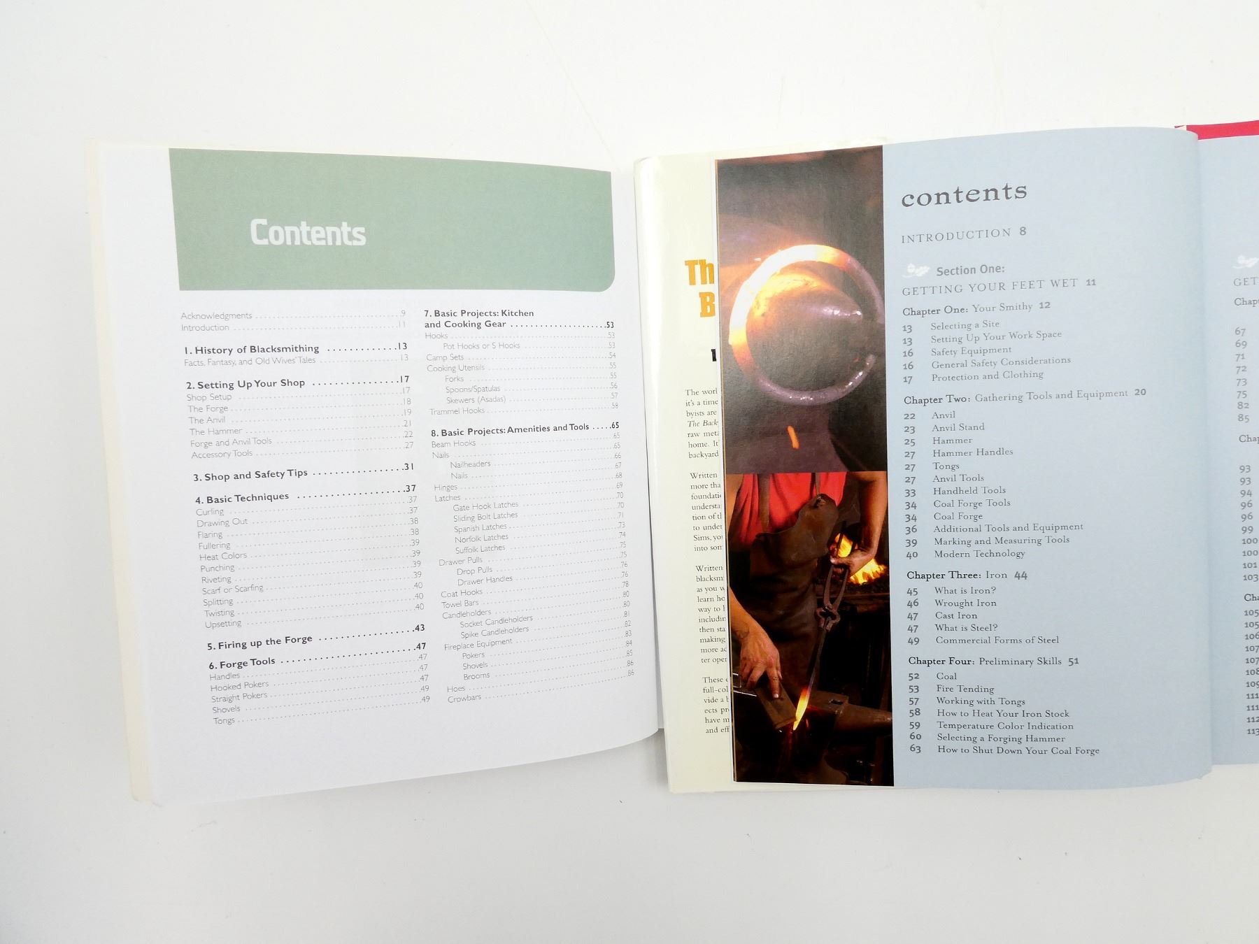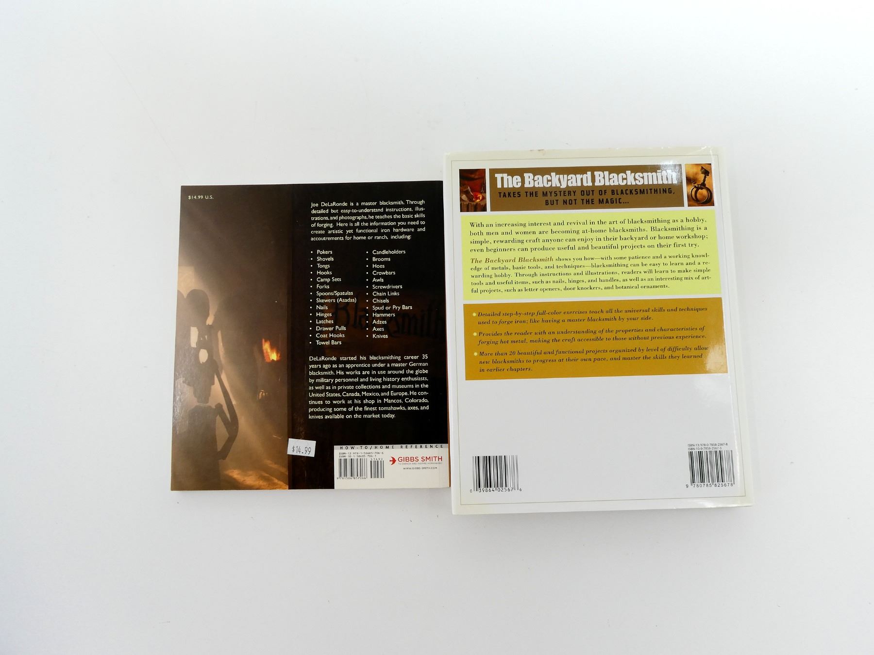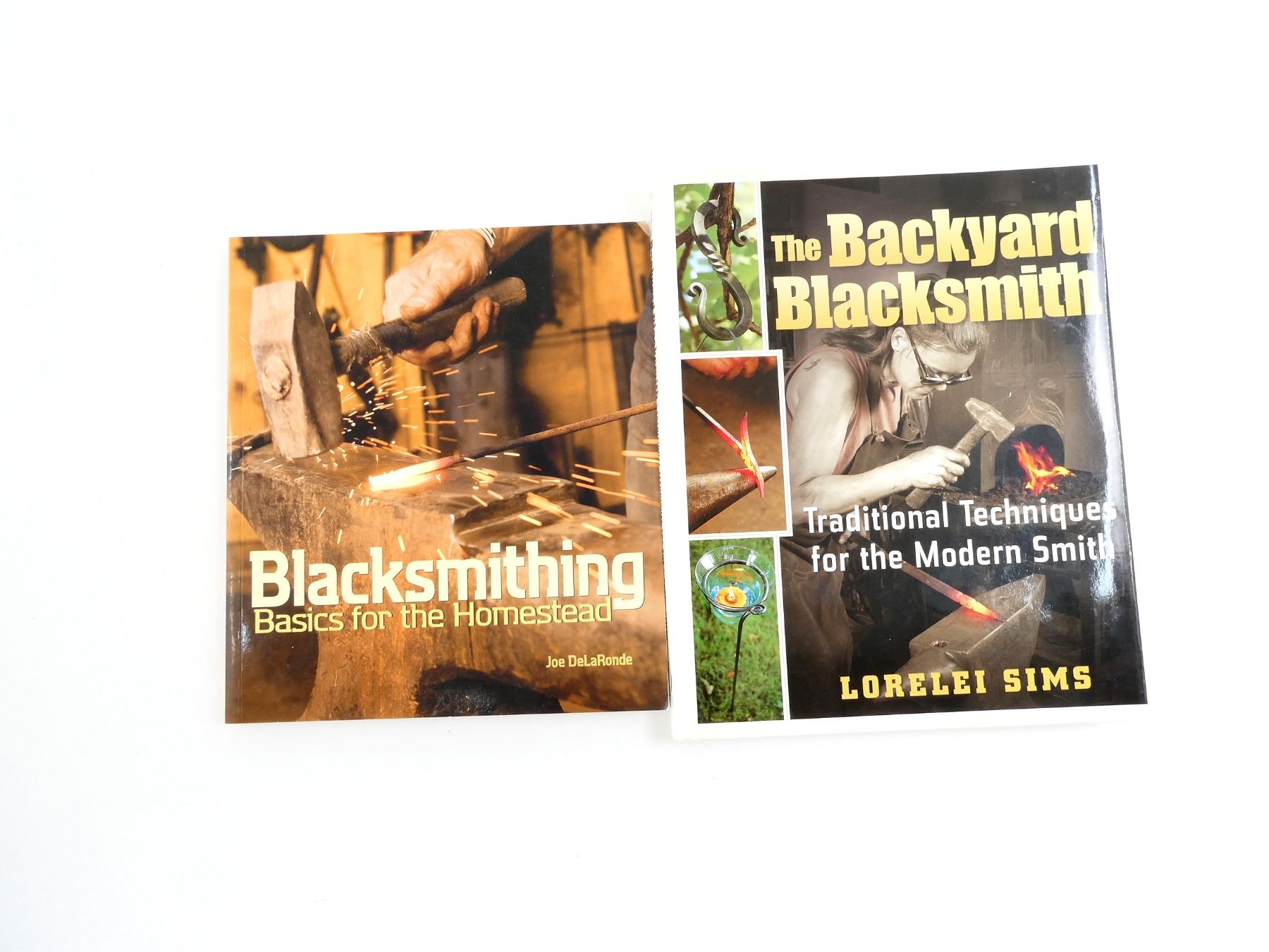 LOT INCLUDES; (1) "THE BACKYARD BLACKSMITH, TRADITIONAL TECHNIQUES FOR THE MODERN SMITH" BOOK BY LORELEI SIMS, HARD COVER WITH DUST COVER, ISBN: 978-0-7858-2567-8 & (1) "BLACKSMITHING BASICS FOR THE HOMESTEAD" BOOK BY JOE DELARONDE, SOFT COVER, ISBN: 978-1-58685-706-6. SEE PHOTOS.
