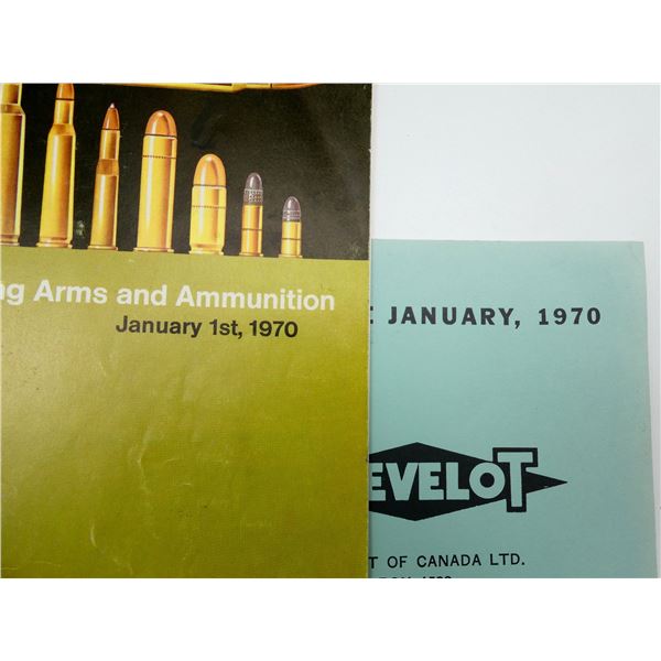SOFT COVERS, LOT INCLUDES; (1) "DOMINION AMMUNITION CATALOGUE NO. 15" BY DOMINION CARTRIDGE CO. LIMITED, COPYRIGHT 1989, (1) "GEVELOT 1970 DISTRIBUTOR PRICES" BROCHURE, (1) "GEVELOT OF CANADA LIMITED, SASKATOON, SASKATCHEWAN" CATALOGUE, (1) "C-I-L AMMUNITION & FIREARMS" CATALOGUE & (1) "C-I-L SPORTING ARMS & AMMUNITION" CATALOGUE DATED 1970. SEE PHOTOS.