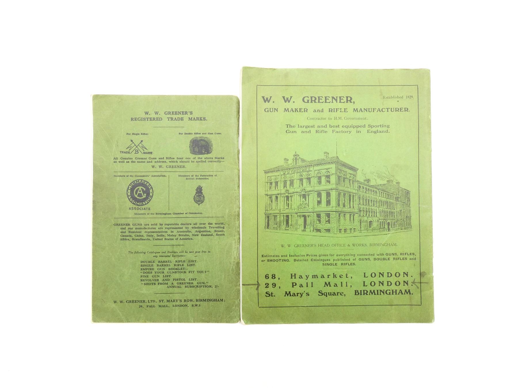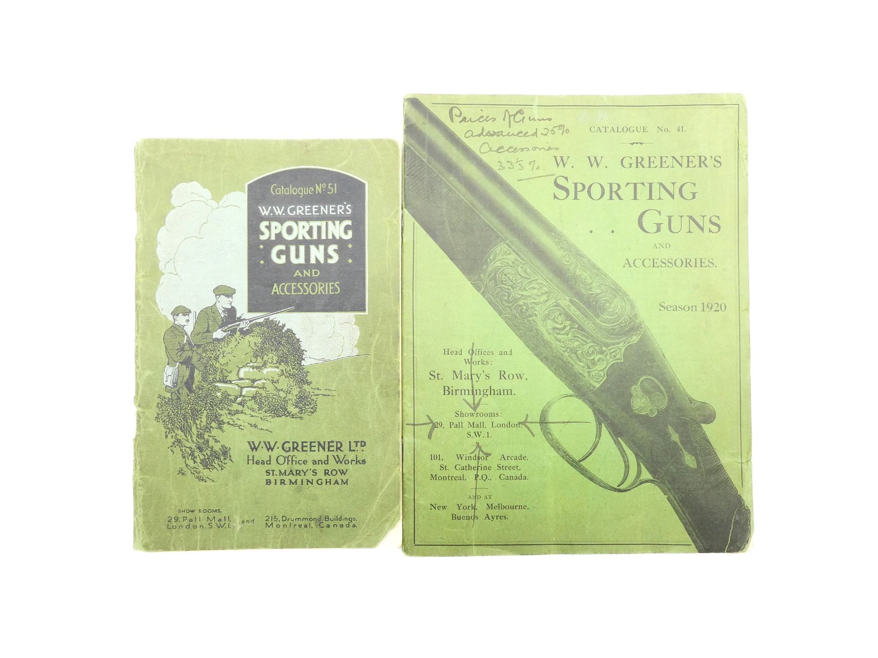SOFT COVERS, LOT INCLUDES; (1) "W.W. GREENER'S SPORTING GUNS AND ACCESSORIES NO. 41" CATALOGUE, DATED 1920 & (1) "W.W. GREENER'S SPORTING GUNS AND ACCESSORIES NO. 51" CATALOGUE. SEE PHOTOS.