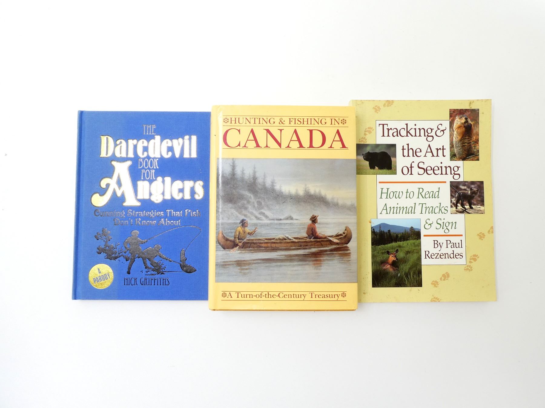 LOT INCLUDES; (1) "TRACKING & THE ART OF SEEING, HOW TO READ ANIMAL TRACKS & SIGN" BOOK BY PAUL REZENDES, SOFT COVER, ISBN: 0-944475-29-9, (1) "THE DAREDEVIL BOOK FOR ANGLERS, CUNNING STRATEGIES THAT FISH DON'T KNOW ABOUT" BOOK BY NICK GRIFFITHS, HARD COVER, ISBN: 978-1-84837-546-8 & (1) "HUNTING & FISHING IN CANADA" BOOK EDITED BY FRANK OPPEL, HARD COVER WITH DUST COVER, ISBN: 1-55521-355-3. SEE PHOTOS.