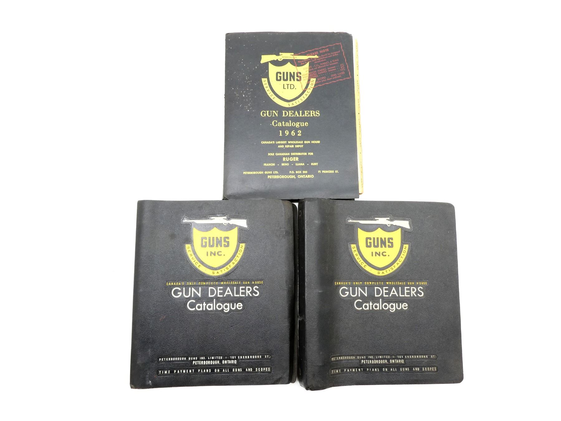 SOFT COVER BINDERS, LOT INCLUDES; (3) "GUN DEALERS CATALOGUE" CATALOGUES BY GUNS INC., DATED 1958, 1960 AND 1962. SEE PHOTOS.