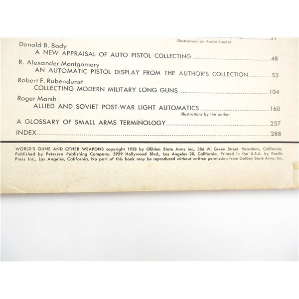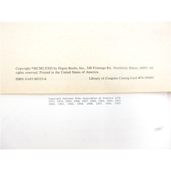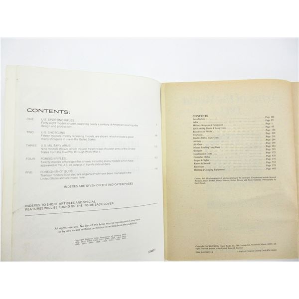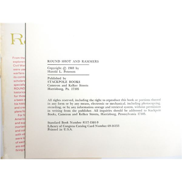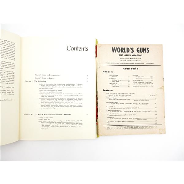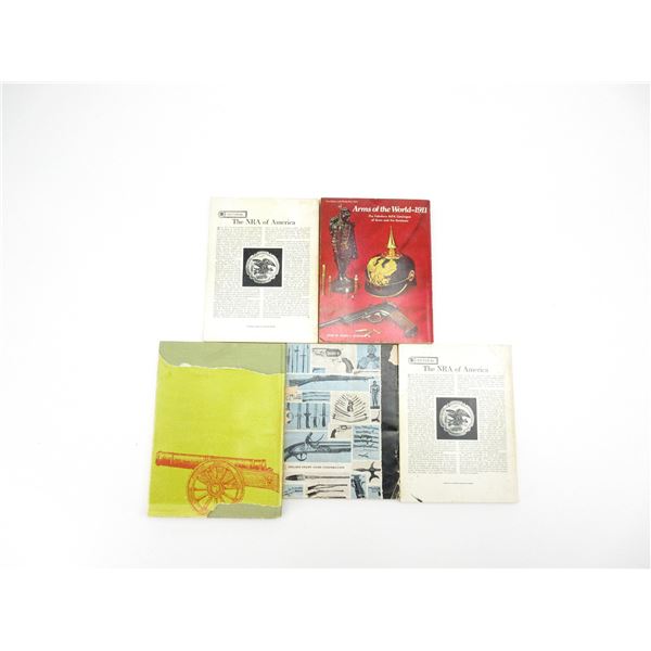 LOT INCLUDES; (1) "ROUND SHOT AND RAMMERS" BOOK BY HAROLD L. PETERSON, HARD COVER WITH DUST COVER, SBN: 8117-1501-9, (1) "GOLDEN STATE ARMS WORLD'S GUNS AND OTHER WEAPONS" BOOK EDITOR-IN-CHIEF PHILIP MCFARLAND, SOFT COVER, COPYRIGHT 1958, (1) "ARMS OF THE WORLD-1911" BOOK EDITED BY JOSEPH J. SCHROEDER, JR, SOFT COVER, ISBN: 0-695-80333-6, (1) "FIREARMS ASSEMBLY I: THE NRA GUIDEBOOK TO SHOULDER ARMS" BOOK BY NATIONAL RIFLE ASSOCIATION, SOFT COVER, COPYRIGHT 1972, & (1) "FIREARMS ASSEMBLY II: THE NRA GUIDEBOOK TO HANDGUNS" BOOK BY NATIONAL RIFLE ASSOCIATION, SOFT COVER, COPYRIGHT 1972. SEE PHOTOS.