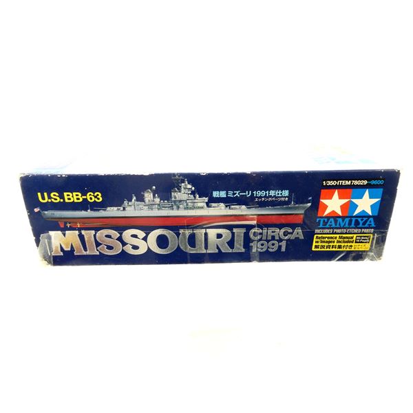 (1) U.S. BATTLESHIP BB-63 MISSOURI MODEL KIT CIRCA 1991, 1/350TH SCALE BATTLESHIP IN ORIGINAL PACKAGING WITH INSTRUCTION MANUAL, APPEARS NOS, MAY NOT BE COMPLETE / PIECES MAY BE MISSING, LENGTH APPROX. 30.5" BEAM APPROX. 3.7". SEE PHOTOS.