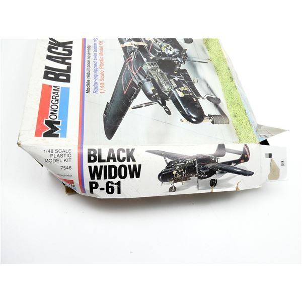 (1) BLACK WIDOW P-61 MODEL KIT, RADAR-EQUIPPED TWIN BOOM NIGHT FIGHTER, 1/48 SCALE IN ORIGINAL PACKAGING WITH INSTRUCTION MANUAL, APPEARS NOS, MAY NOT BE COMPLETE / PIECES MAY BE MISSING. SEE PHOTOS.