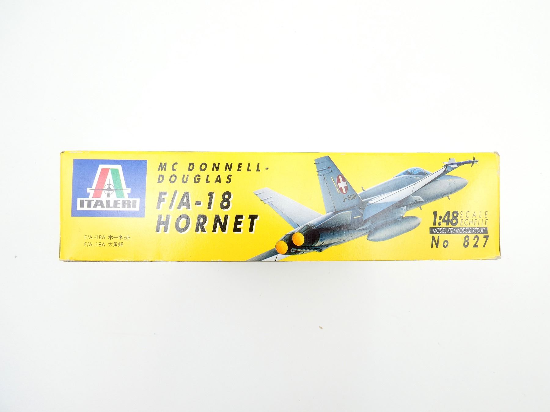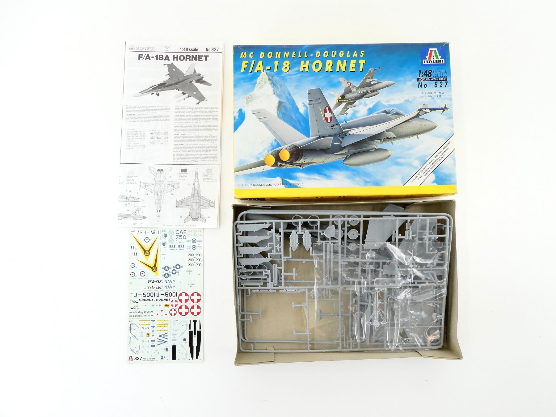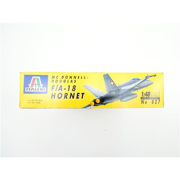 (1) MCDONNELL-DOUGLAS F/A-18 HORNET MODEL KIT, NO. 827, 1:48 SCALE IN ORIGINAL PACKAGING WITH INSTRUCTION MANUAL, DECALS FOR U.S. NAVY, CANADA, AUSTRALIA INCLUDED, APPEARS NOS, MAY NOT BE COMPLETE / PIECES MAY BE MISSING. SEE PHOTOS.