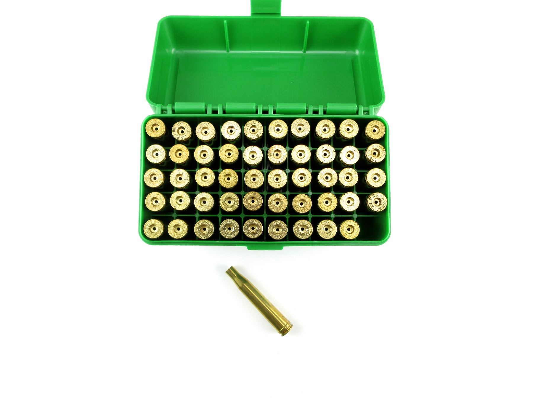 LOT INCLUDES; APPROX. (50) NEW NON-PRIMED BRASS CASES, (1) MTM CASE-GARD R-50 MAGNUM RIFLE PLASTIC AMMO BOX.