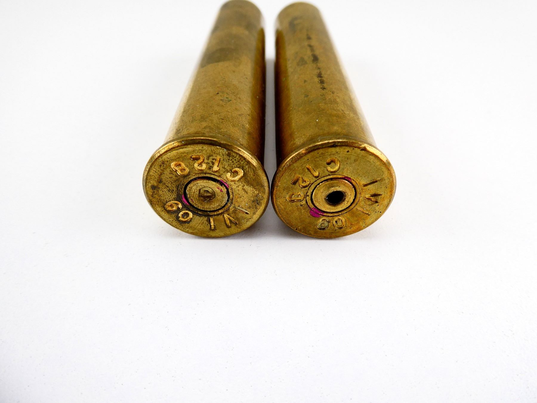LOT INCLUDES; (2) NON-PRIMED BRASS CASES, MARKED IVI 60 C128, APPROX. OAL 3 7/8", CONSIGNOR STATES; "USED WITH ADAPTOR IN ARTILLERY CASING AS SALUTATORY ROUND".