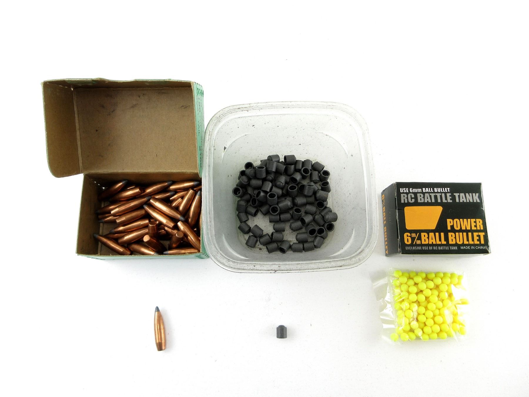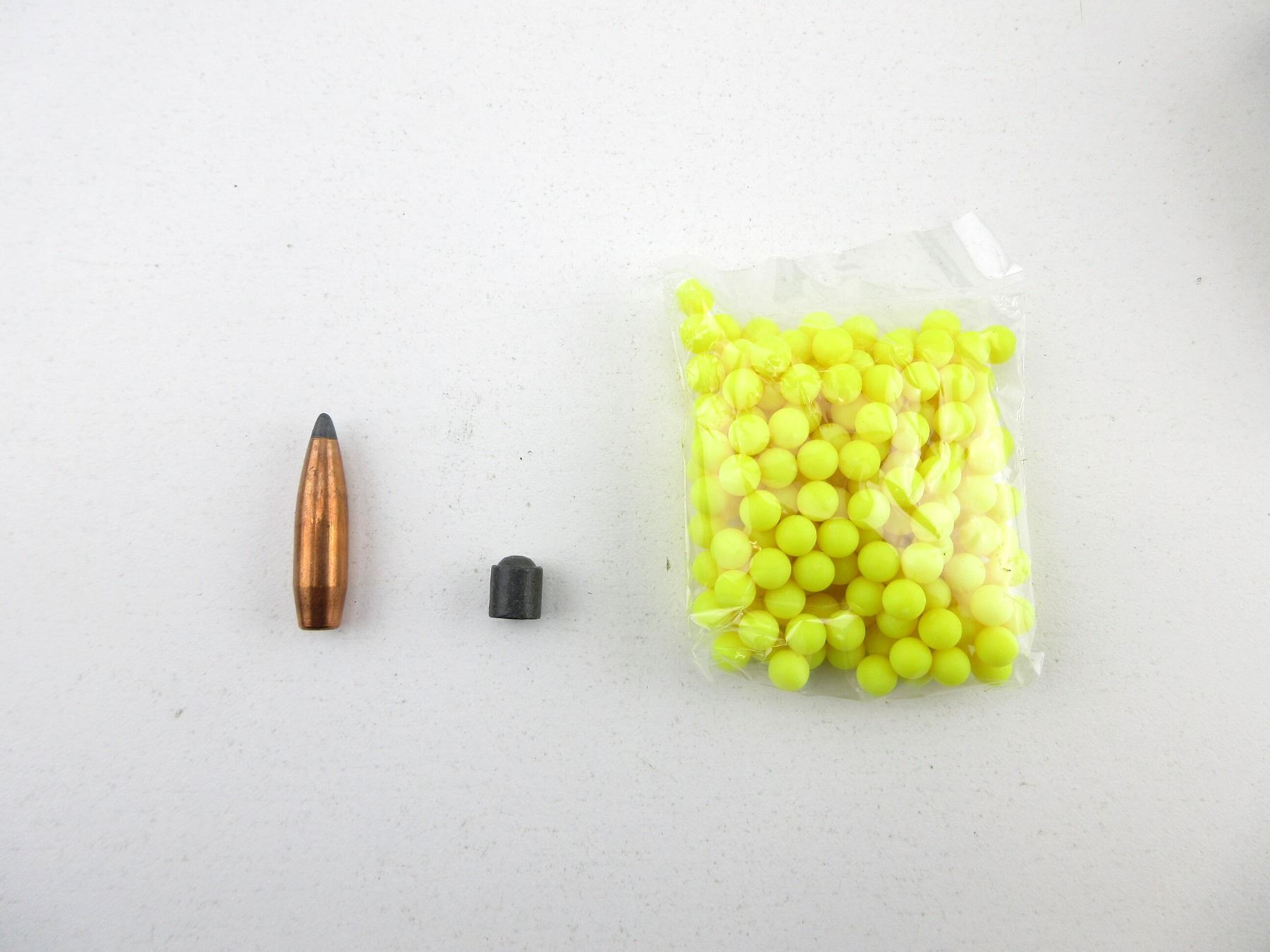 LOT INCLUDES; APPROX. (128) BULLETS, APPROX. DIA .308", VARIOUS MANUFACTURERS, APPROX. (150) 6MM RC BATTLE TANK POWER BALL BULLETS.
