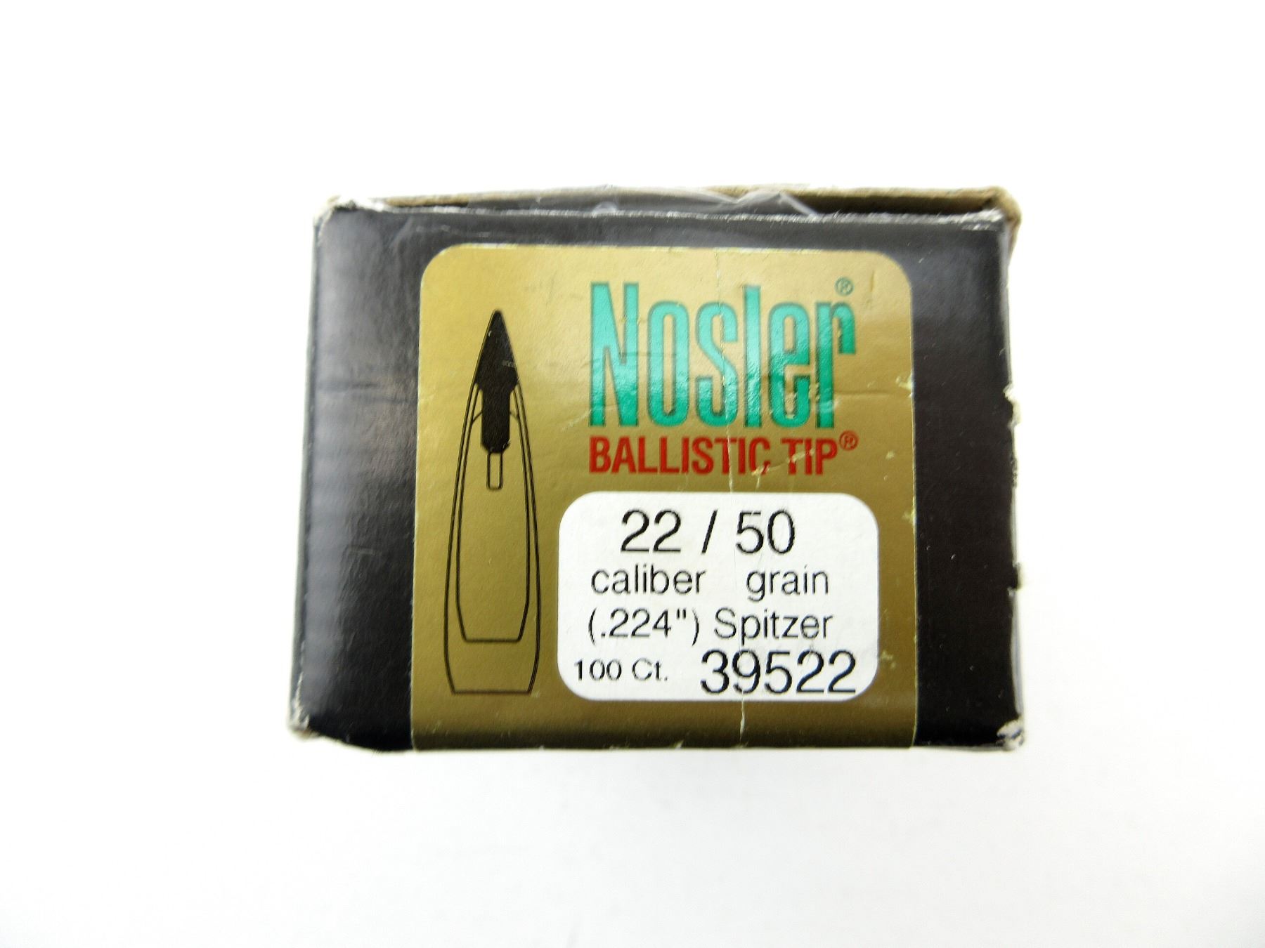 LOT INCLUDES; APPROX. (124) BULLETS, APPROX. DIA .224" & .309", VARIOUS MANUFACTURERS INCLUDING; NOSLER 50 GRNS (STATED ON BOX NOT CONFIRMED) SPITZER & UNKNOWN .30 CALBER LEAD BULLETS WITH GAS CHECKS.