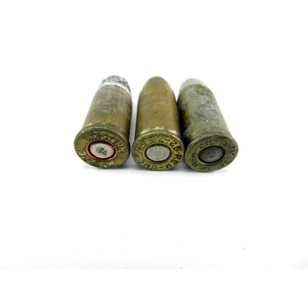 LOT INCLUDES; APPROX. (50) RNDS, VARIOUS MANUFACTURERS INCLUDING; WRA, REM-UMC, ETC., (1) RND HAS BEEN STRUCK, IN COLLECTIBLE BOX, SHOWS SOME WEAR, SEE PHOTOS.