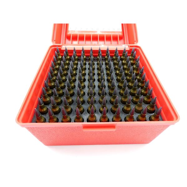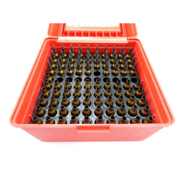 LOT INCLUDES; APPROX. (139) RNDS, (51) NON-PRIMED BRASS CASES, (2) MTM CASE-GARD R 100 PLASTIC AMMO BOXES.
