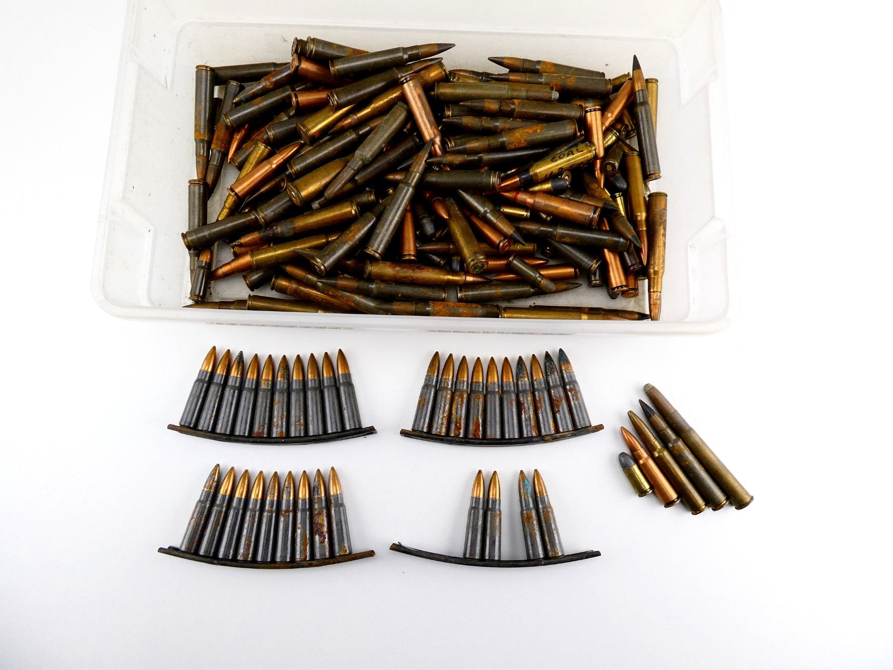 LOT INCLUDES; APPROX. (242) RNDS, VARIOUS CALIBERS INCLUDING; 9MM LUGER, 7.62X39MM, 7.62X25MM, .303 BR, 7MM MAUSER, ETC., SOME CORROSION, (4) STRIPPER CLIPS.