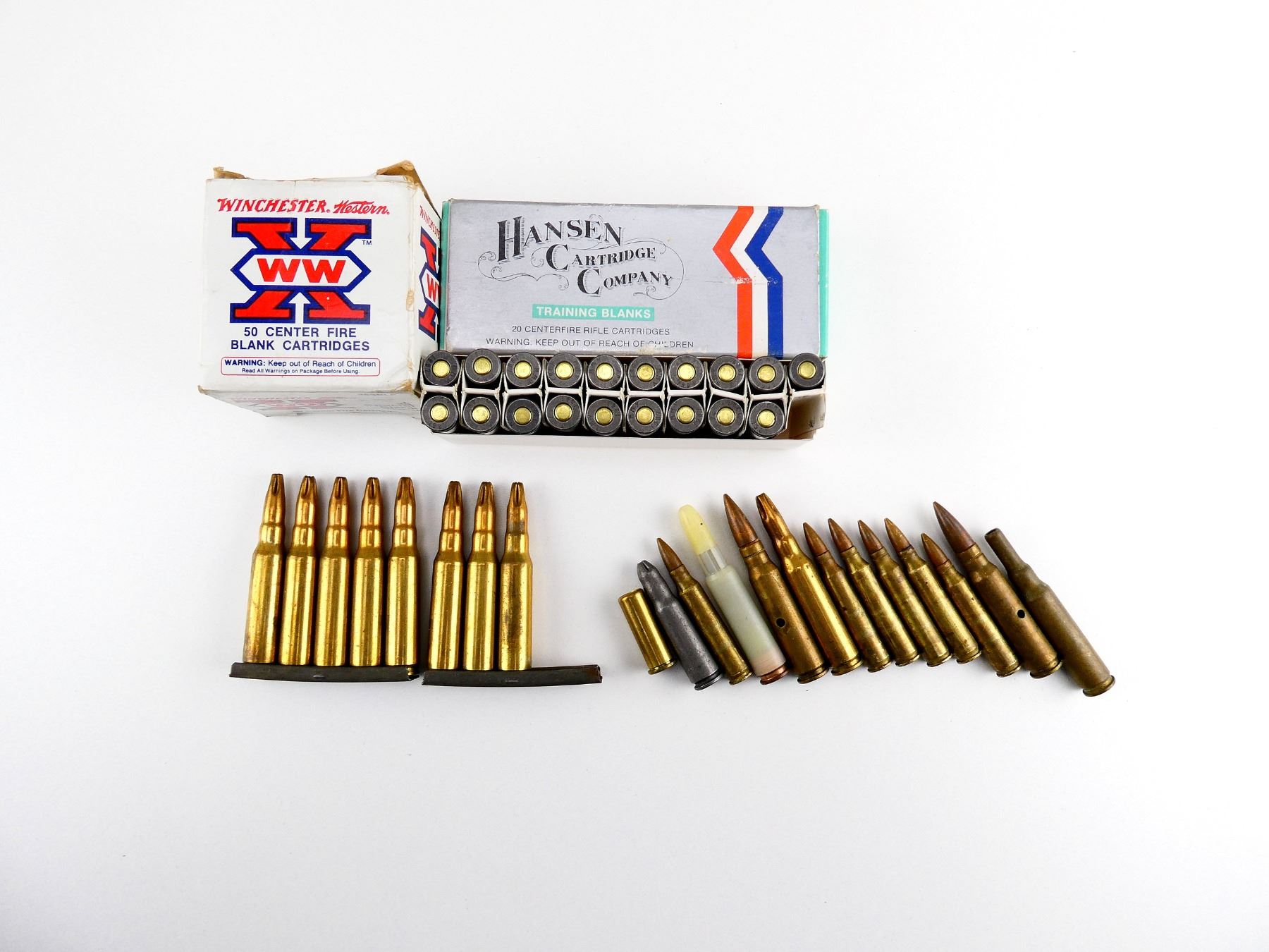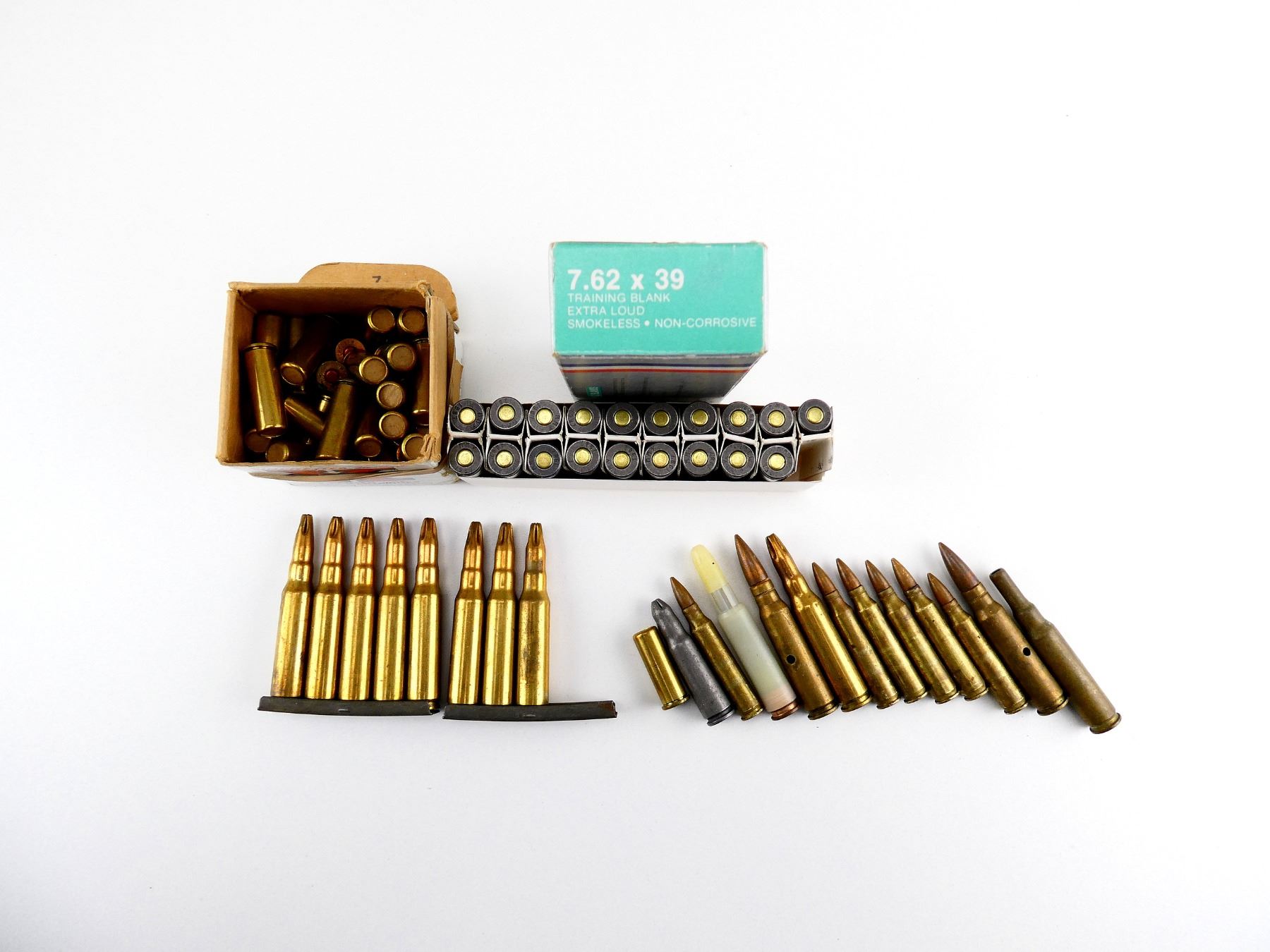 LOT INCLUDES; APPROX. (81) BLANKS, VARIOUS CALIBERS INCLUDING .38 SPL, 7.62X39MM, 7.62X51MM, ETC., (8) DUMMY RNDS, (2) STRIPPER CLIPS.