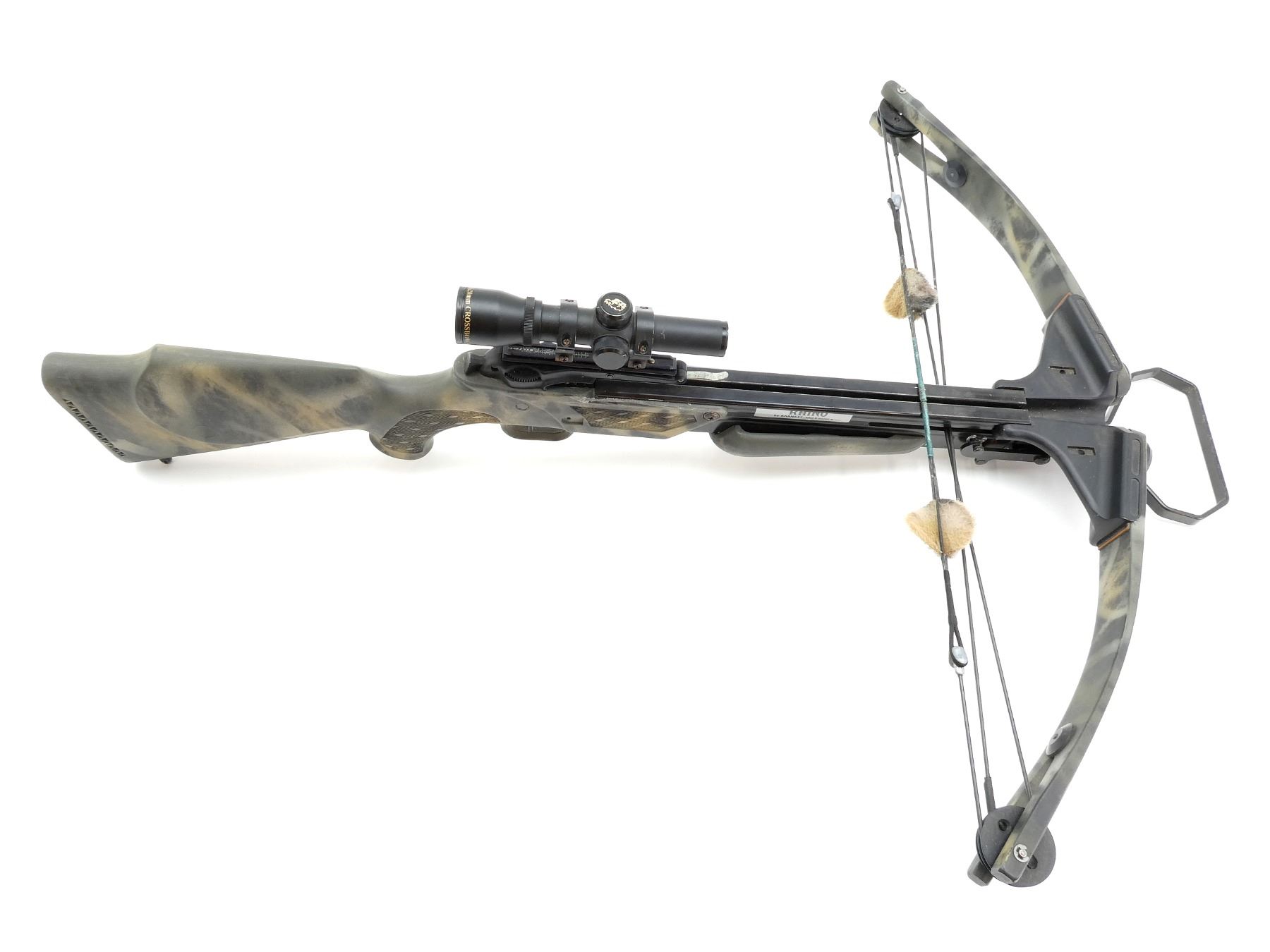 LOT INCLUDES; (1) COMPOUND CROSS BOW, UNKNOWN SPEED OR DRAW WEIGHT, (1) BARNETT RHINO 2.5X20MM CROSSBOW SCOPE, CLEAR OPTICS, (1) STRING, APPROX. OAL36", SHOWS WEAR AND TEAR FROM USAGE, SEE PHOTOS.