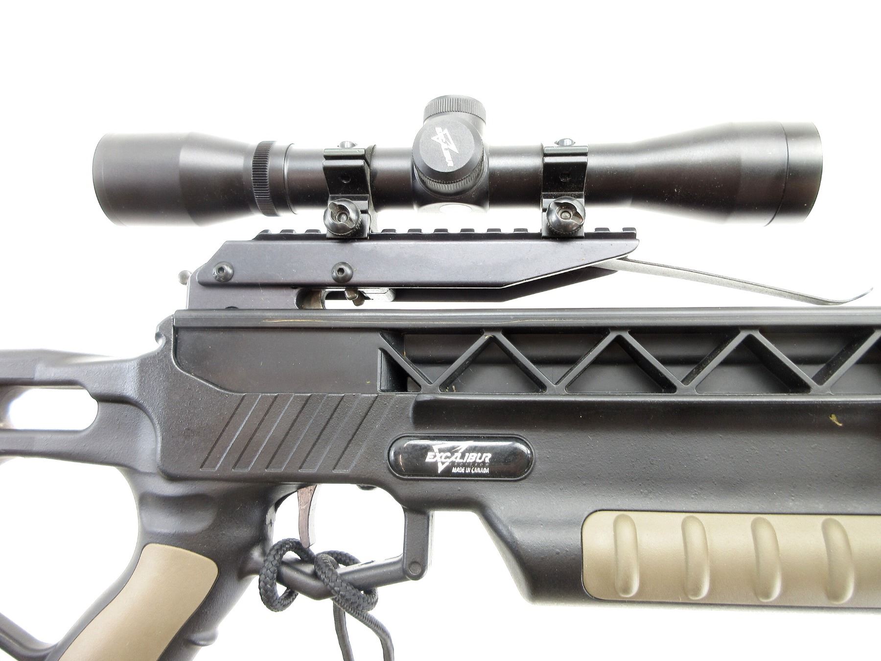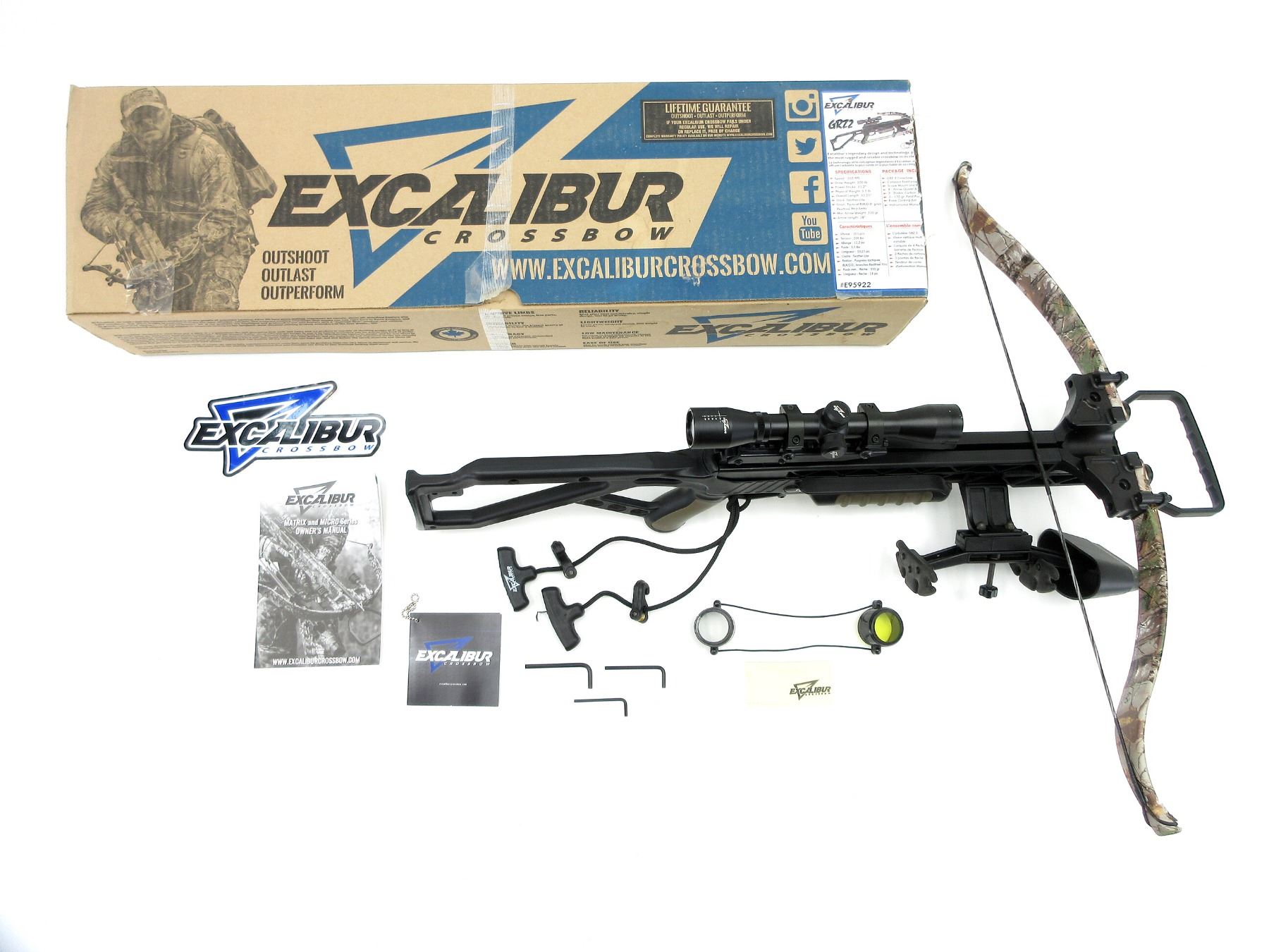 LOT INCLUDES; (1) RECURVE CROSSBOW, APPROX. DRAW WEIGHT 200 LBS, APPROX. SPEED UP TO 305 FPS, POWER STROKE 11.2", ARROW LENGTH 18", (1) EXCALIBUR FIXED POWER SCOPE, CLEAR OPTICS, (1) LENS COVERS, (4) BOLT QUIVER, (1) STRING, (1) COCKING AID, APPROX. OAL 33 1/4", (1) FACTORY BOX, (1) INSTRUCTIONAL MANUAL, SHOWS WEAR AND TEAR FROM USAGE, SEE PHOTOS.