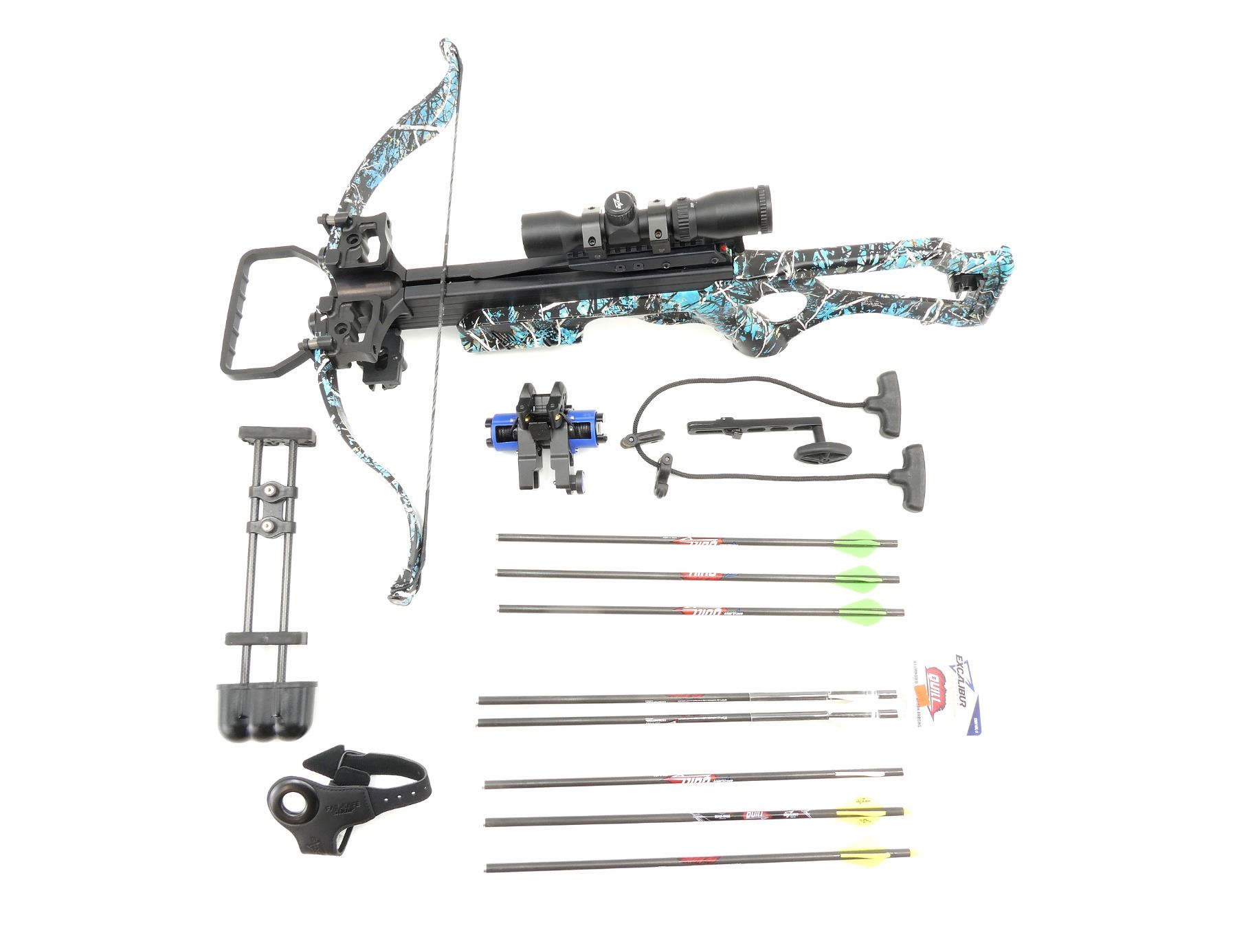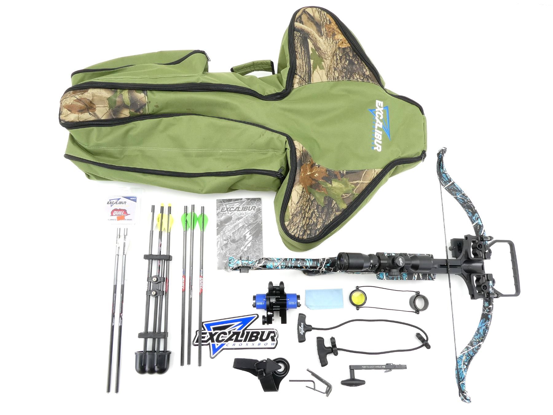 LOT INCLUDES; (1) RECURVE CROSSBOW, APPROX. DRAW WEIGHT 254 LBS, APPROX. SPEED UP TO 308 FPS, LENGTH PULL 12.5", ARROW LENGTH 17", (1) EXCALIBUR DEAD ZONE SCOPE, CLEAR OPTICS, (1) LENS COVERS, (3) BOLT QUIVER, (8) BOLTS, (1) STRING, (1) COCKING AID, (1) CHARGER EXT COCKING CRANK, APPROX. OAL 31", (1) EXCALIBUR SOFT PADDED BOW CASE, CARRY HANDLE, SHOULDER STRAP, (2) ZIPPERED OUTSIDE POCKETS, (1) INSTRUCTIONAL MANUALS, SHOWS WEAR AND TEAR FROM USAGE, SEE PHOTOS.