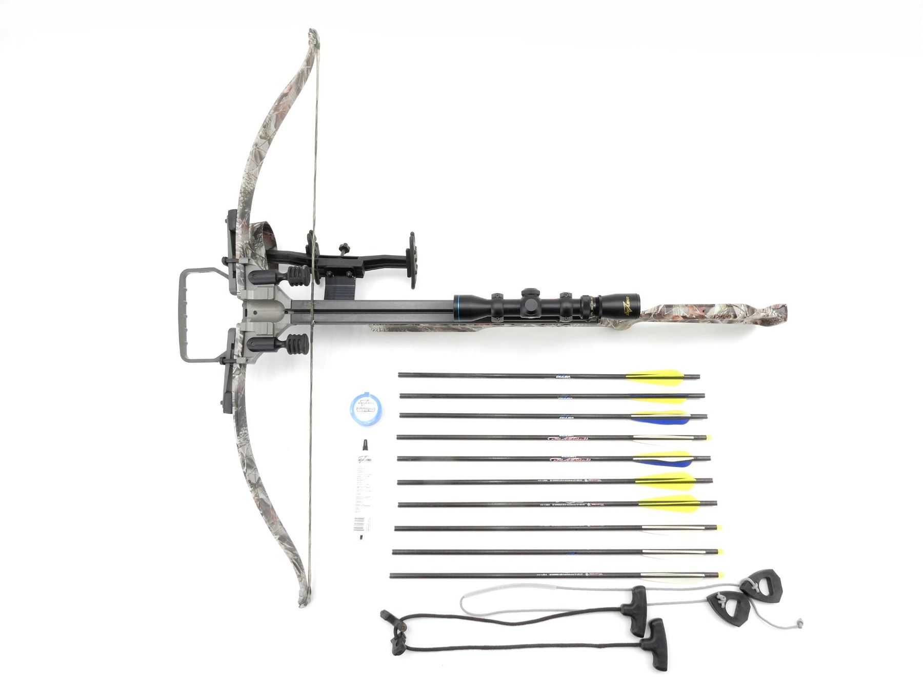 LOT INCLUDES; (1) RECURVE CROSSBOW, APPROX. DRAW WEIGHT 200 LBS, APPROX. SPEED UP TO 320 FPS, STROKE 15.5", ARROW LENGTH 20", (6) EXCALIBUR 20" BOLTS, (1) EXCALIBUR VARI ZONE SCOPE, CLEAR OPTICS, (1) LENS COVERS, (4) BOLT QUIVER, (4) BOLTS, (1) COCKING AID, (1) STRINGING AID, (1) STRING, (1) INSTRUCTIONAL MANUAL, (1) DVD, (1) SERVING WAX, (1) EX RAIL LUBE, ASSORTED ALLEN KEYS, APPROX 6 1/2 LBS, APPROX. OAL 38 1/2", SHOWS WEAR AND TEAR FROM USAGE, SEE PHOTOS.