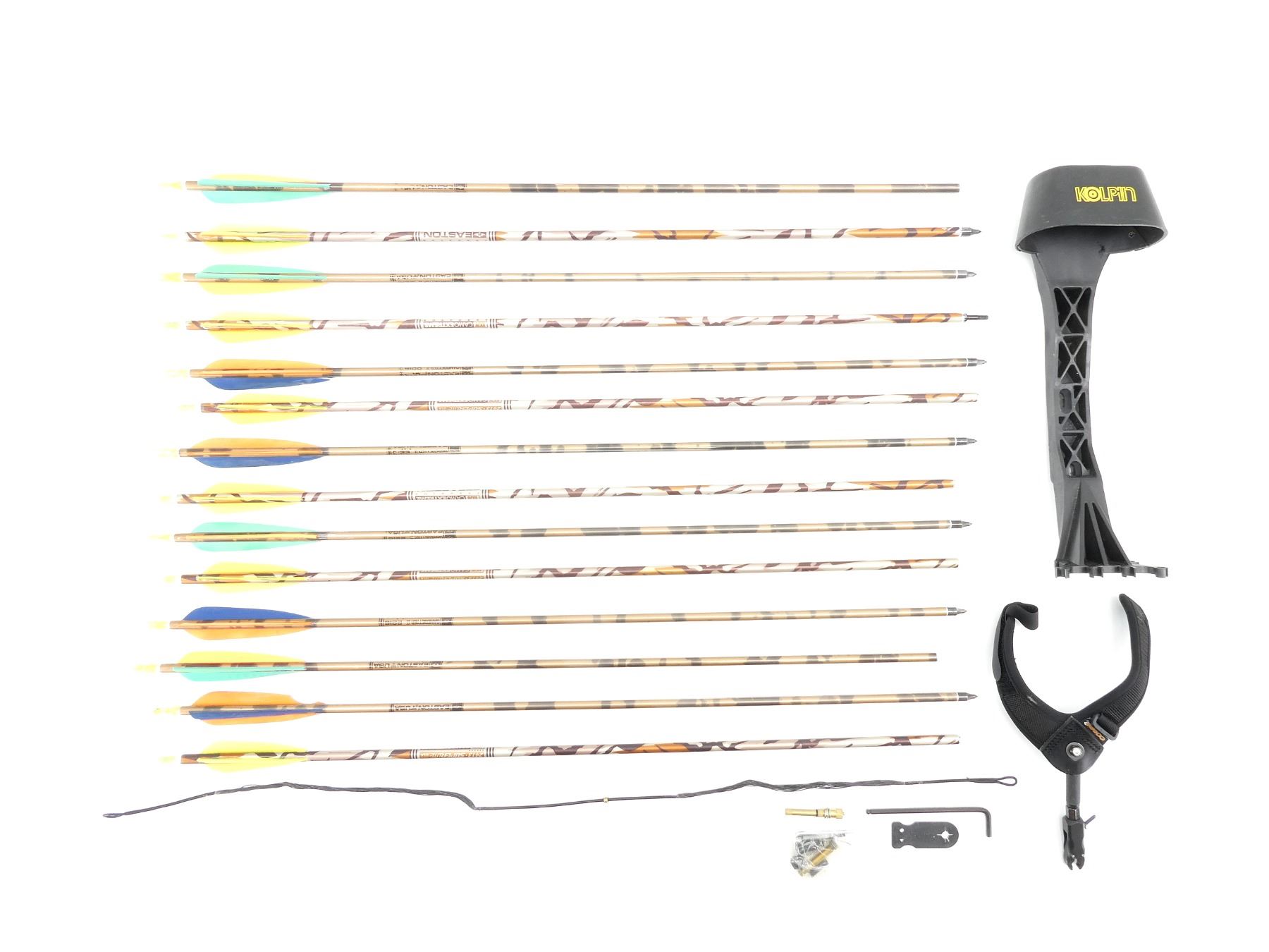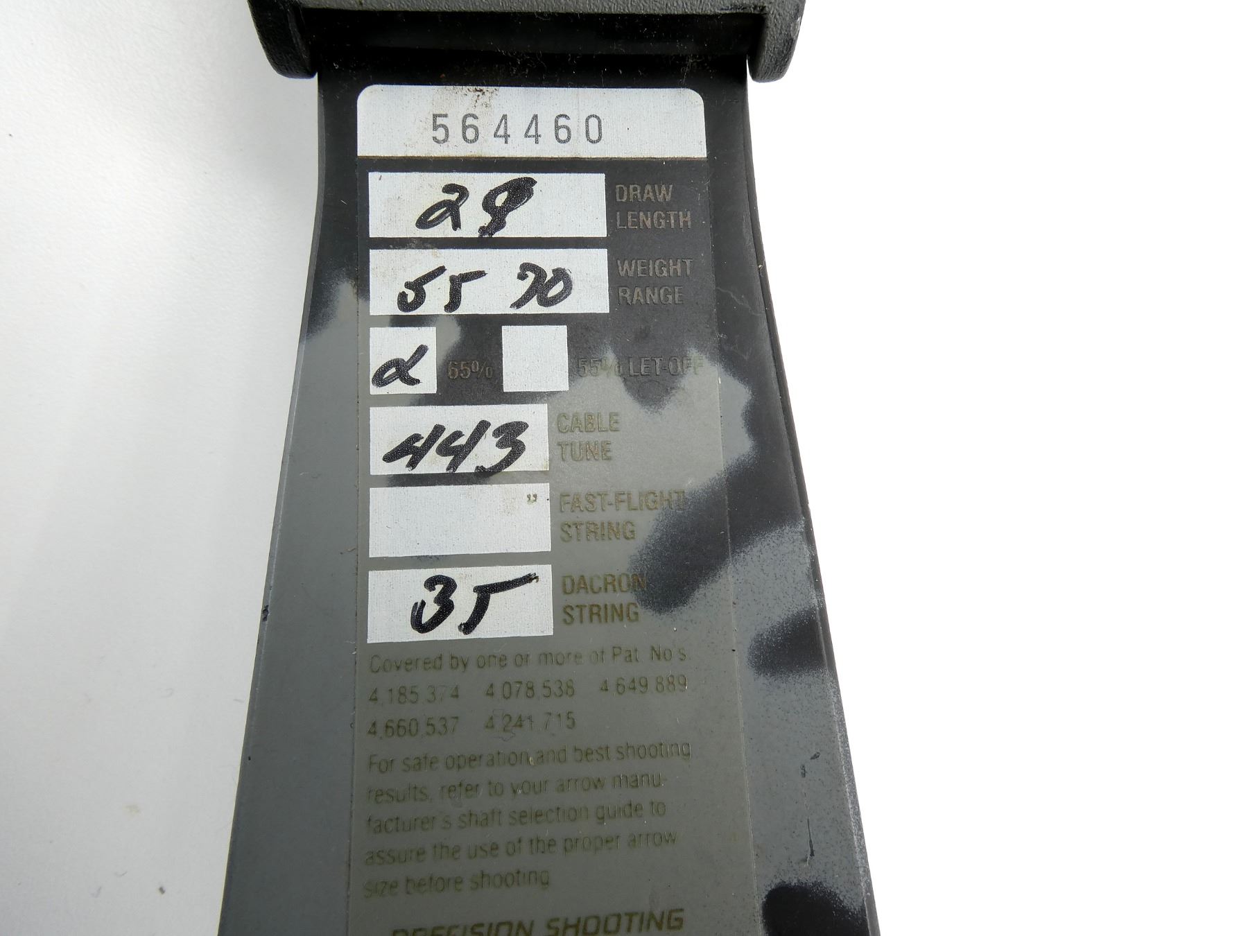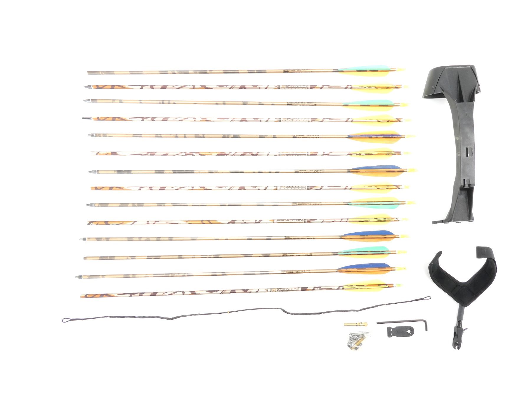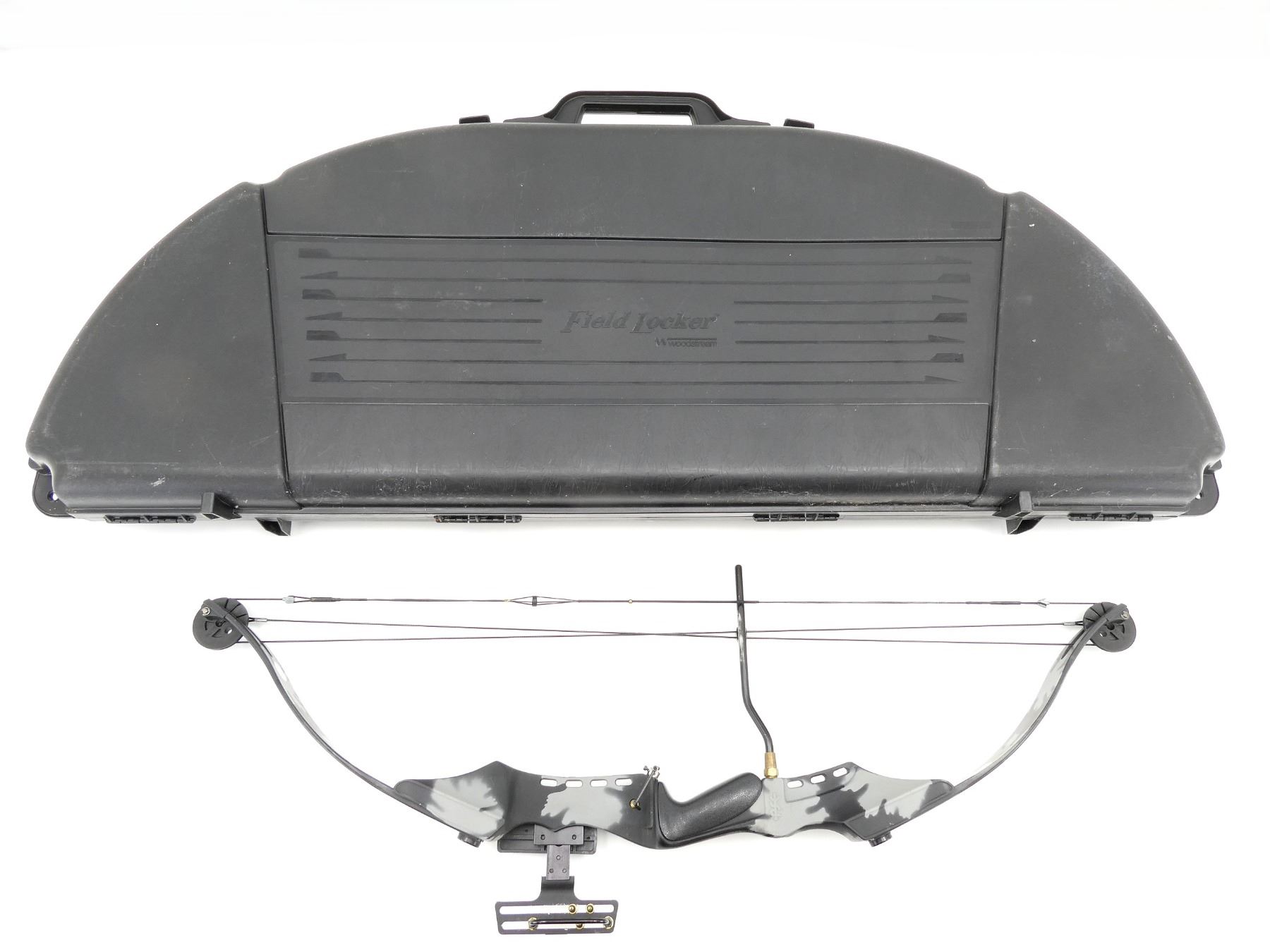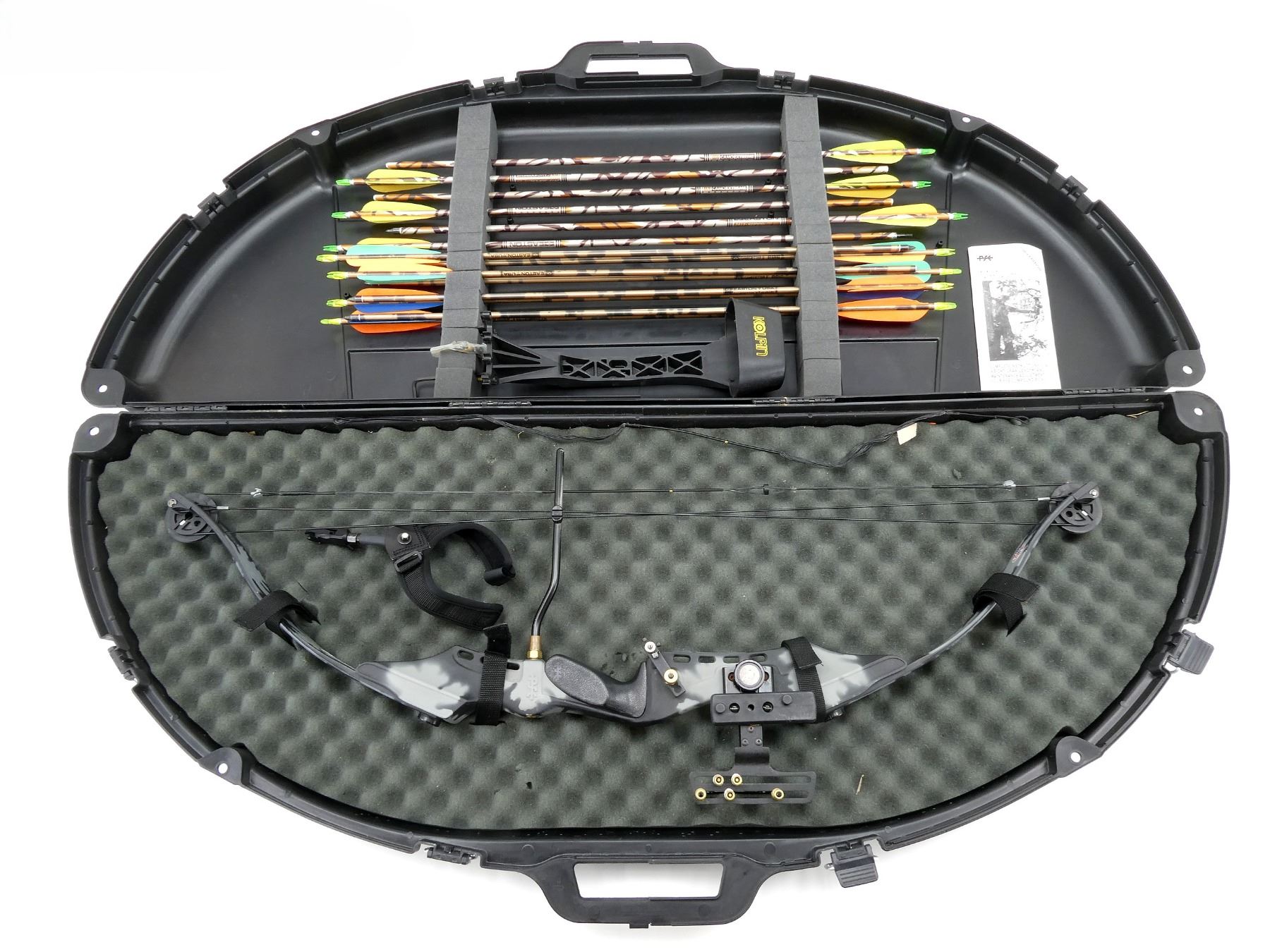 LOT INCLUDES; (1) RH COMPOUND BOW, MARKED; WEIGHT RANGE 55-70, CABLE TUNE 443, DARCON STRING 35, (3) PIN SIGHTS, (1) KOLPIN (6) ARROW QUIVER, (1) COBRA STRING RELEASE, (2) STRINGS, (14) ASSORTED29" ALUMINUM ARROWS, (7) ASSORTED FIELD TIPS, APPROX OAL OF BOW 42 1/4", SHOWS WEAR AND TEAR FROM USAGE, SEE PHOTOS. (1) OWNERS MANUAL, (1) WOODSTREAM PADDED BOW CASE, CARRY HANDLE, (4) LATCHES, (4) VELCRO STRAPS INSIDE, APPROX OAL 52", SHOWS WEAR AND TEAR FROM USAGE, SEE PHOTOS.