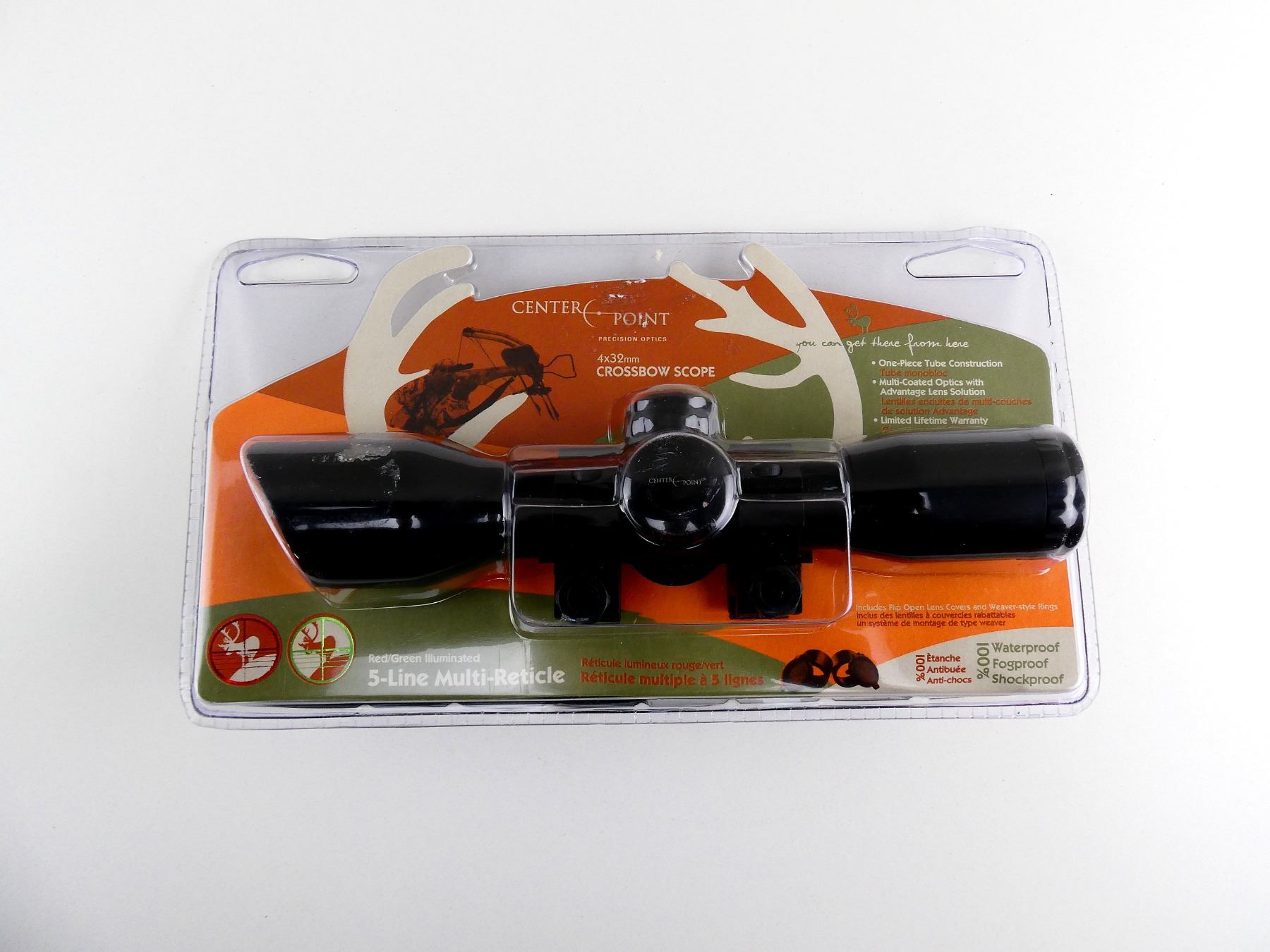 LOT INCLUDES; (1) CENTER POINT 4X32MM CROSSBOW SCOPE, ONE-PIECE TUBE CONSTRUCTION, MULTI-COATED OPTICS WITH ADVANTAGE LENS SOLUTION, RED / GRENN ILLUMINATED 5-LINE MULTI-RETICLE, UNTESTED, WATERPROOF, FOG PROOF, SHOCKPROOF, FLIP OPEN LENS COVERS AND WEAVER-STYLE RINGS, 1' TUBE, APPROX OAL 8 1/4", UNOPENED, NOS, SEE PHOTOS.