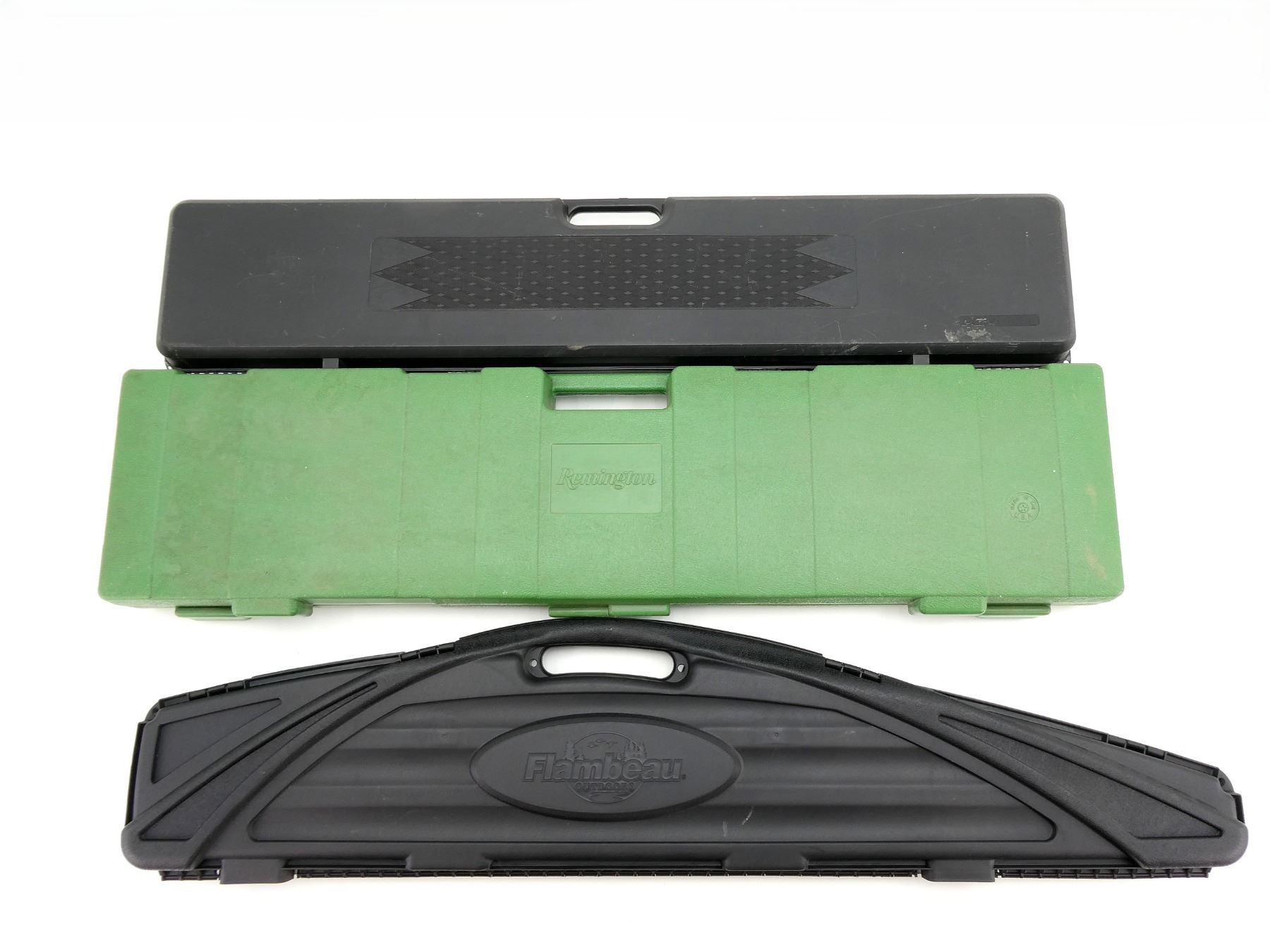 LOT INCLUDES;(2) BLACK HARD PADDED GUN CASES, CARRY HANDLE, (4) LATCHES EACH, (1) GREEN REMINGTON MOLDED GUN CASE, CARRY HANDLE, (4) LATCHES, APPROX OAL 47"-51", SHOWS WEAR AND TEAR FROM USAGE, SEE PHOTOS.