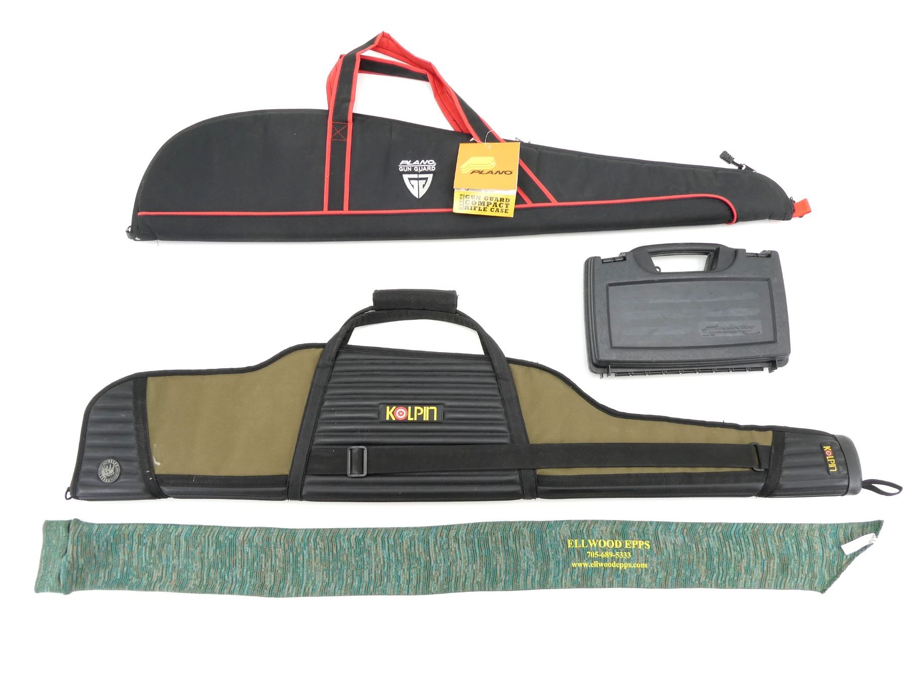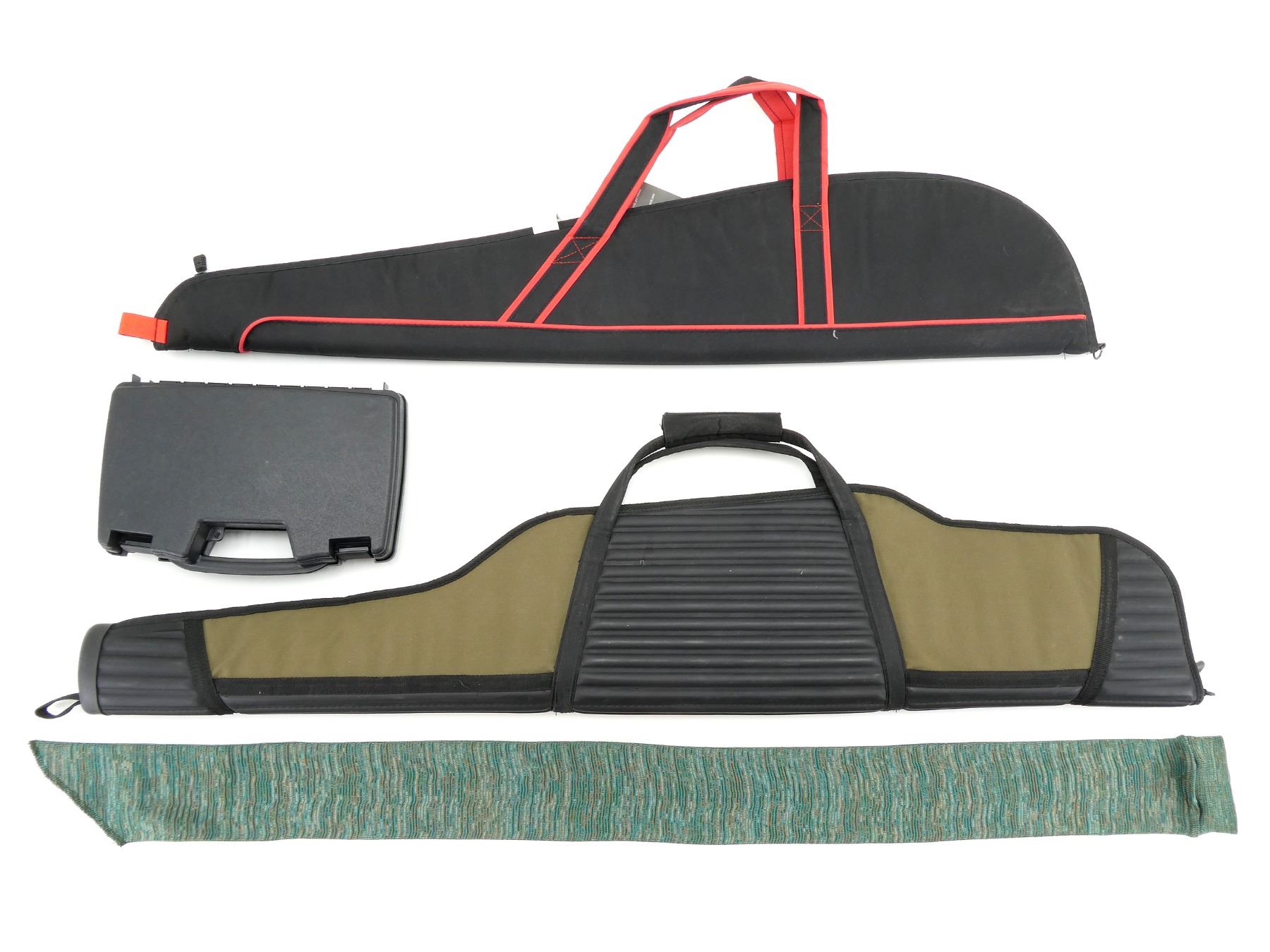 LOT INCLUDES; (2) SOFT PADDED GUN CASES, CARRY HANDLES, ZIPPERED, (1) HAS A SHOULDER STARP, (1) HARD PADDED HAND GUN CASE, CARRY HANDLE, (2) LATCHES, (1) GUN SOCK, APPROX. OAL 12"-52", (1) APPEARS NOS, SHOWS WEAR AND TEAR FROM USAGE, SEE PHOTOS.