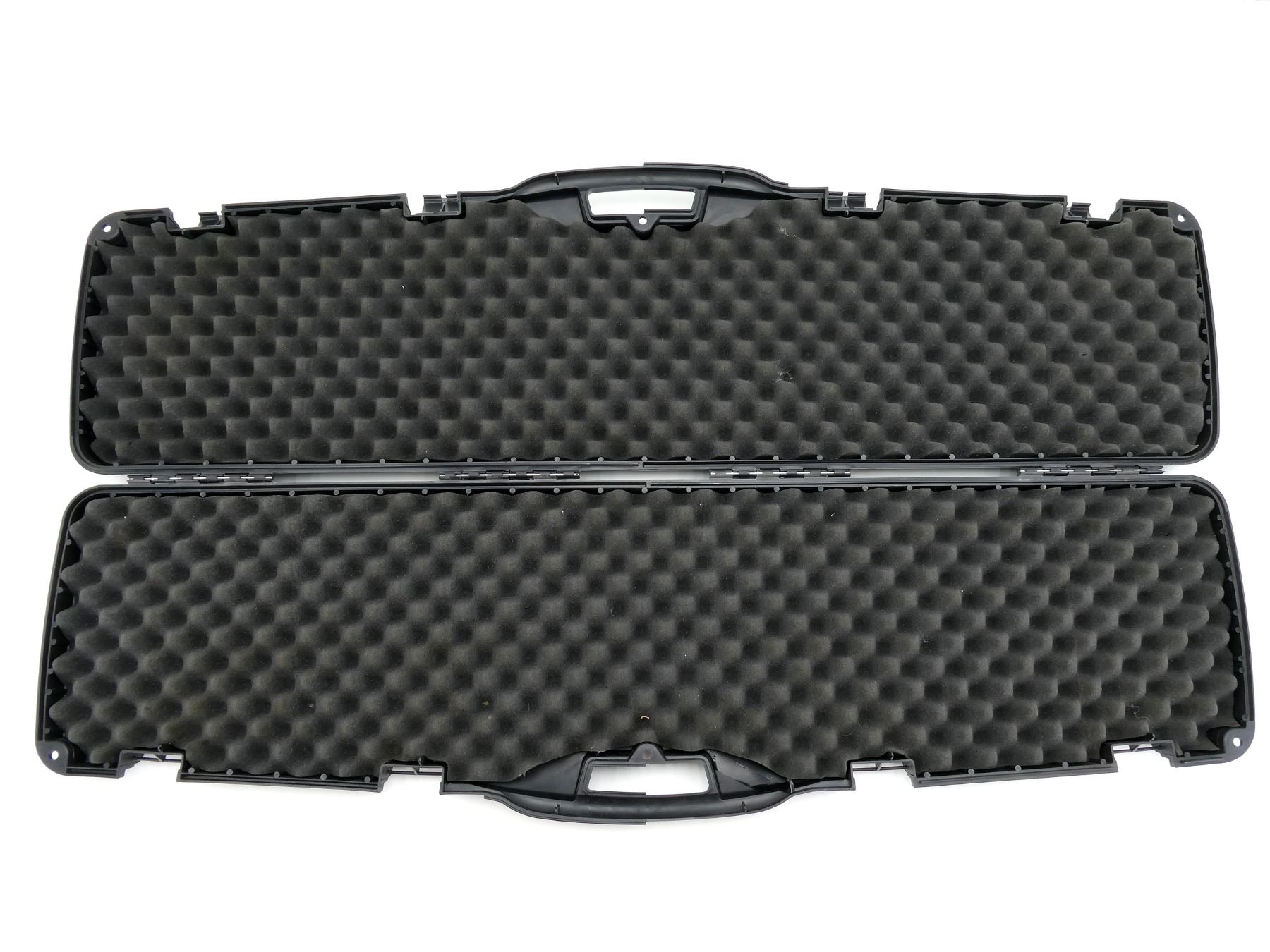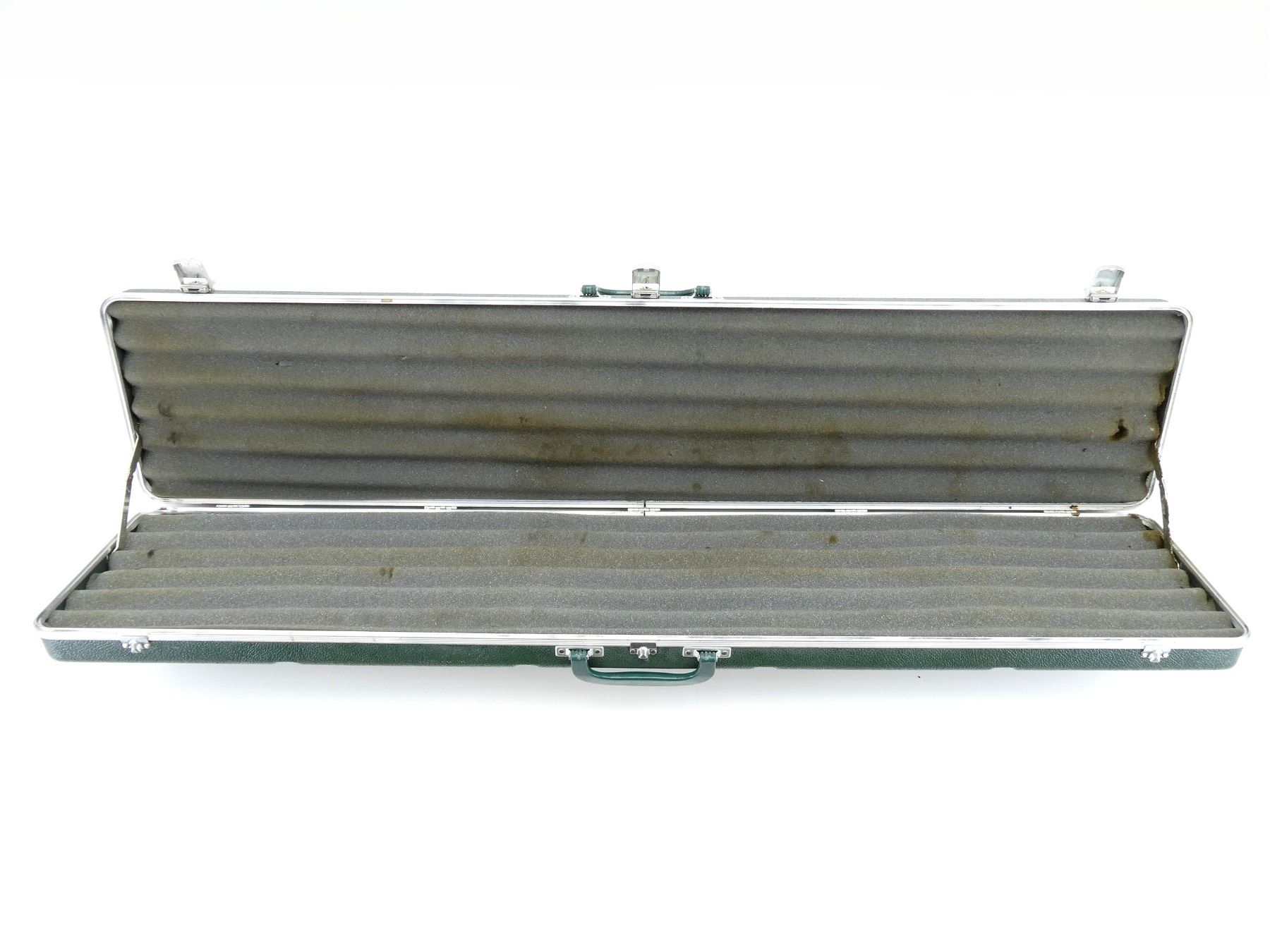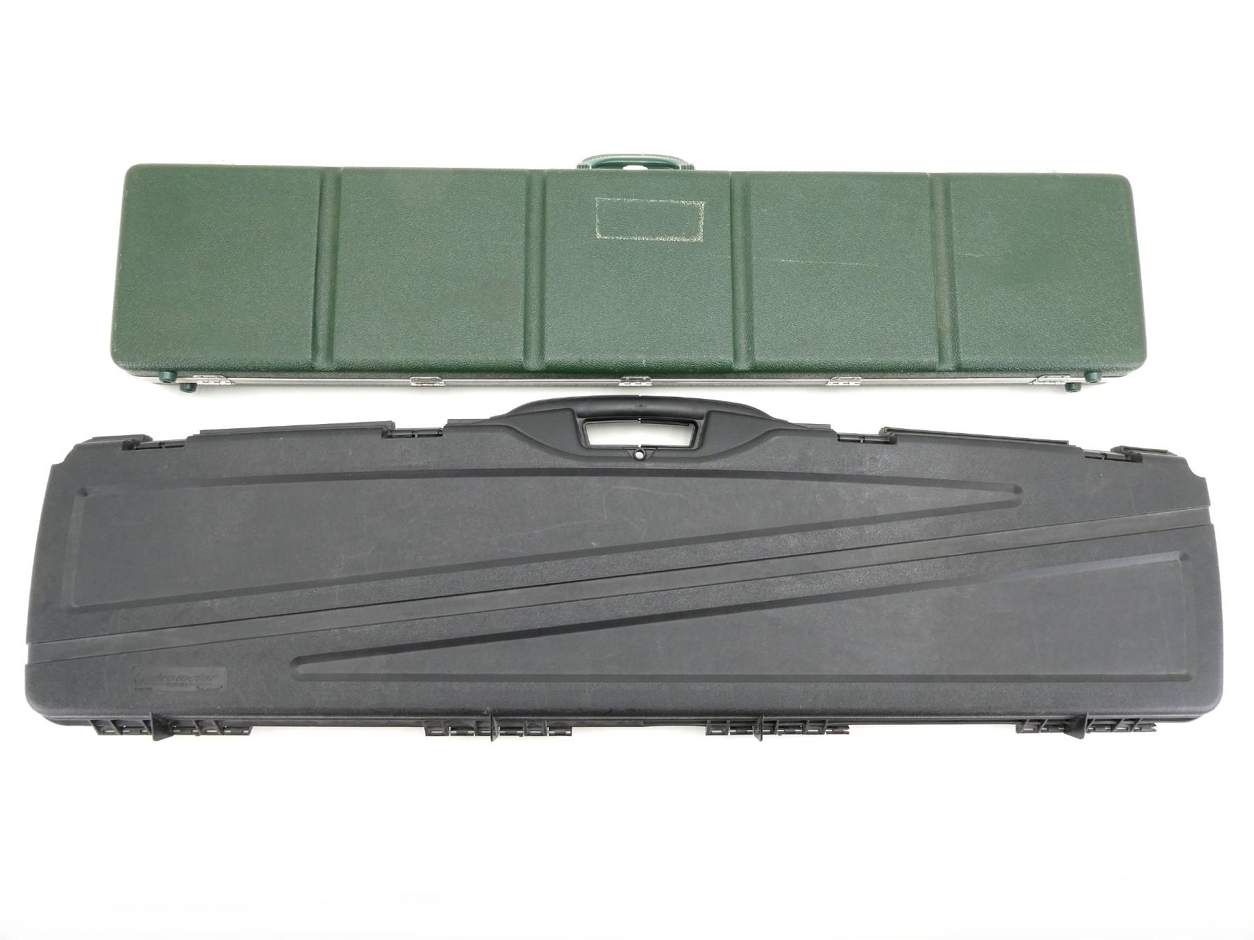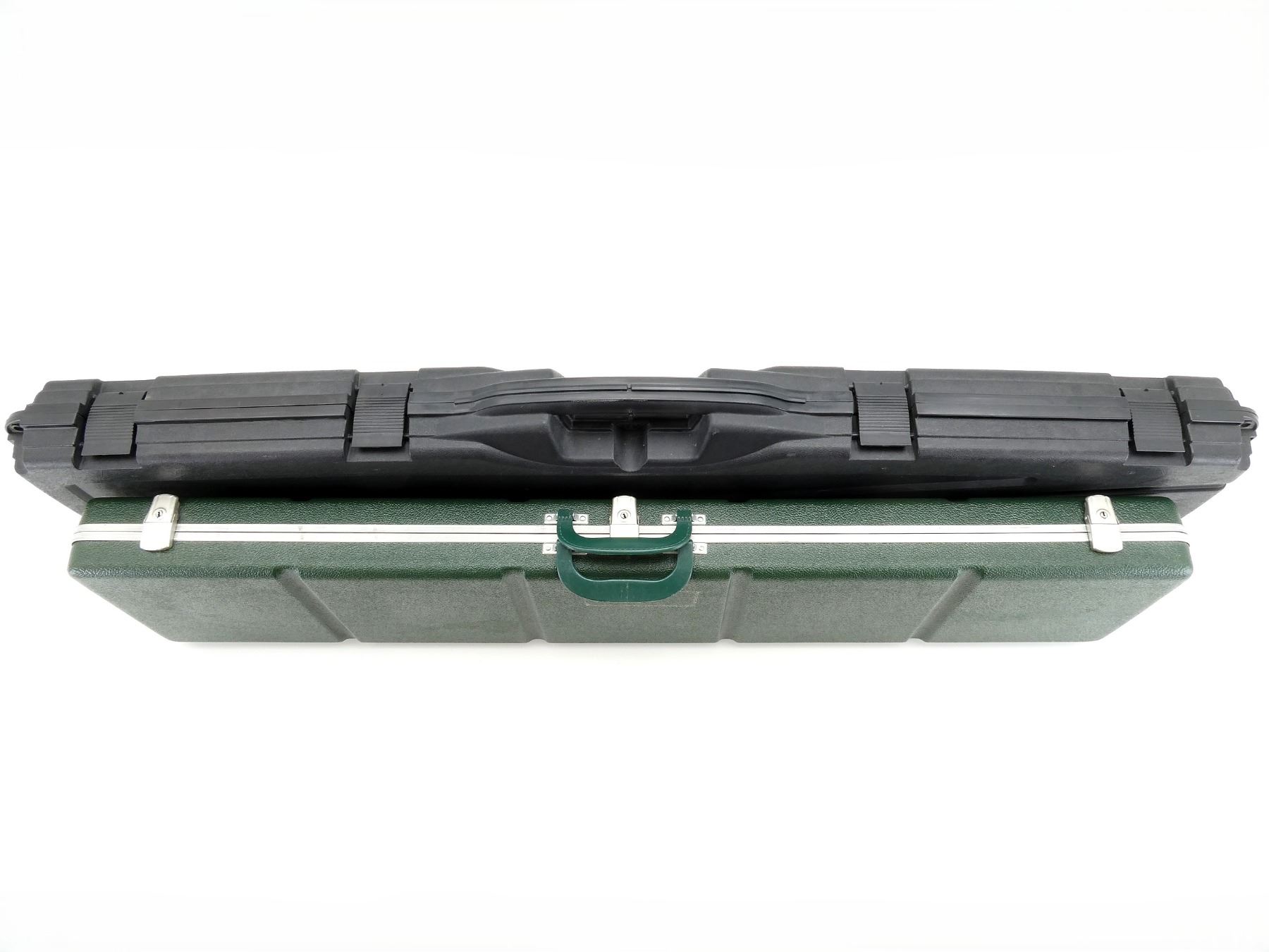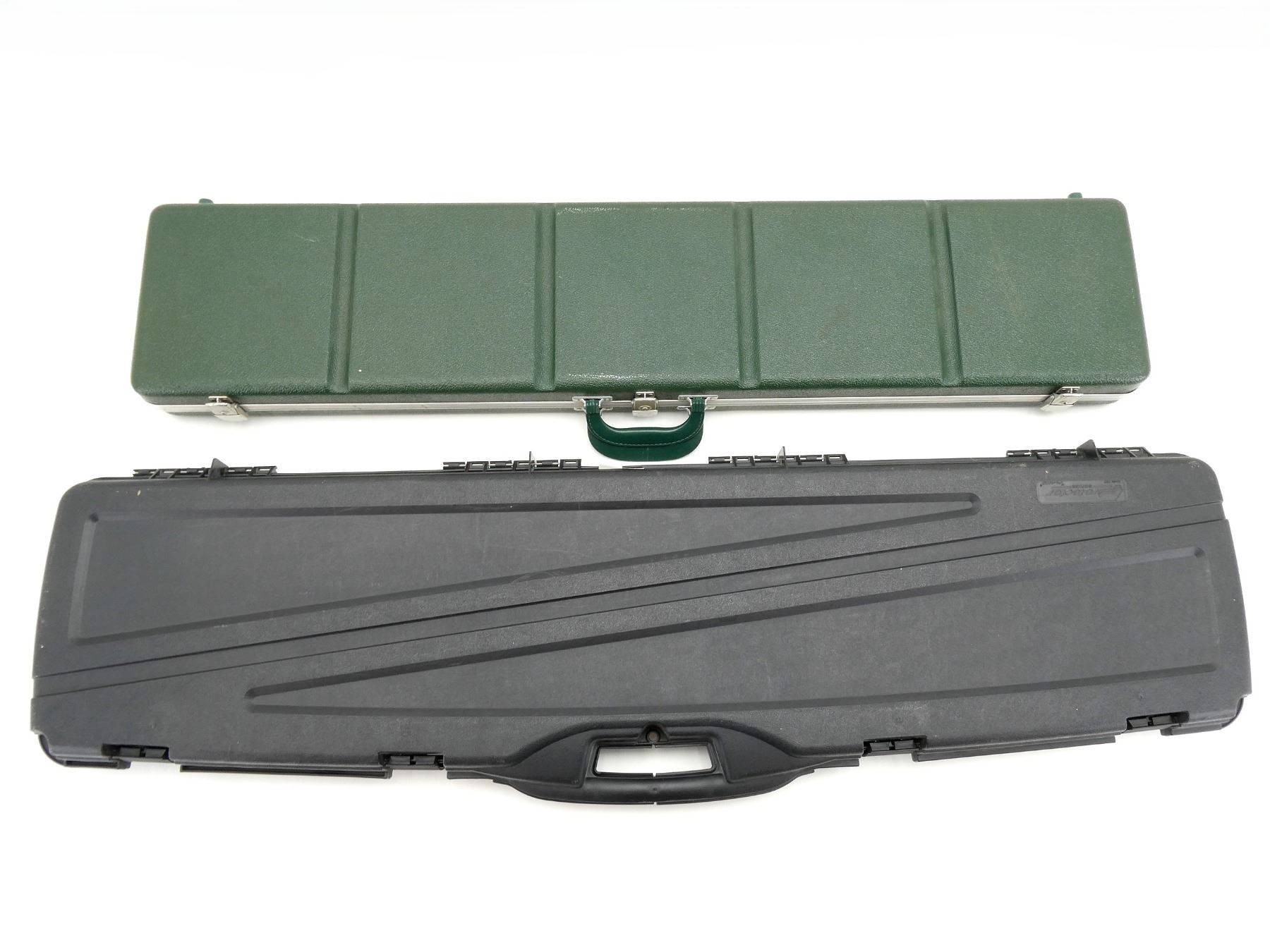 LOT INCLUDES; (1) BLACK HARD PADDED GUN CASE, CARRY HANDLE, (4) LATCHES, (1) GREEN HARD PADDED GUN CASE, CARRY HANDLE, (3) LOCKING LATCHES NO KEYS, APPROX. OAL 45"-49", SHOWS WEAR AND TEAR FROM USAGE, SEE PHOTOS.